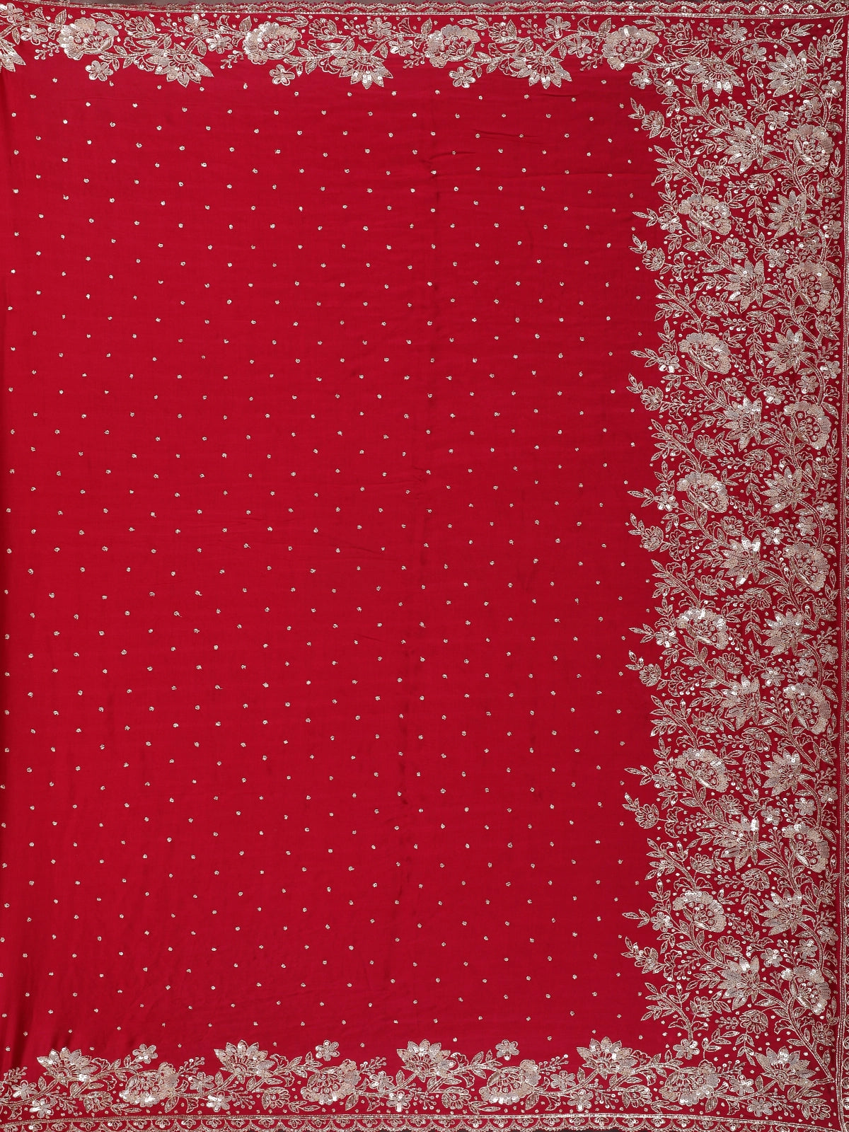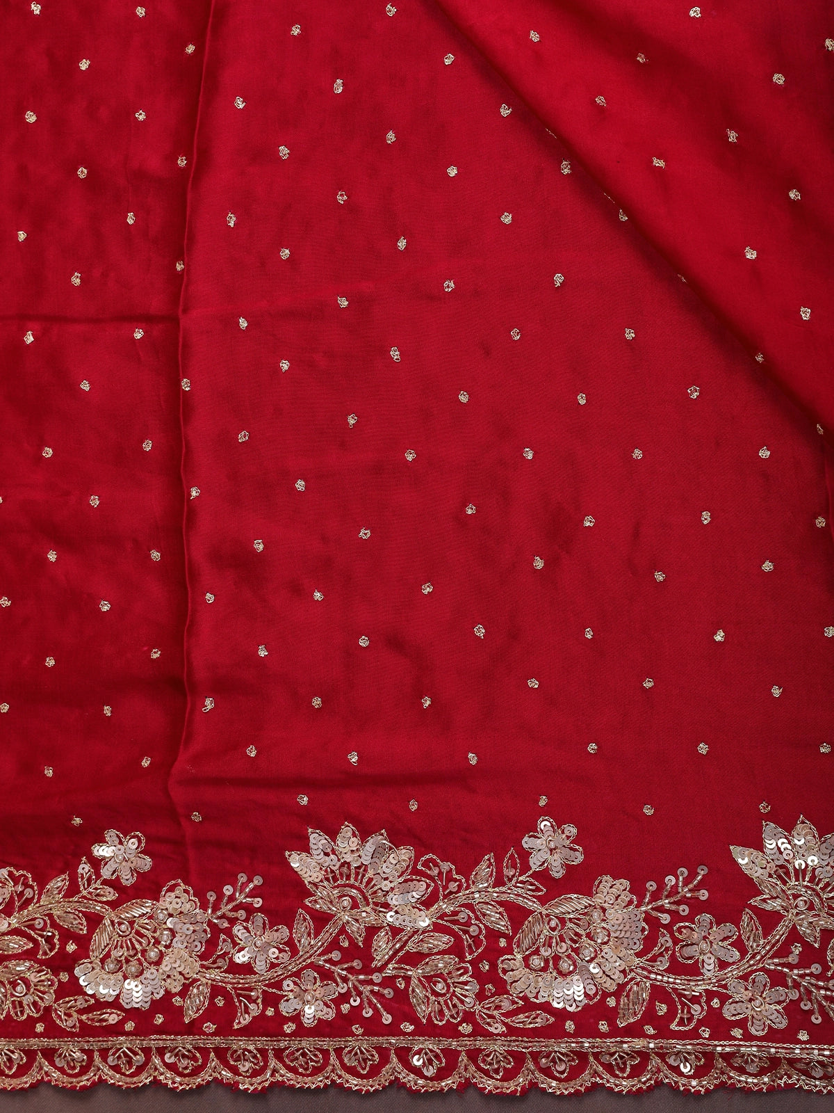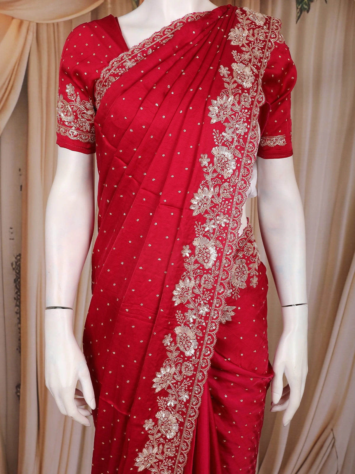Intricate floral patterns along the embroidered border and pallu enhance its charm, while scattered sequin motifs across the body create a refined shimmer. The saree is paired with a matching embroidered blouse, detailed with floral sequin work on the sleeves and neckline for a perfectly coordinated look.