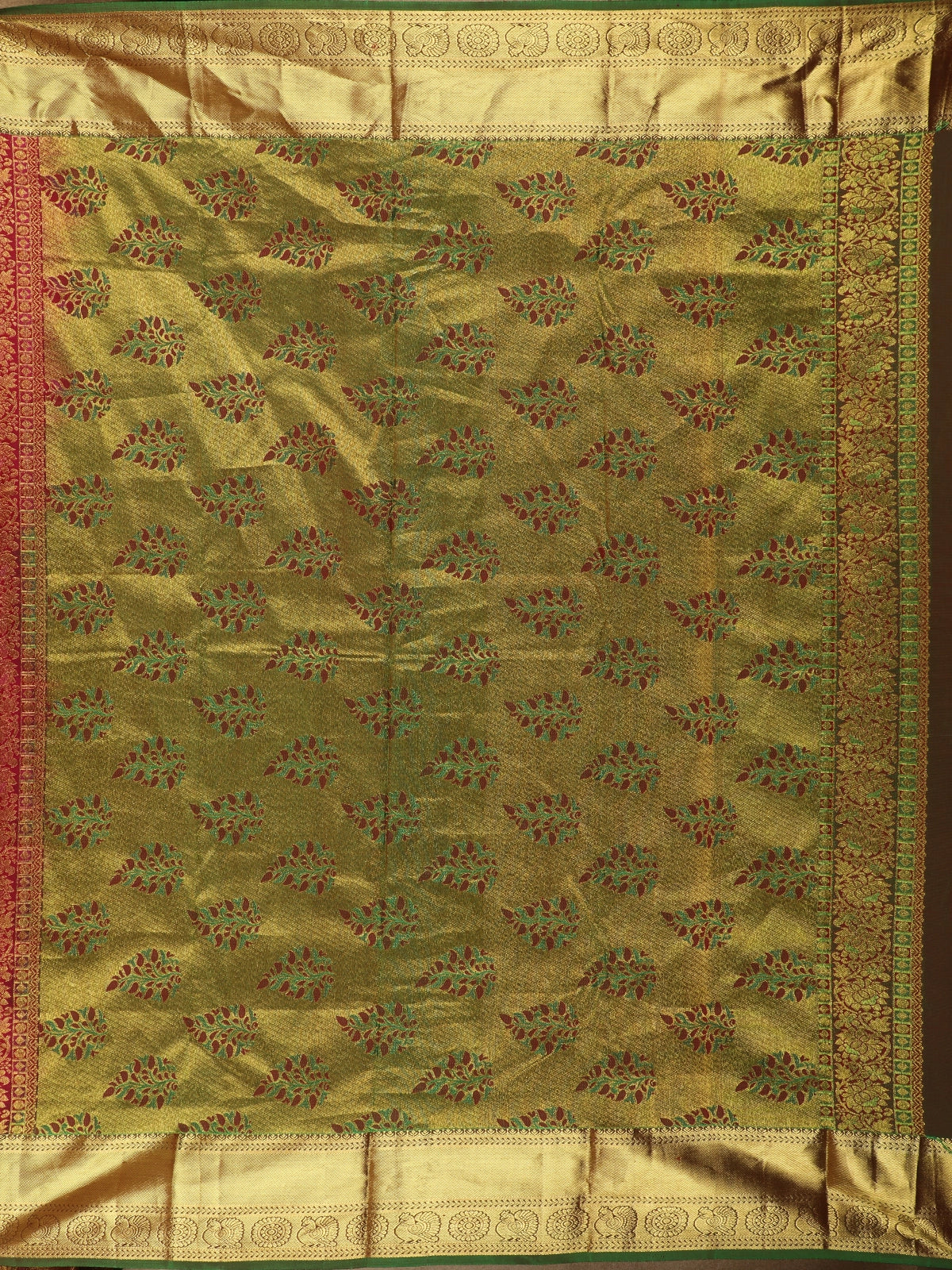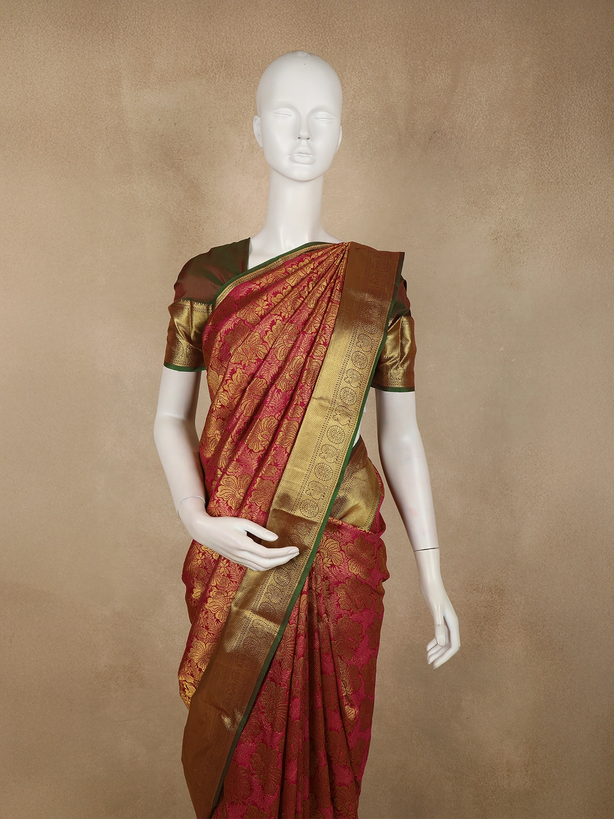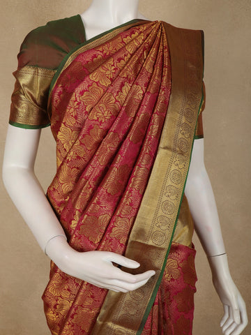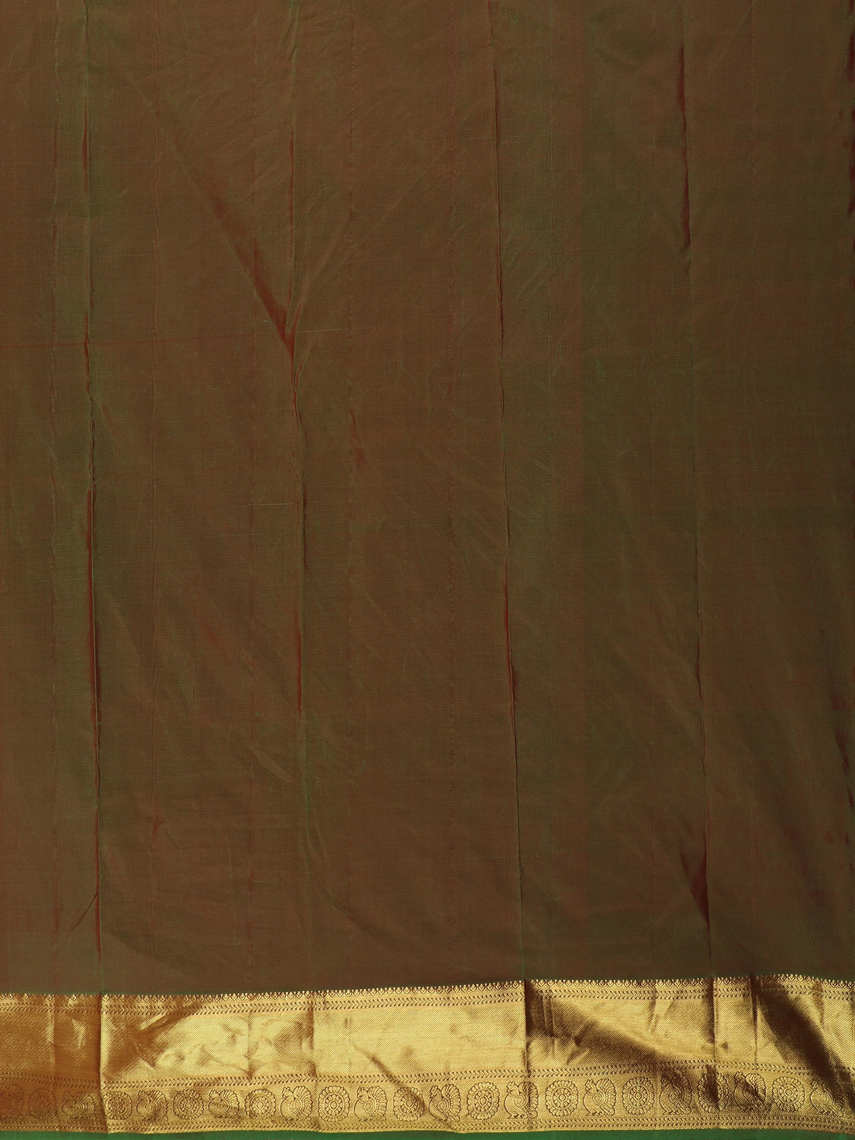 The saree is beautifully complemented by a broad contrast zari border in rich gold tones, enhanced with a fine green selvedge that adds a classic temple-inspired touch. The luxurious zari woven pallu further accentuates the richness of the weave, making the saree perfect for grand occasions.