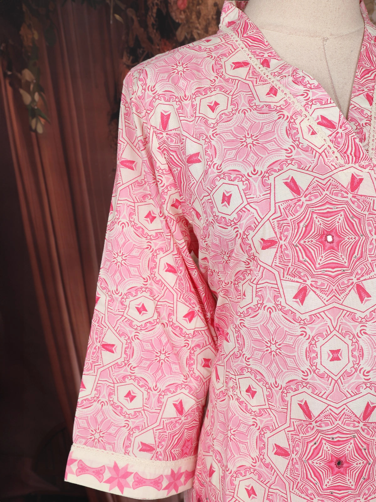 The outfit showcases a mandarin collar neckline accentuated with delicate lace detailing, adding a refined touch to its contemporary appeal. The 3/4 sleeves and printed dupatta with coordinated motifs complete the look, making it a versatile choice for warm days and easygoing elegance.