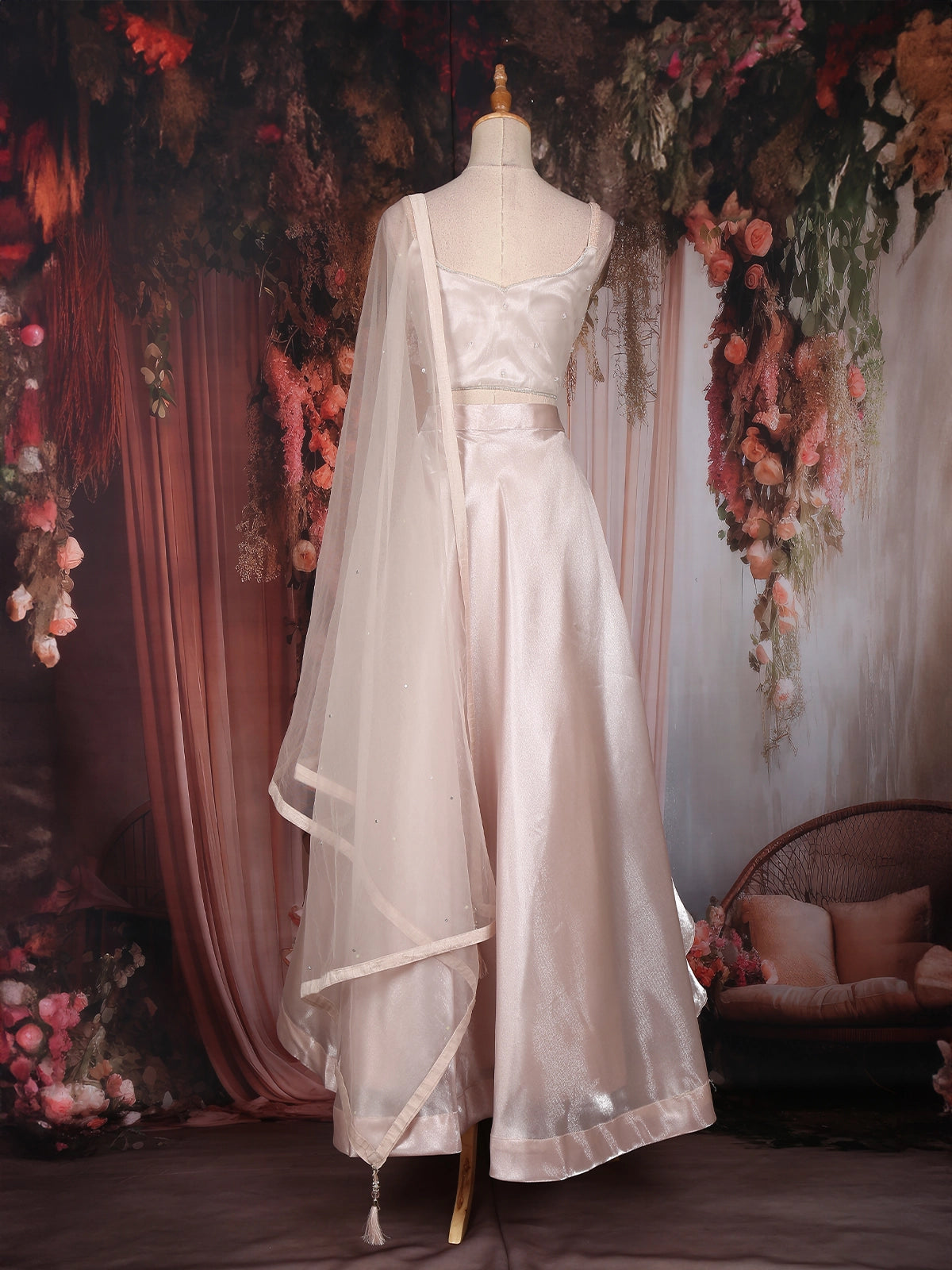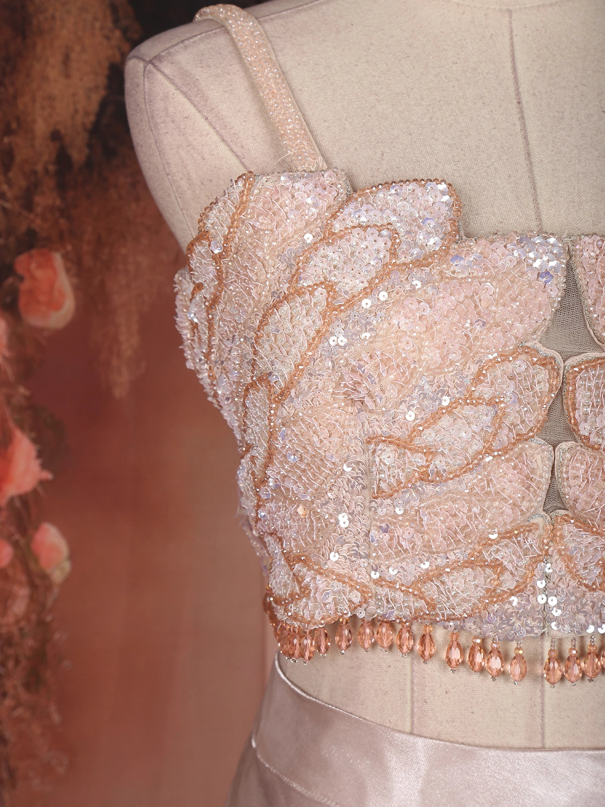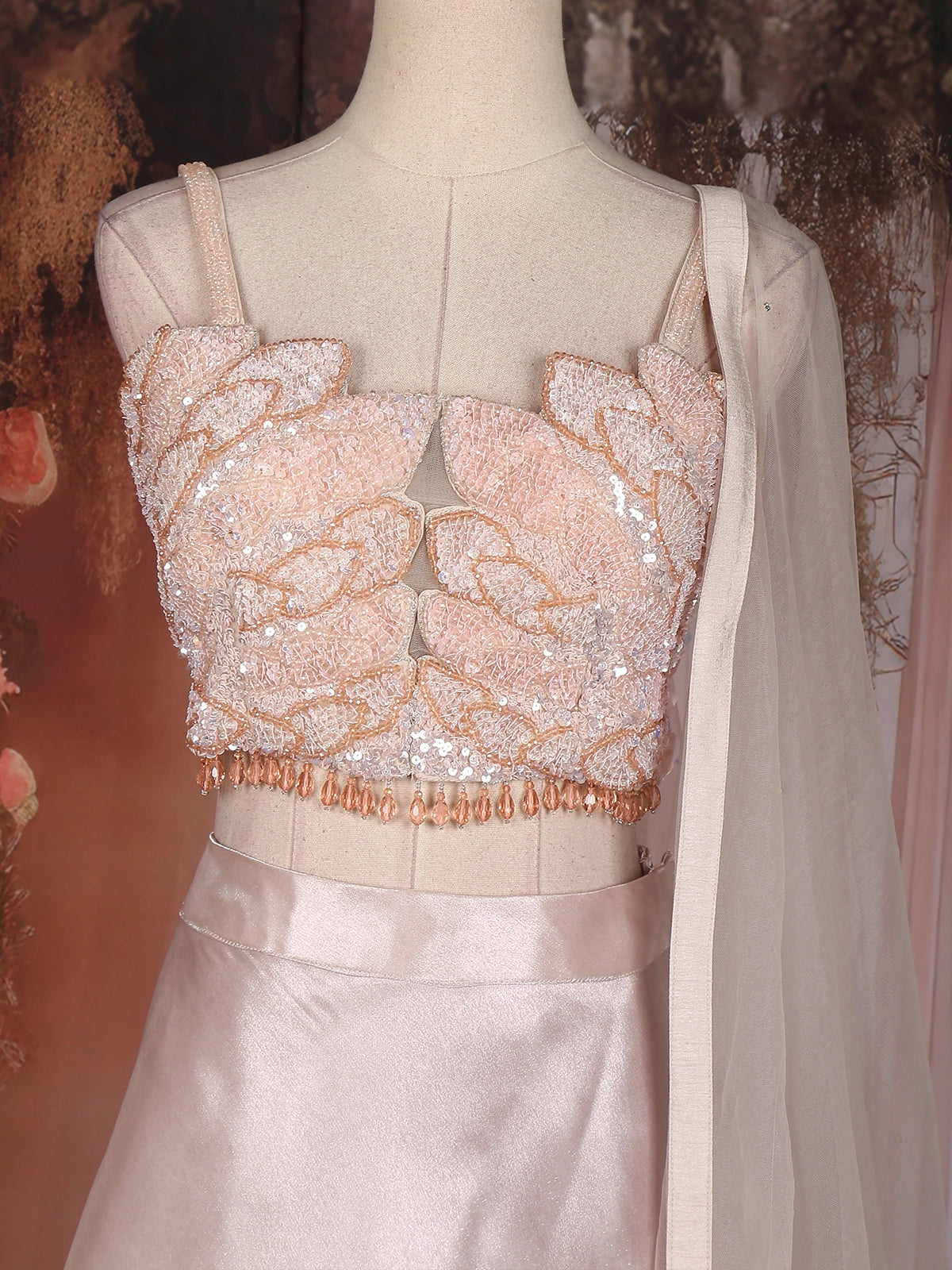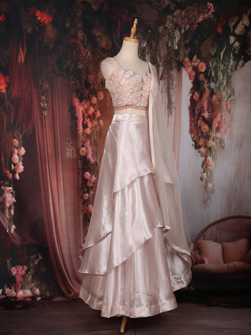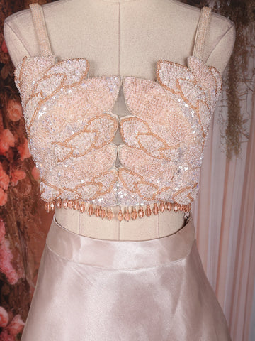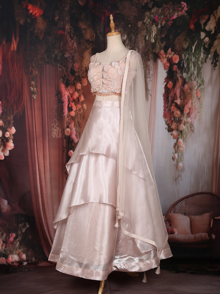 The lehenga features a layered organza skirt, tailored in cascading tiers that flow effortlessly, adding volume and movement to your every step. Its sheen finish reflects elegance, while the heavily embellished blouse takes center stage — adorned with intricate sequins, bead, and crystal embroidery arranged in floral and abstract motifs. The spaghetti straps and sculpted neckline bring a hint of contemporary chic, perfectly balancing the outfit’s regal craftsmanship with a modern edge.