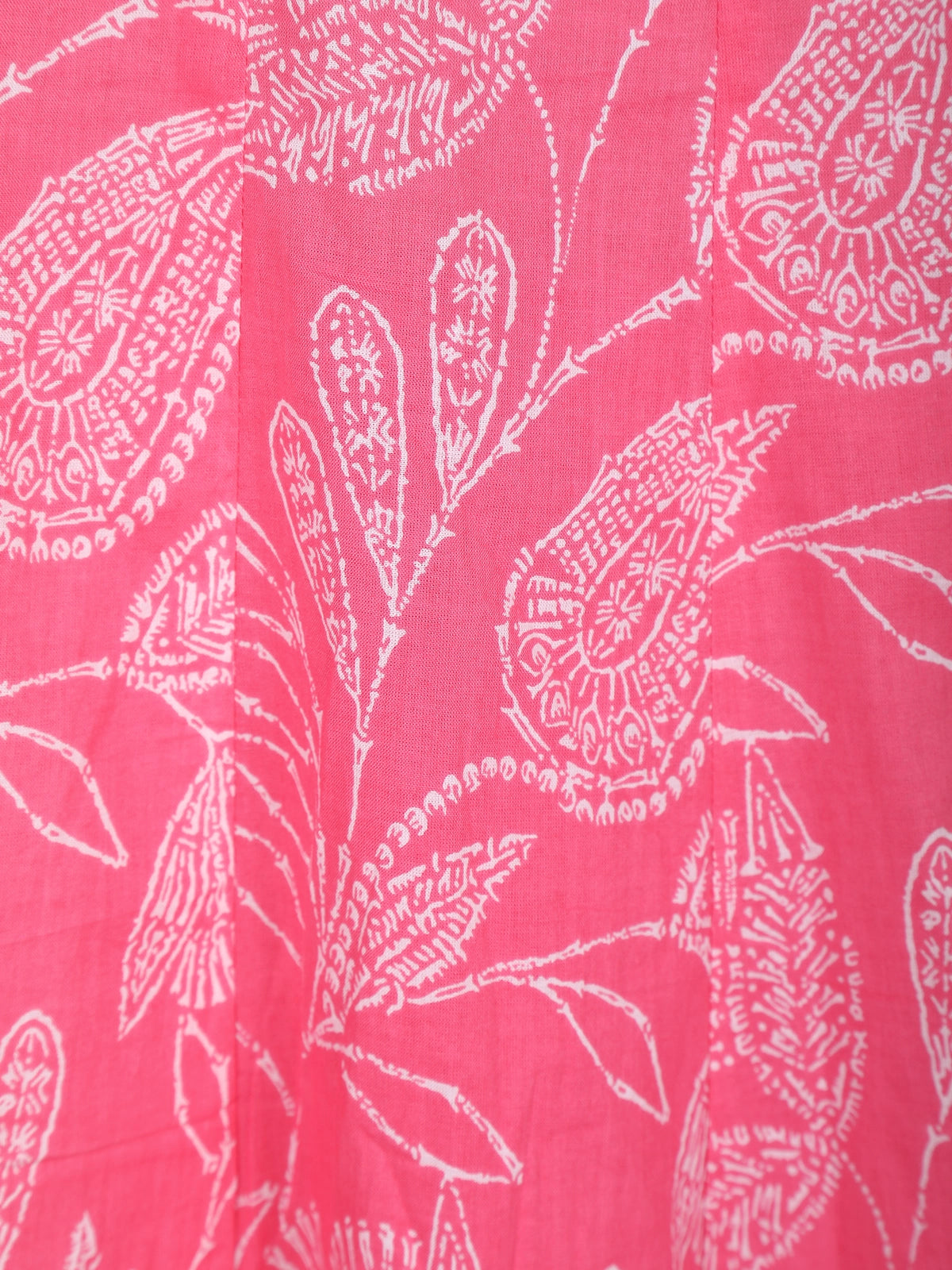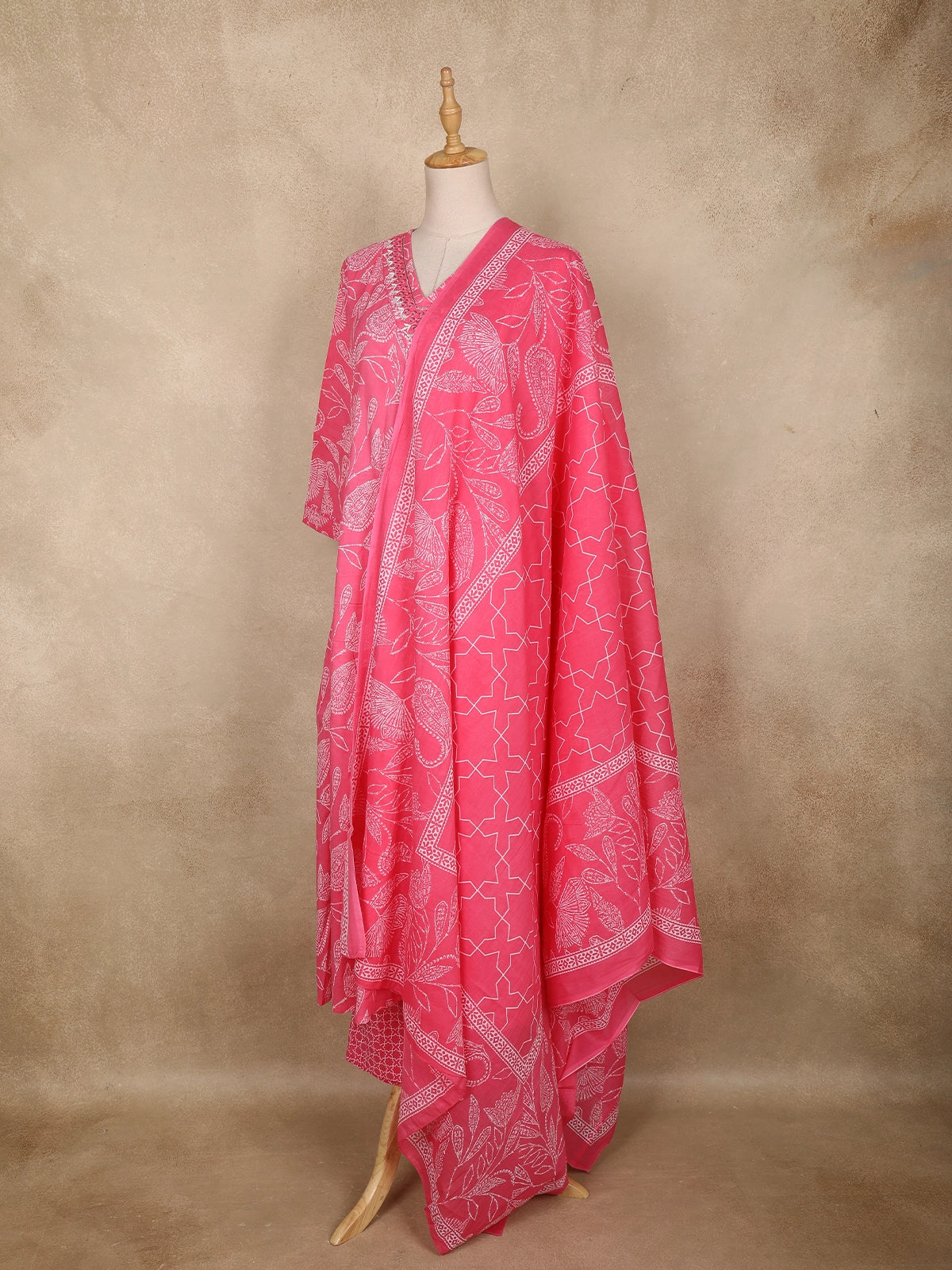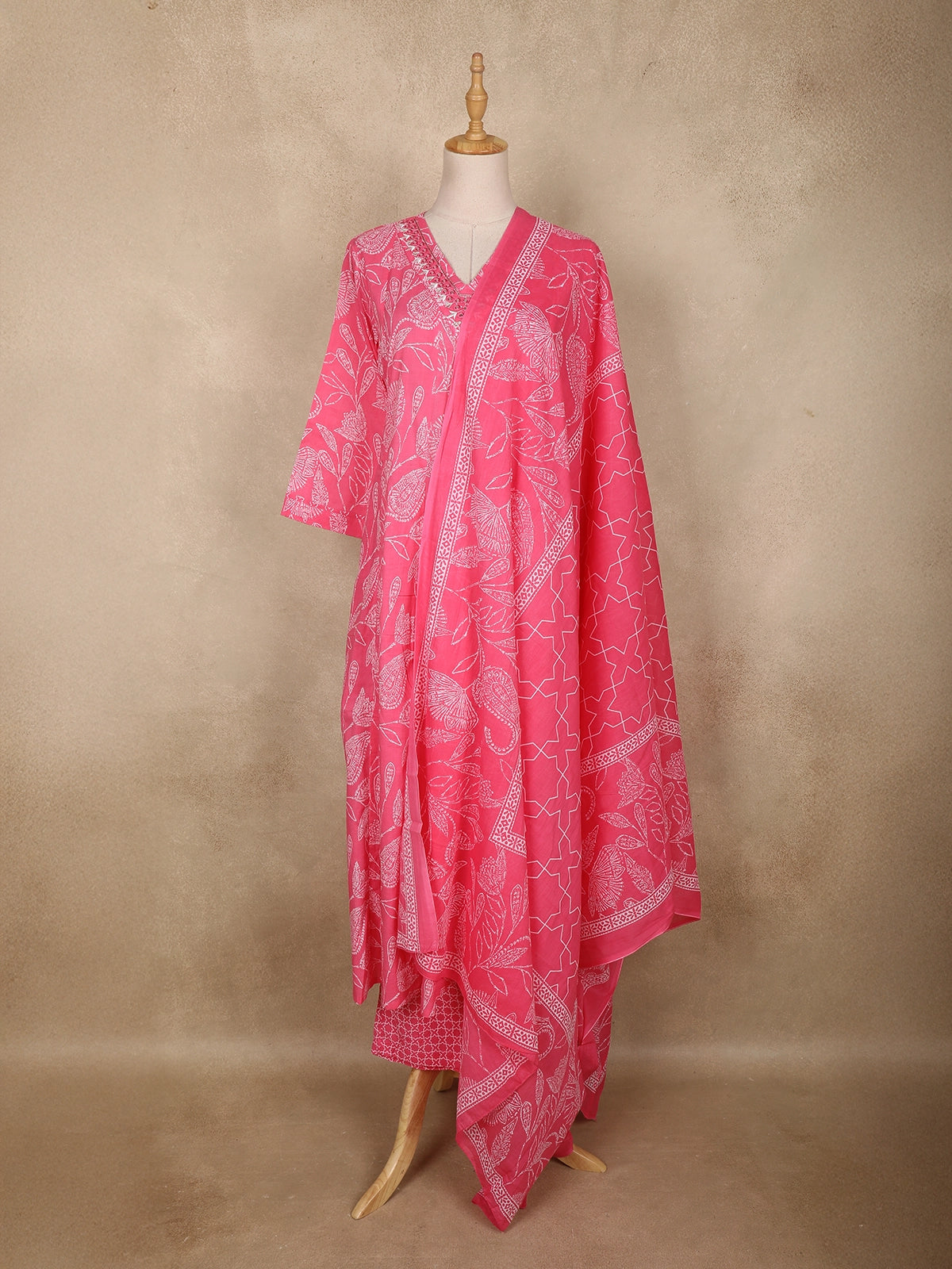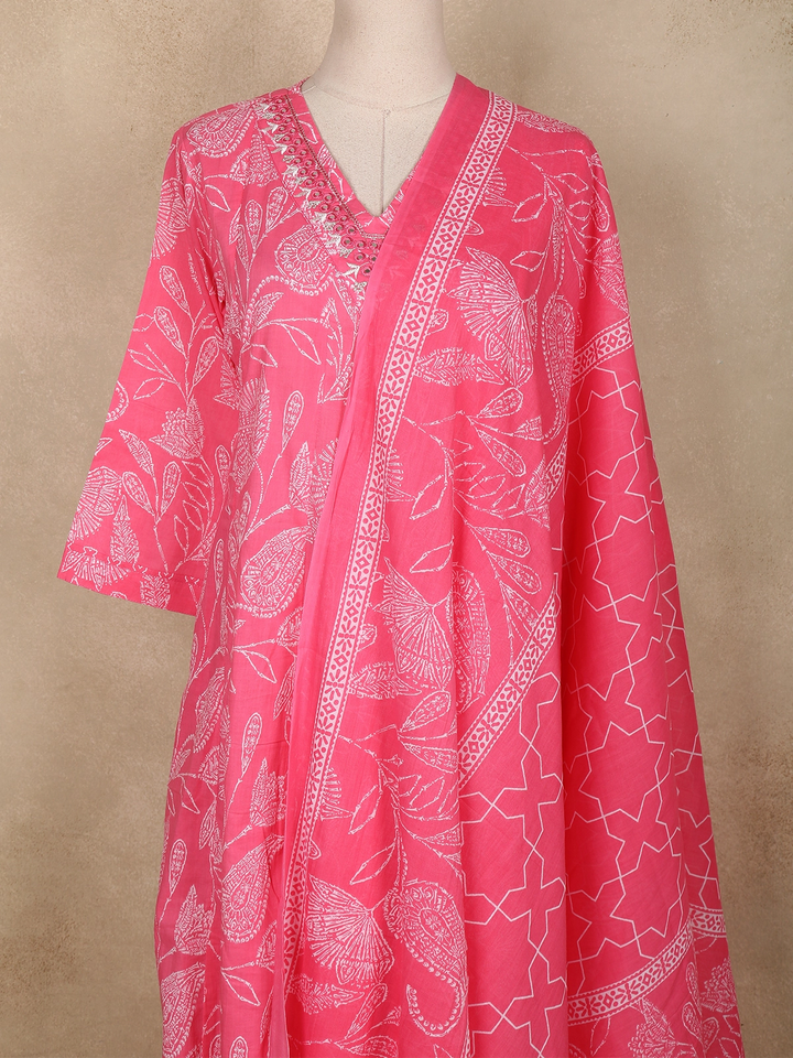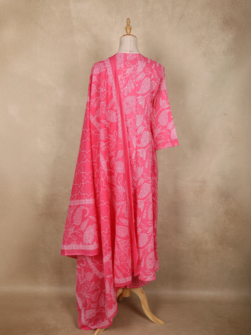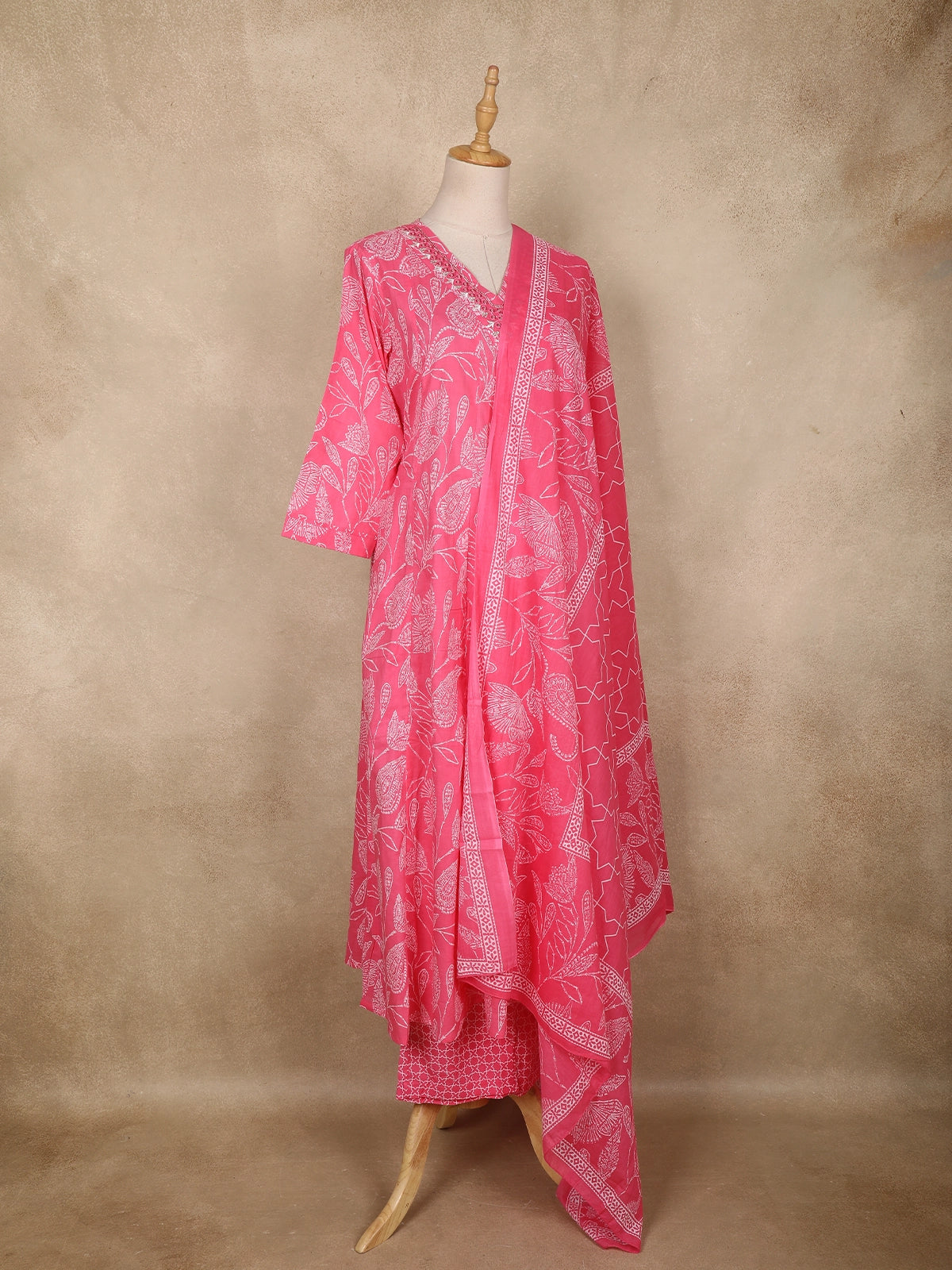 Pink Leaf printed Design Cotton Anarkali Salwar Suit with Printed Dupatta