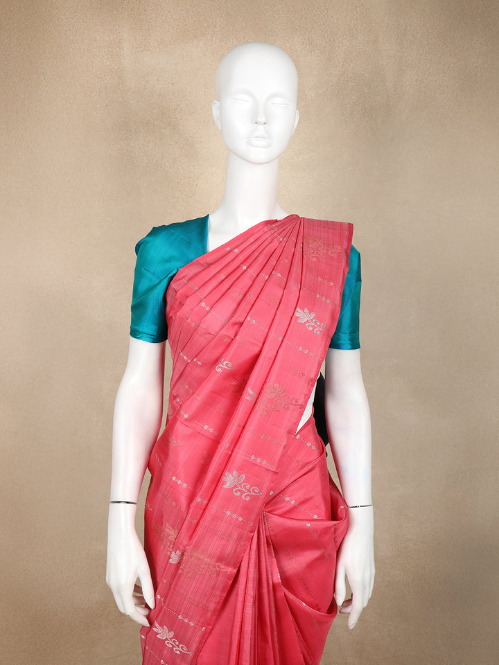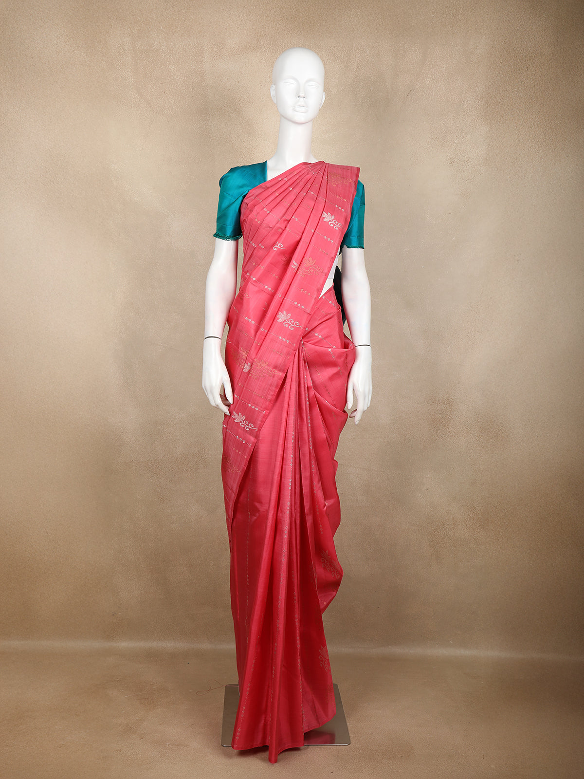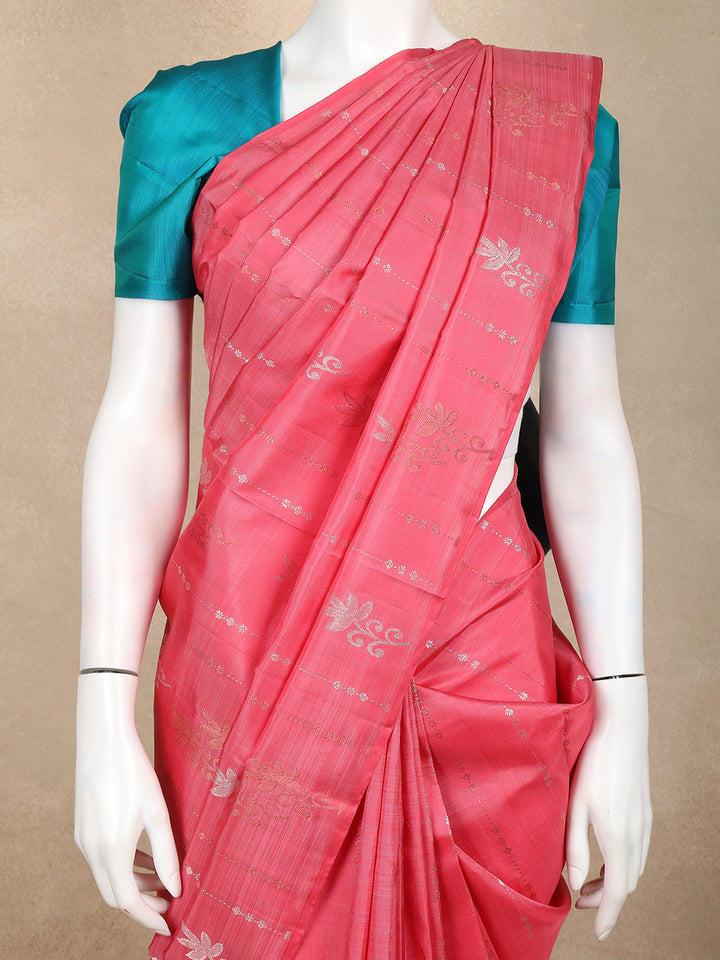 Elevate your bridal look with this Pink Kanchipuram Bridal Silk Saree, crafted from pure silk for a luxurious feel. The body features elegant stripe patterns that offer a refined texture, while the absence of a border gives it a sleek, modern aesthetic. Ideal for contemporary brides who seek tradition with a twist. Pair it with a contrasting blouse and pallu for a complete statement look.