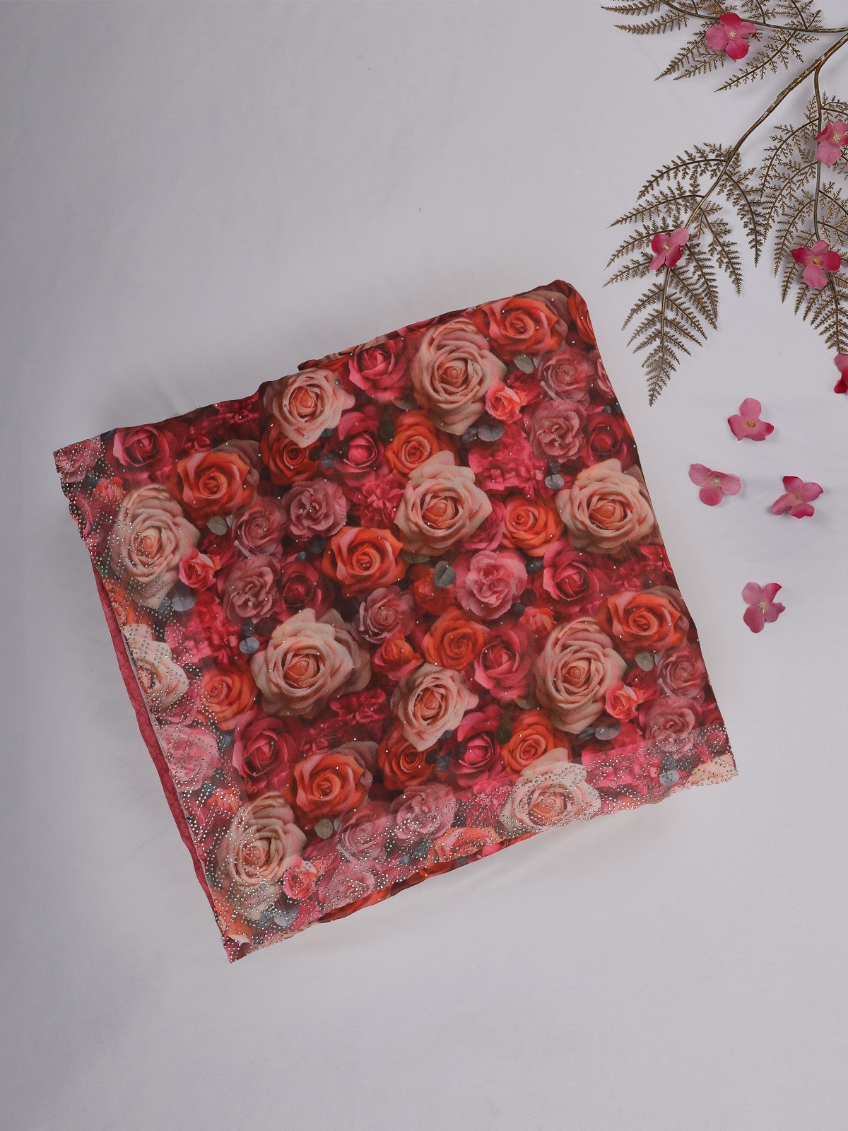 Make a bold and romantic style statement with this exquisite Pink Chiffon Saree, adorned with a dense cluster of blooming roses in stunning shades of crimson, coral, peach, wine, and blush pink. The realistic floral artwork gives the saree a luxurious bouquet effect, perfect for women who love vibrant and expressive designs.