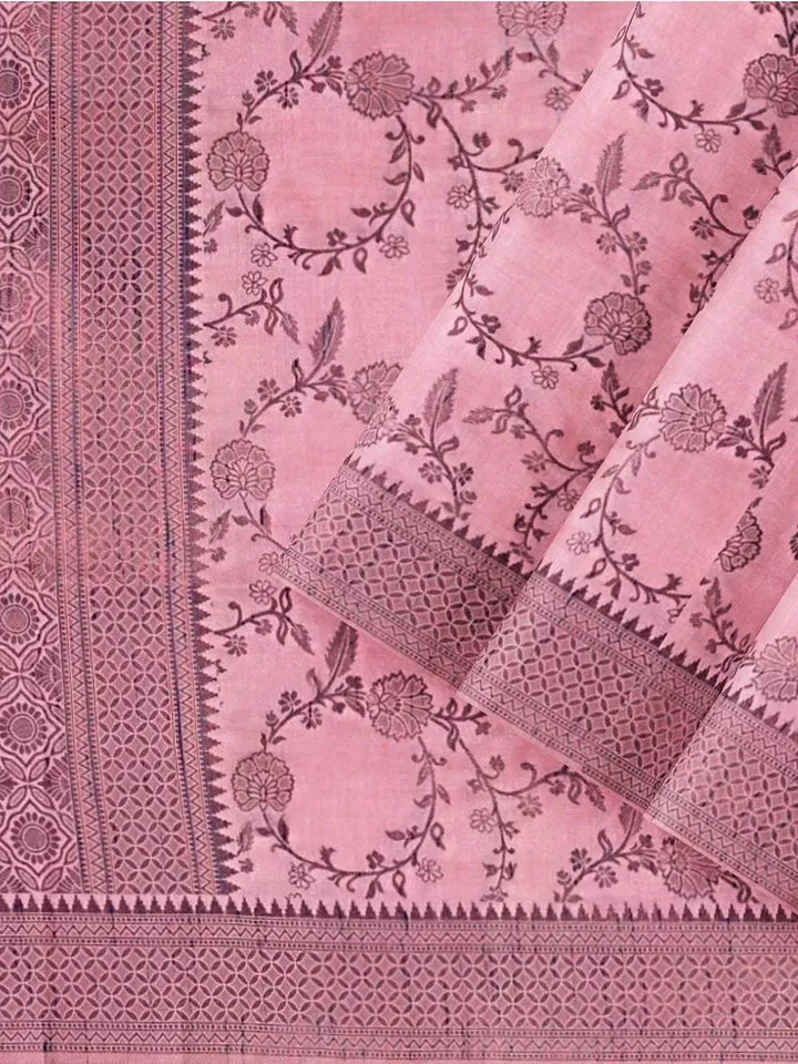 Pink Semi Tussar Silk Saree with Floral Prints on the body and Printed Border