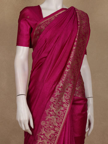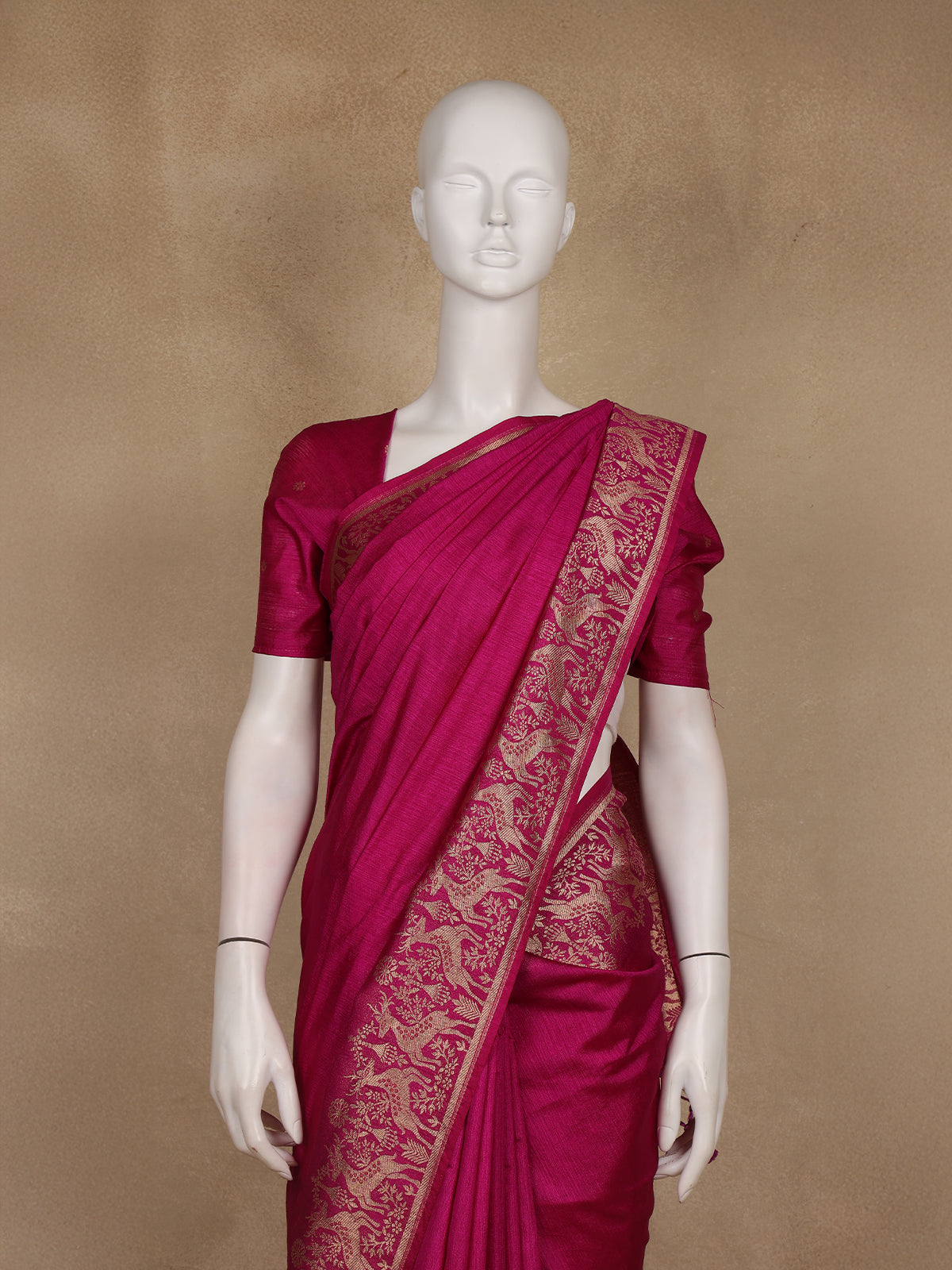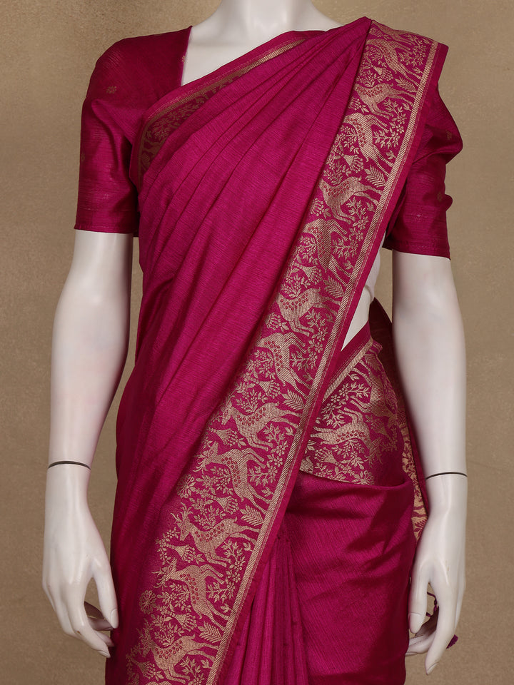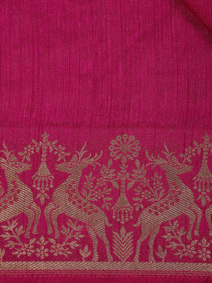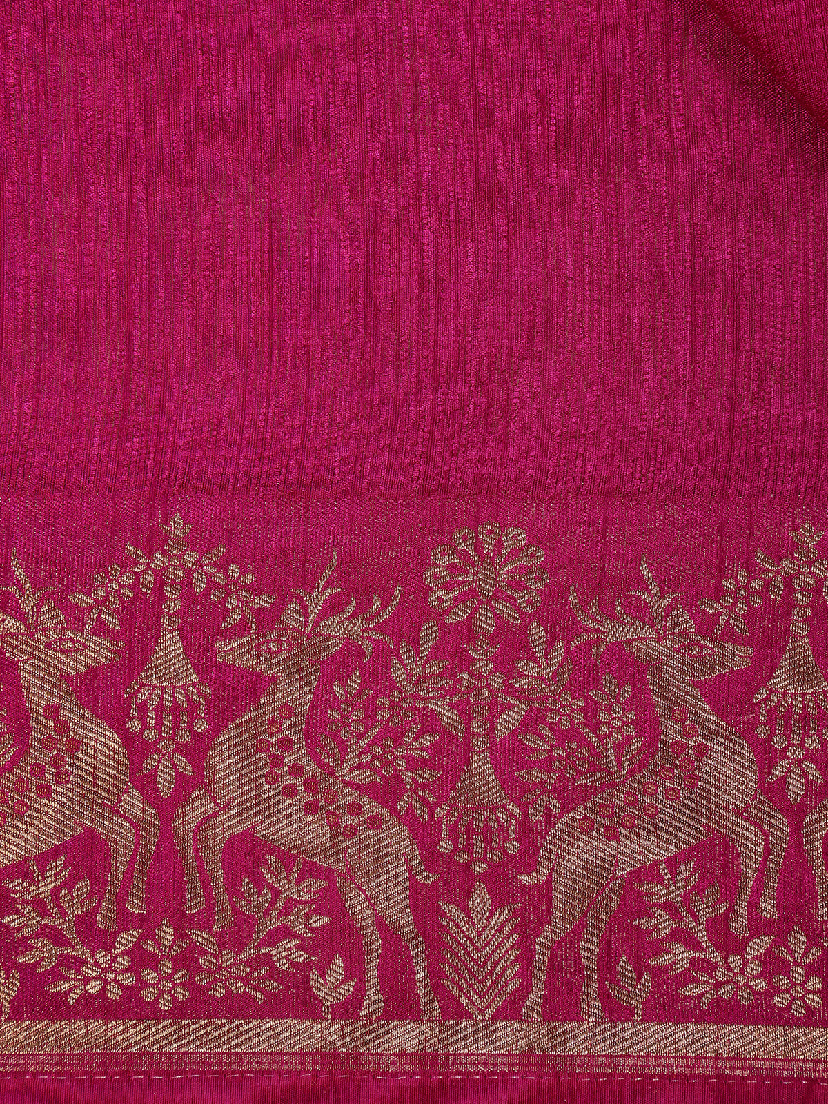 This exquisite Pink Raw Silk Saree radiates traditional charm and artistic craftsmanship. The saree features intricate zari-woven motifs of graceful deer and floral vines across the border and pallu, lending it a royal and timeless appeal. The body is adorned with delicate butta patterns, enhancing its texture and sheen. The shimmering zari border accentuates the elegant drape, making it perfect for festive and wedding occasions.
