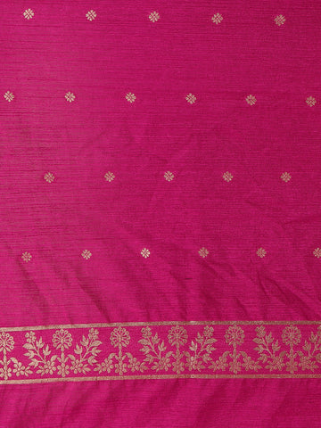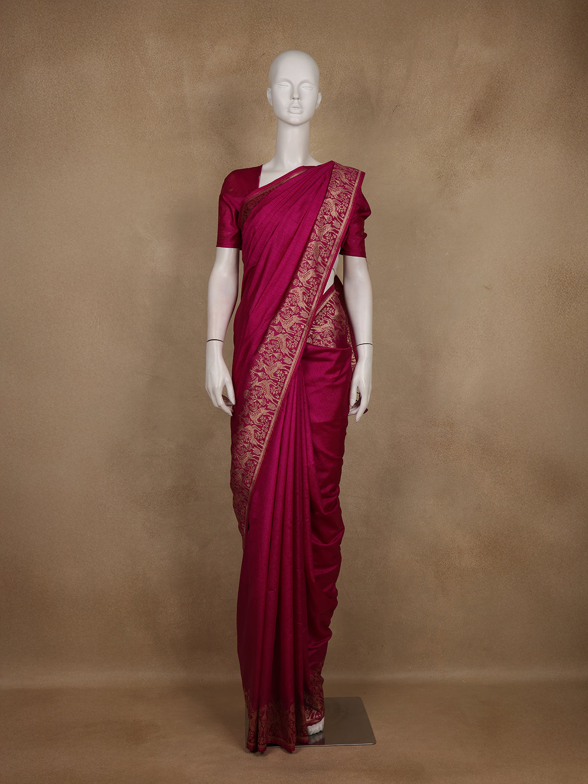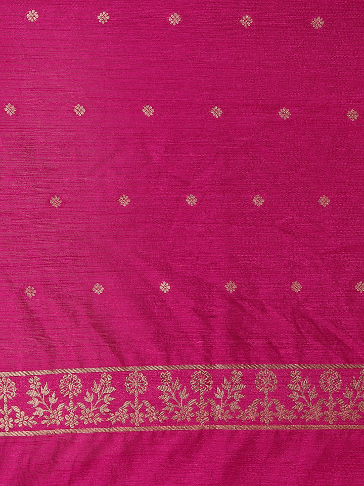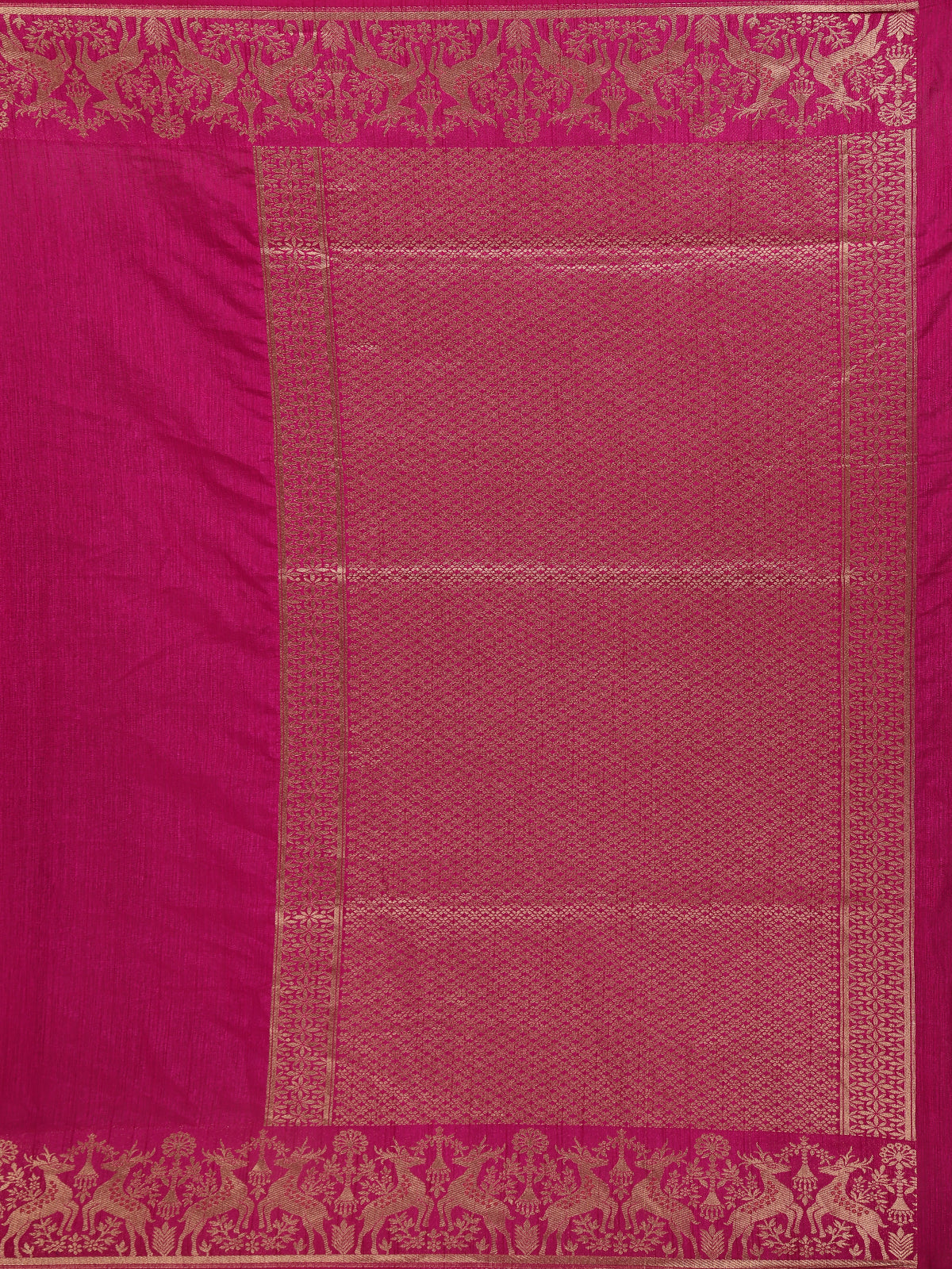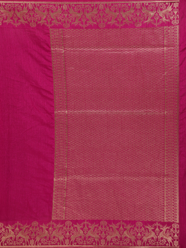 This exquisite Pink Raw Silk Saree radiates traditional charm and artistic craftsmanship. The saree features intricate zari-woven motifs of graceful deer and floral vines across the border and pallu, lending it a royal and timeless appeal. The body is adorned with delicate butta patterns, enhancing its texture and sheen. The shimmering zari border accentuates the elegant drape, making it perfect for festive and wedding occasions.