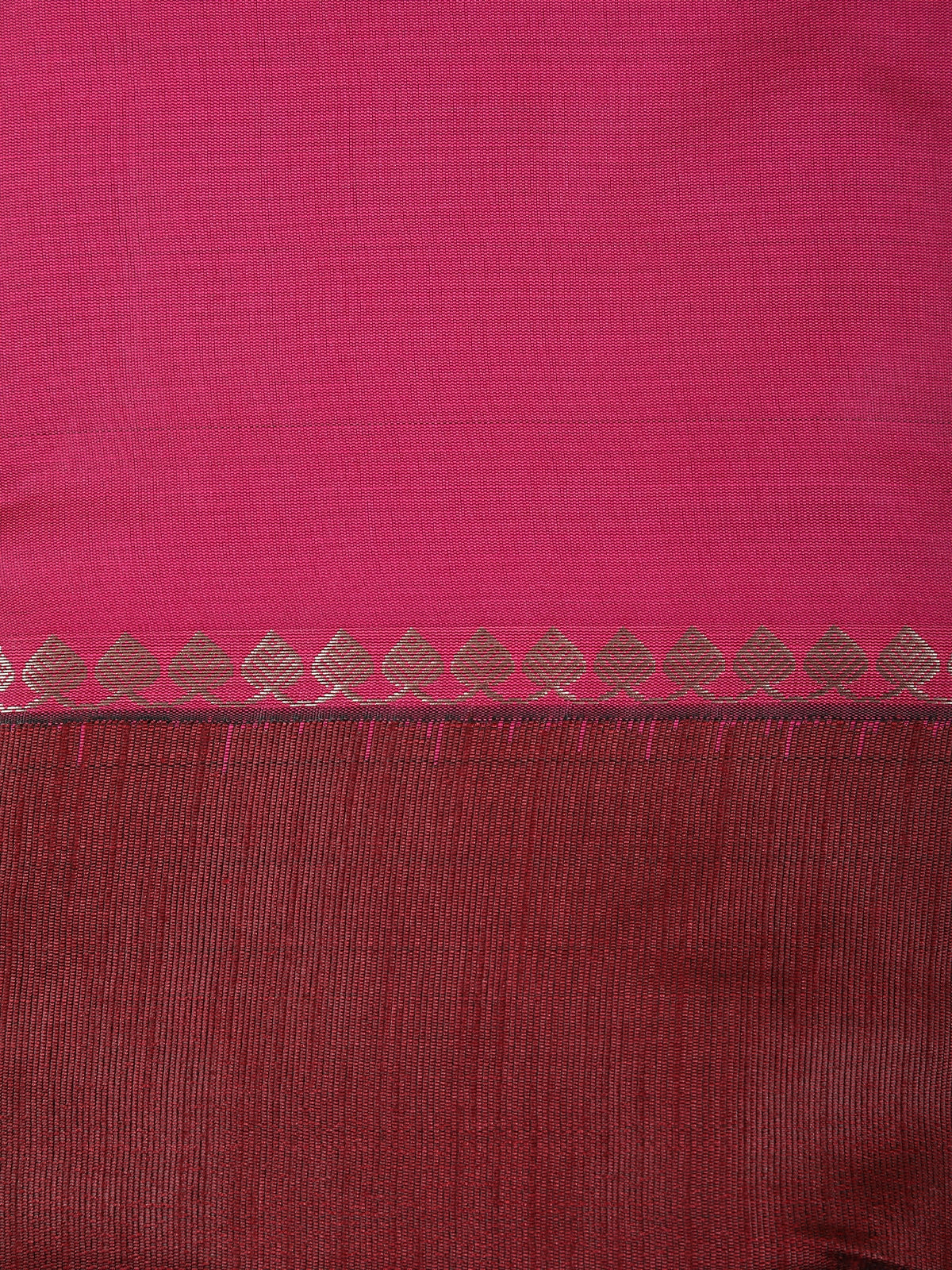 The saree is accentuated with a contrasting maroon border, woven with subtle zari detailing that adds depth and traditional charm. The fine zari work along the border enhances the overall appeal without overpowering the elegant solid base, creating a perfect balance of simplicity and grandeur.