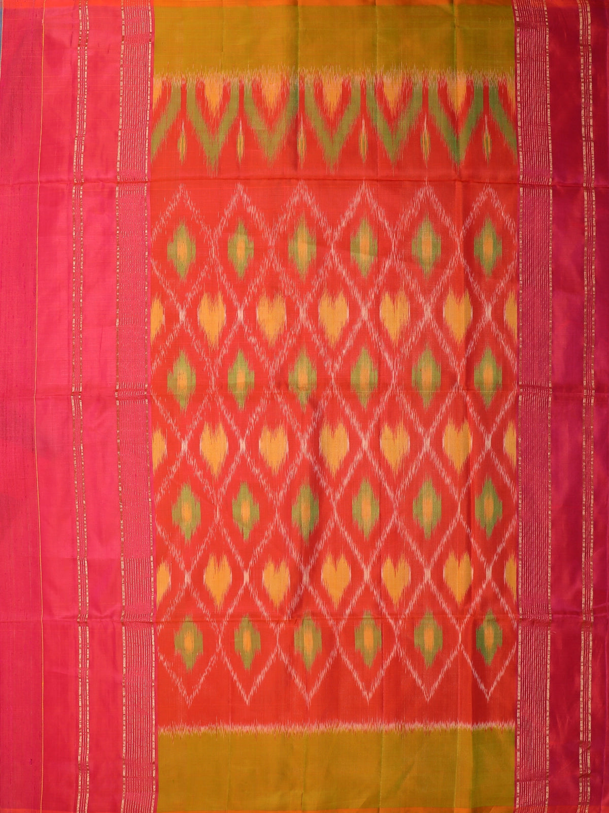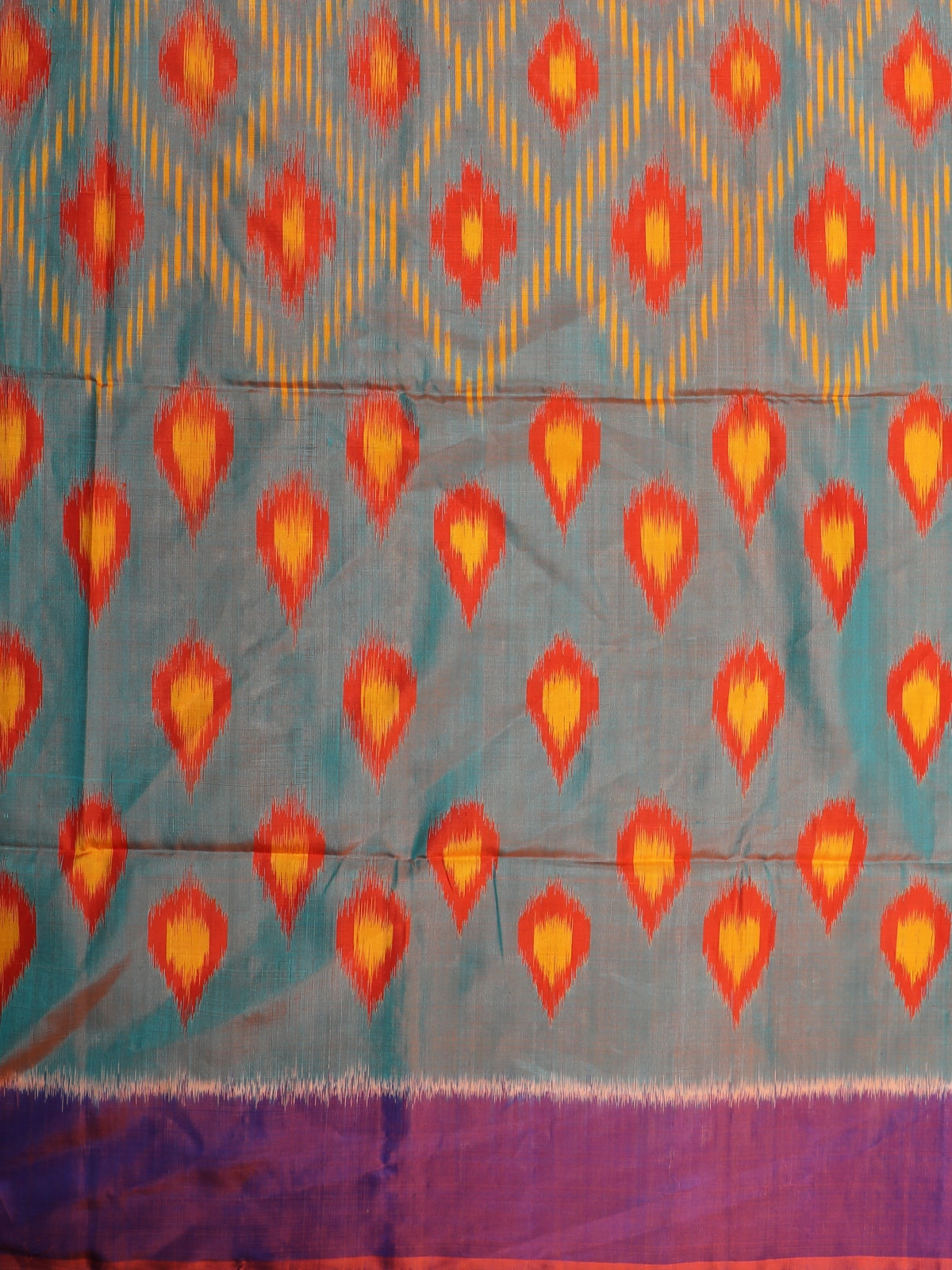 The true showstopper is its exquisite Ikat pallu, adorned with intricate diamond and flame motifs in shades of yellow, green, teal, and orange. Crafted with authentic Ikat resist-dye techniques, the pallu showcases artistic craftsmanship that makes each saree unique.