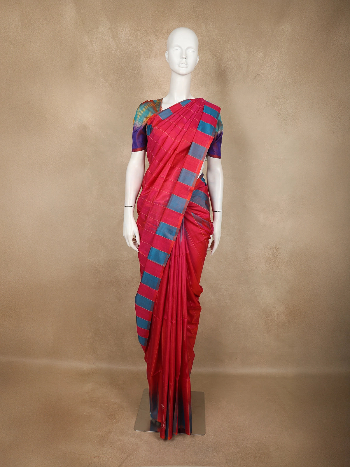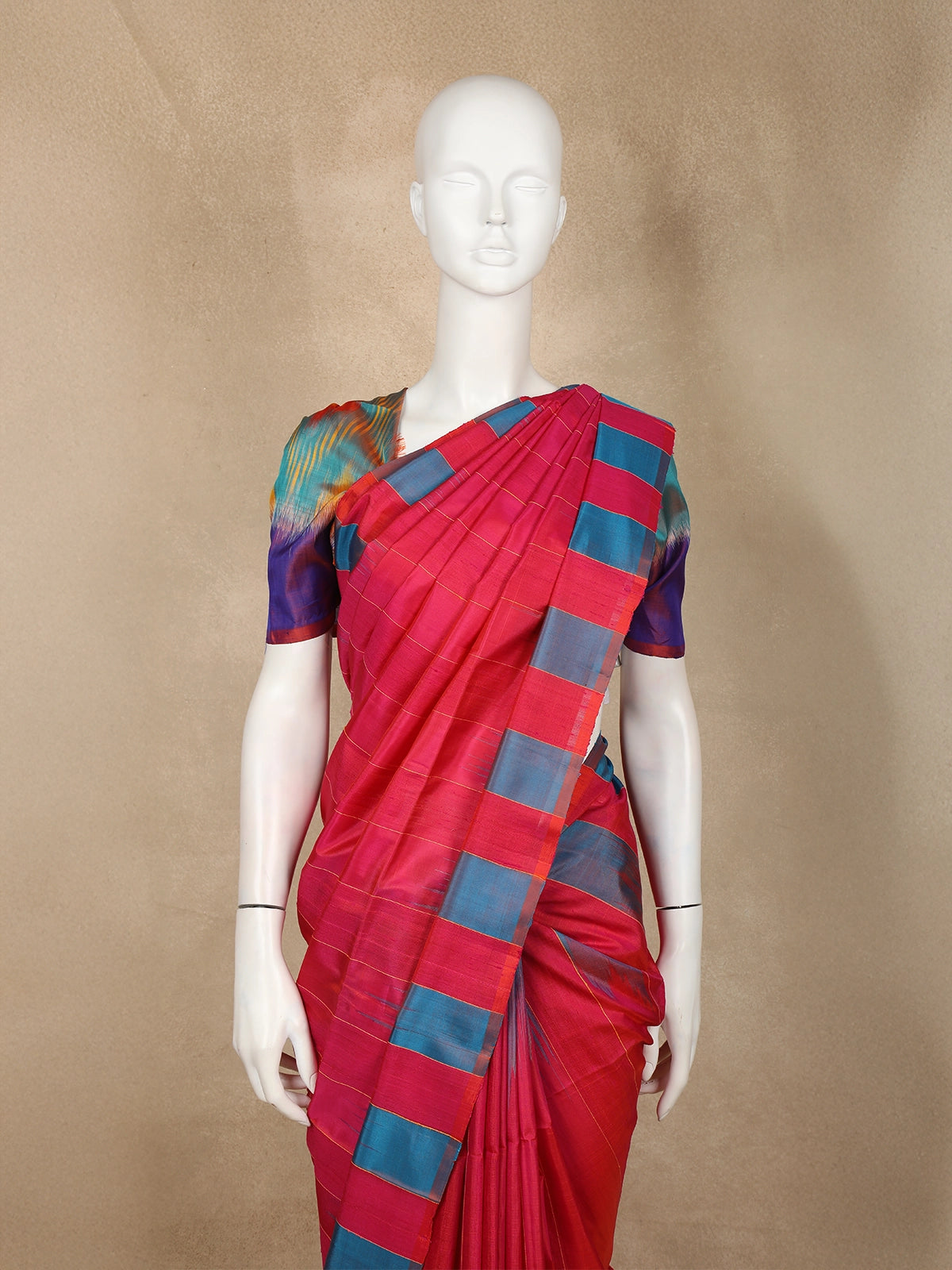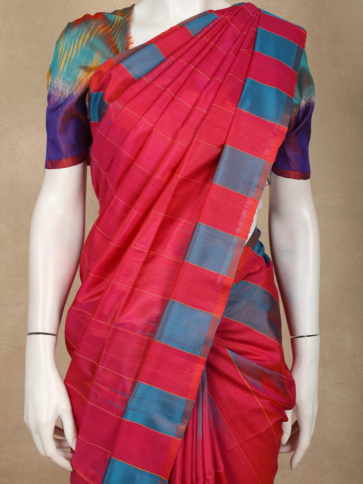 Paired with a beautifully coordinated multicolour Ikat-inspired blouse piece, this saree brings together modern vibrance and cultural elegance—perfect for festive celebrations, family gatherings, and special occasions where you want to stand out effortlessly.