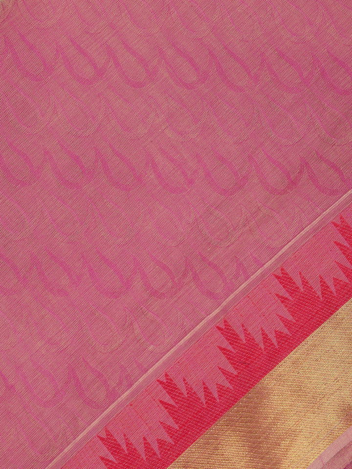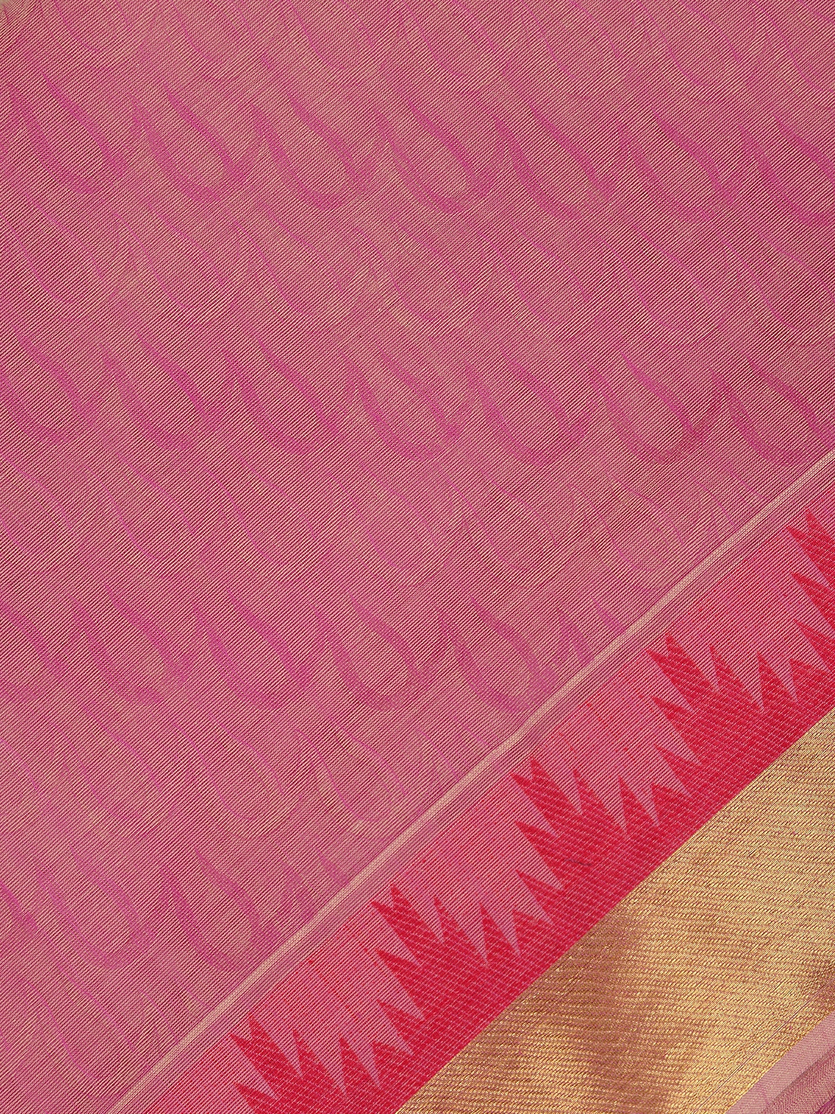 The saree features a graceful wave-patterned woven design across its soothing pink body, adding subtle texture and visual appeal. The golden zari border accentuated with a contrast red edge lends a refined touch of richness, beautifully framing the saree with a traditional finish. The matching pink pallu and blouse piece complete the ensemble, creating a harmonious and graceful look.