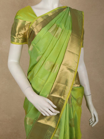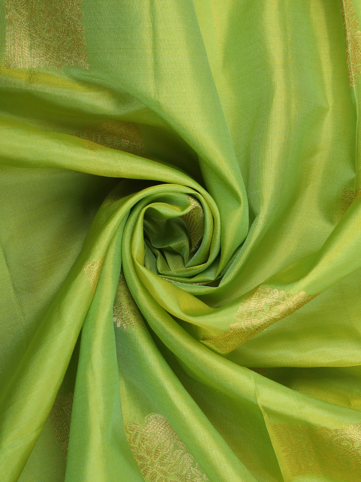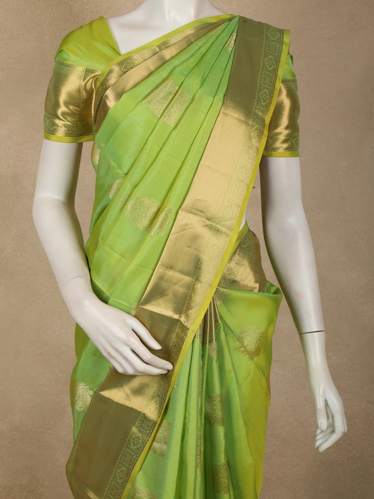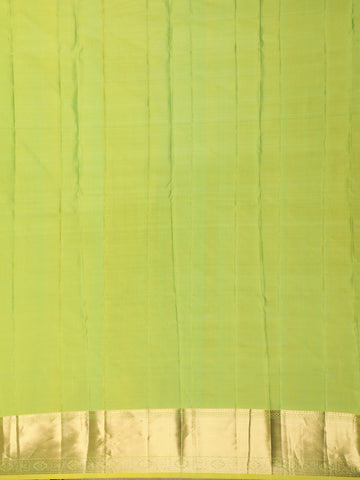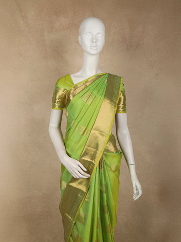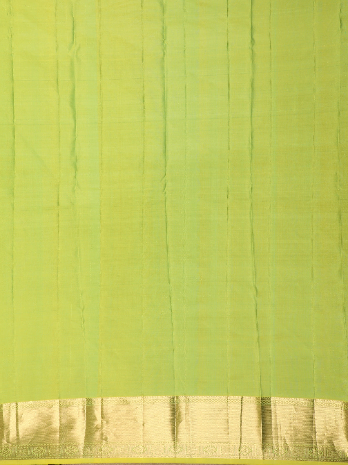 The saree is beautifully finished with a traditional gold zari border, woven with intricate patterns that enhance its richness and highlight the authenticity of Kanchipuram weaving. The gentle green hue paired with radiant gold creates a look that is both refreshing and timeless.