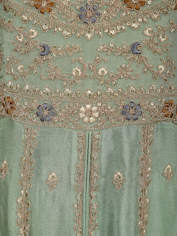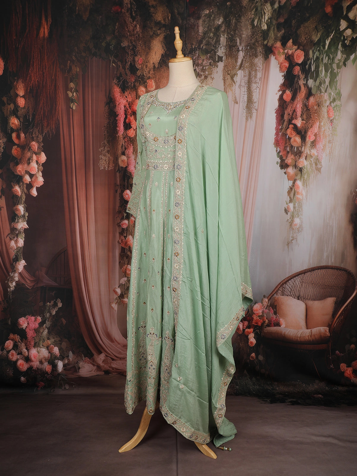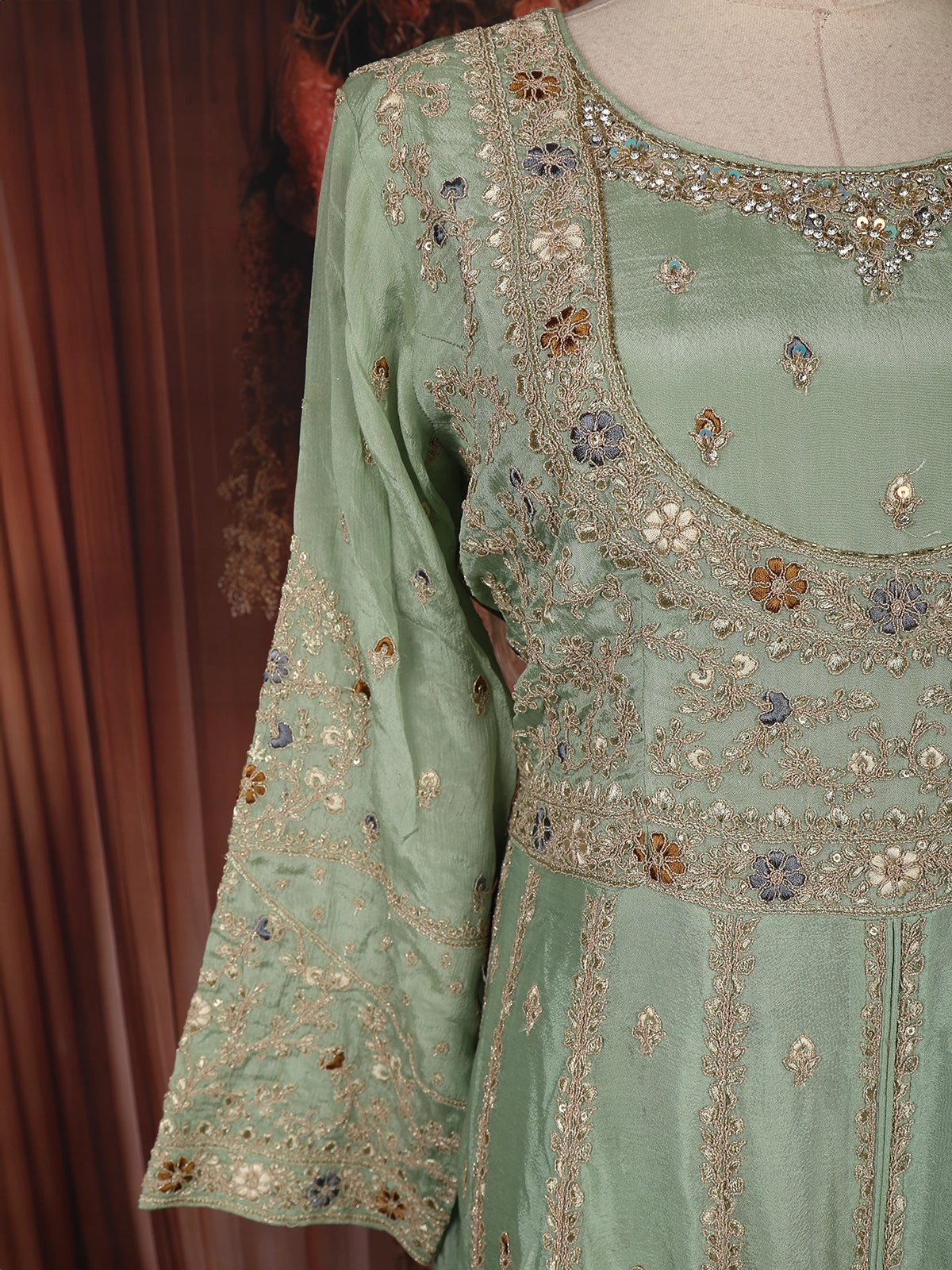 Step into elegant charm with this serene Pista Green Embroidered Anarkali Suit, crafted to exude grace and sophistication. The highlight of this ensemble lies in its intricate thread and zari embroidery, beautifully complemented with sequin embellishments that add just the right amount of shimmer.