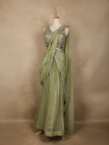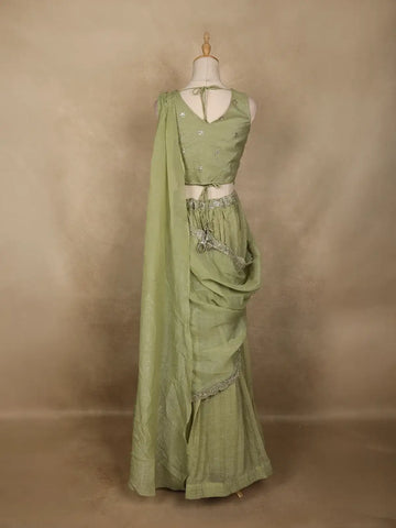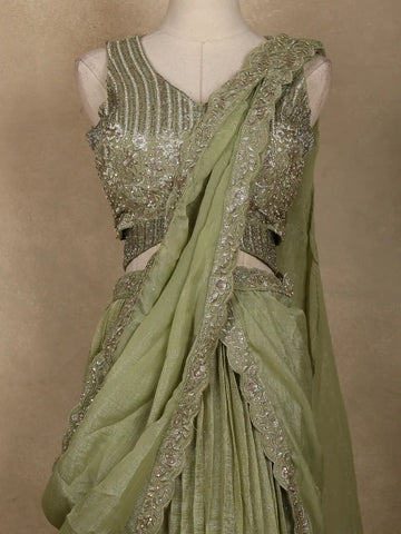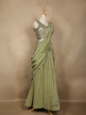 Radiate charm and sophistication with this Green Sheer Embroidered Party Lehenga, a perfect blend of traditional elegance and contemporary flair. Crafted in a delicate sheer fabric, the lehenga flows gracefully with finely pleated detailing, offering a regal silhouette.