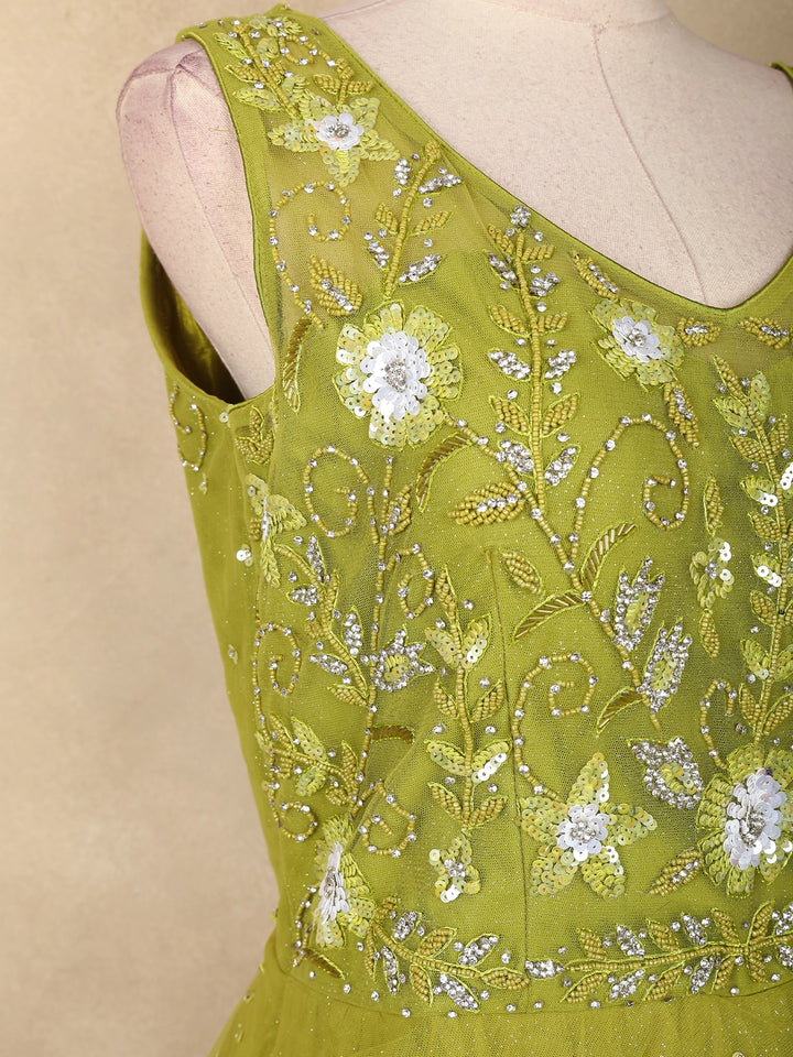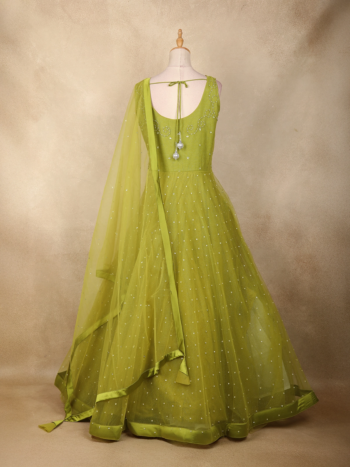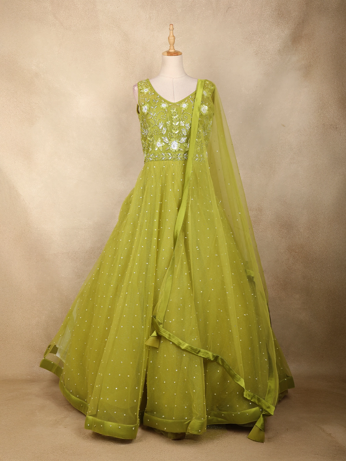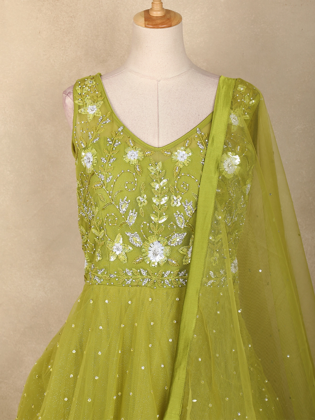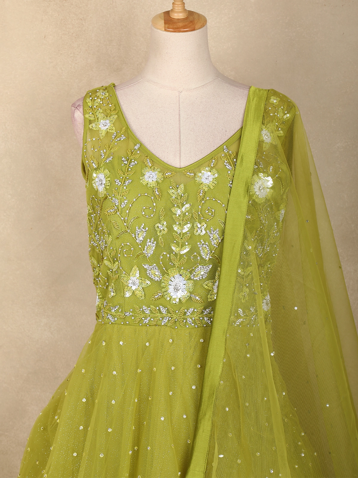 Pista Green Floral Sequins Embroidered Net Gown with Dupatta