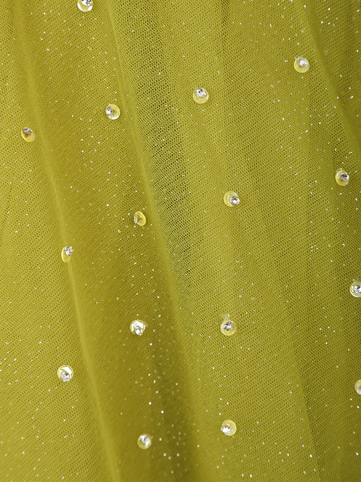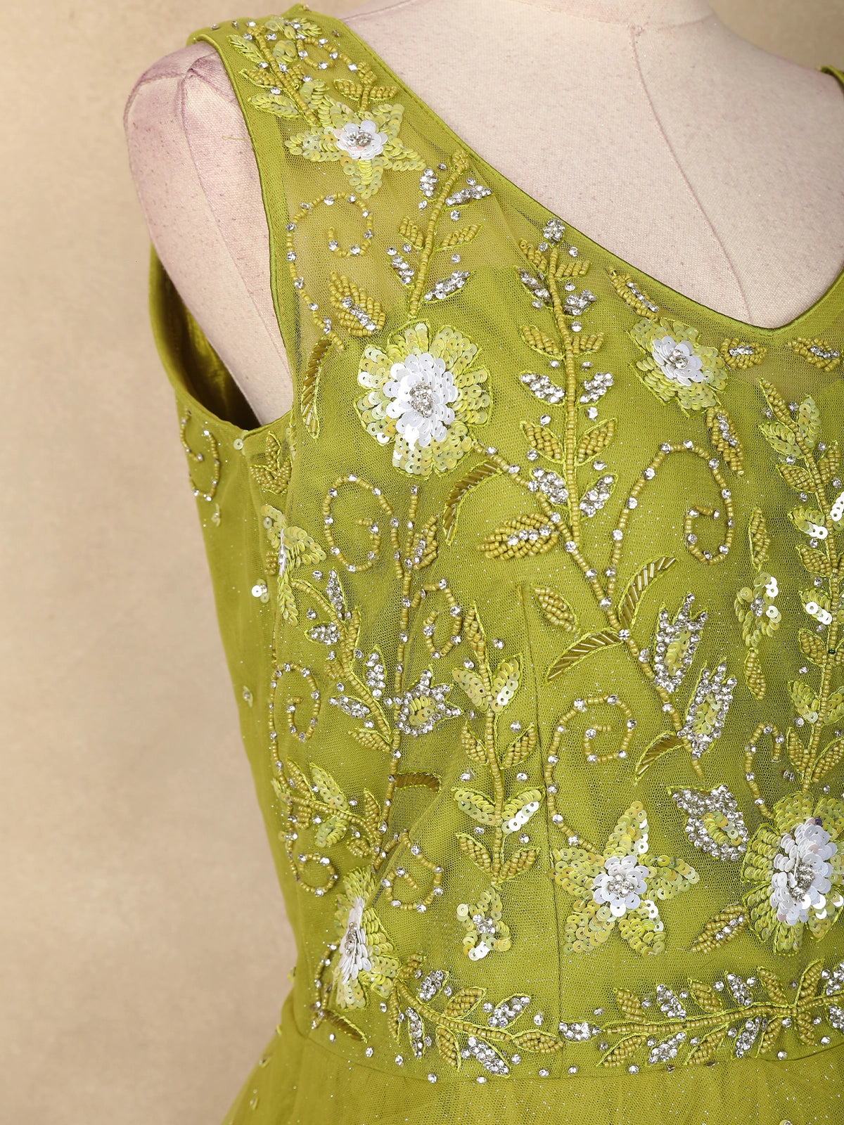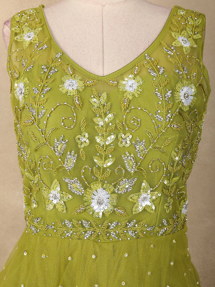 Step into elegance with this refreshing Pista Green Gown, crafted to bring a soft yet glamorous look to any celebration. The bodice features intricate floral sequin embroidery with shimmering beads and stones, creating a charming garden-like motif that shines with every angle. The flattering V-neckline adds a graceful feminine touch.