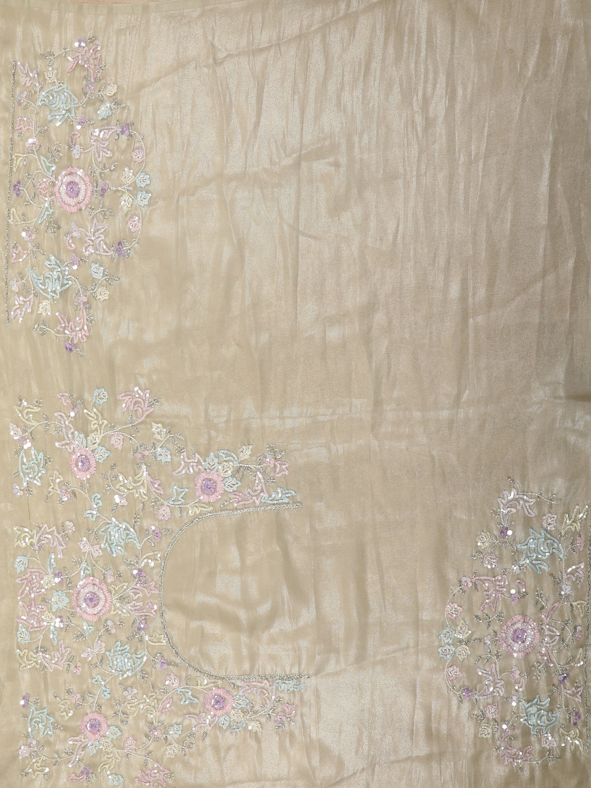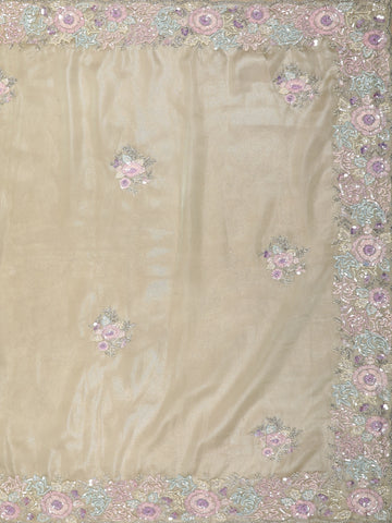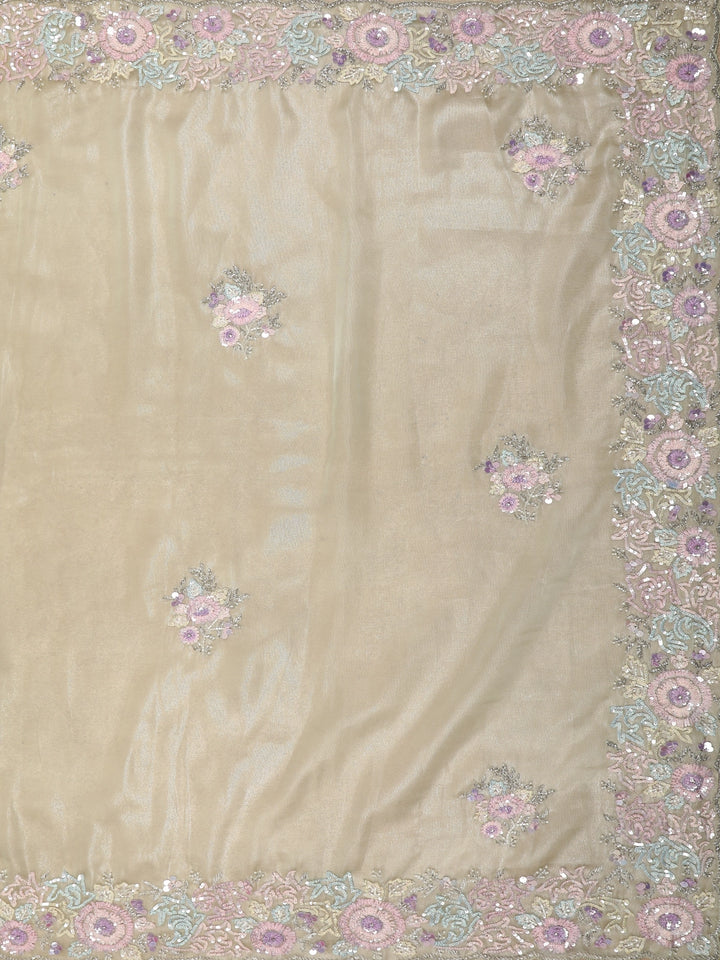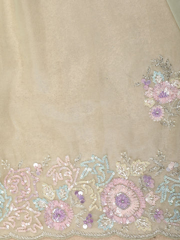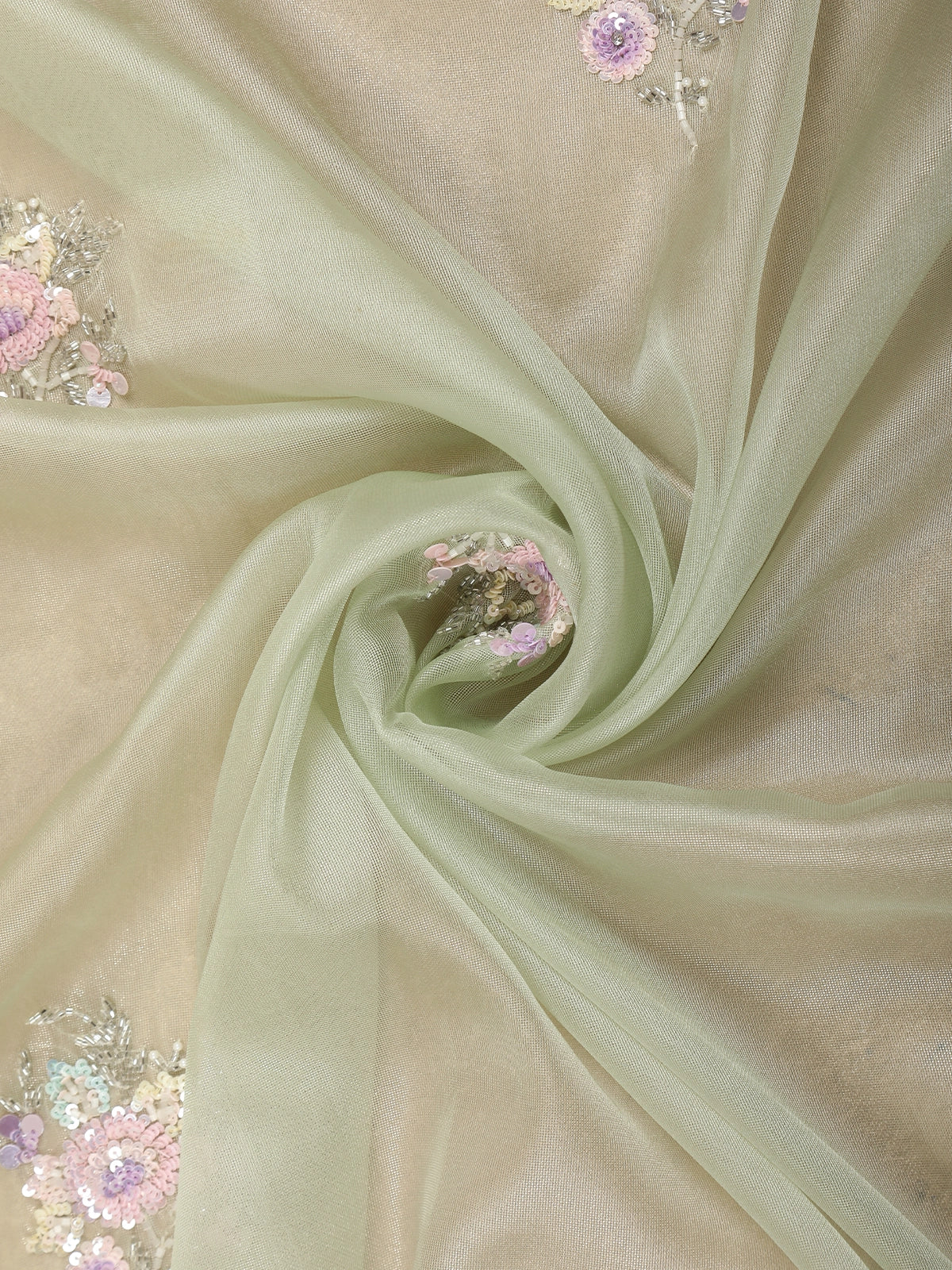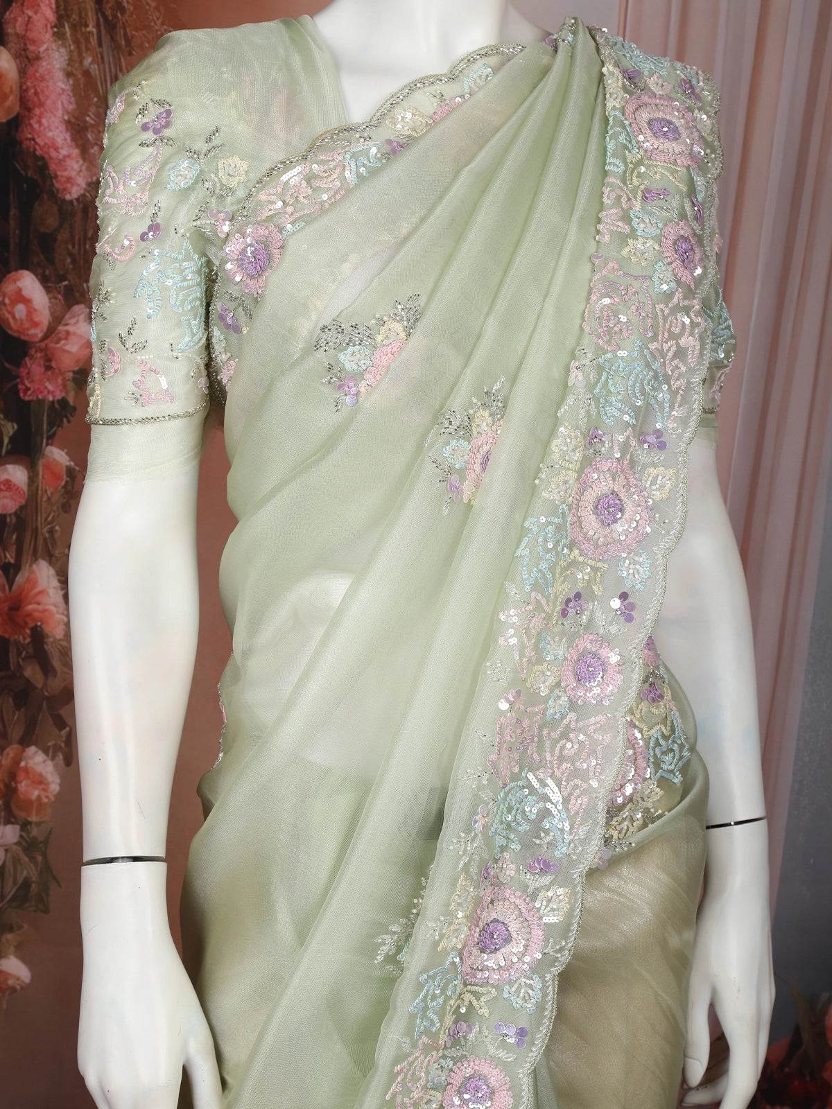 Step into a world of ethereal elegance with this pista green organza saree adorned with delicate floral sequins embroidery. The lightweight organza drape offers a dreamy flow, while the intricately crafted designer border adds a refined charm to your festive look. Paired with a matching green blouse, this saree is a perfect pick for weddings, receptions, and special celebrations where you want to shine with subtle sophistication.