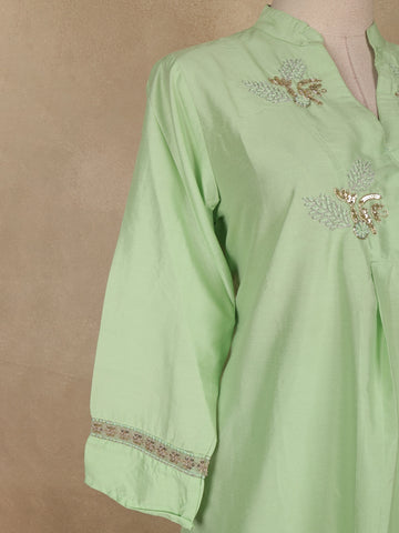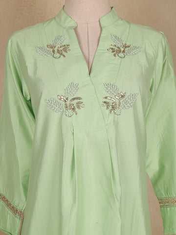 Radiate understated sophistication in this Pista Green Silk Salwar Suit, delicately adorned with floral sequins embroidery that adds a graceful shimmer to its serene pastel hue. The collar neckline lends a smart, contemporary touch, while the 3/4 sleeves detailed with subtle sequin work bring out refined elegance. Crafted from lustrous silk fabric, this ensemble offers both comfort and class.