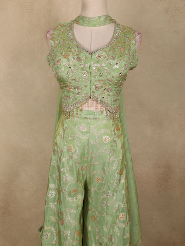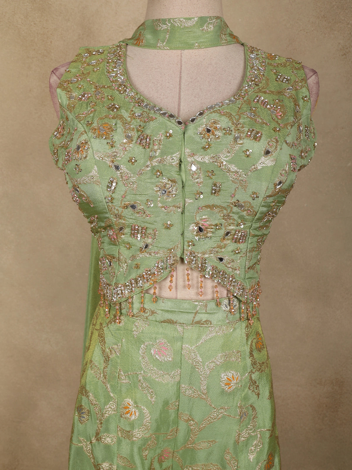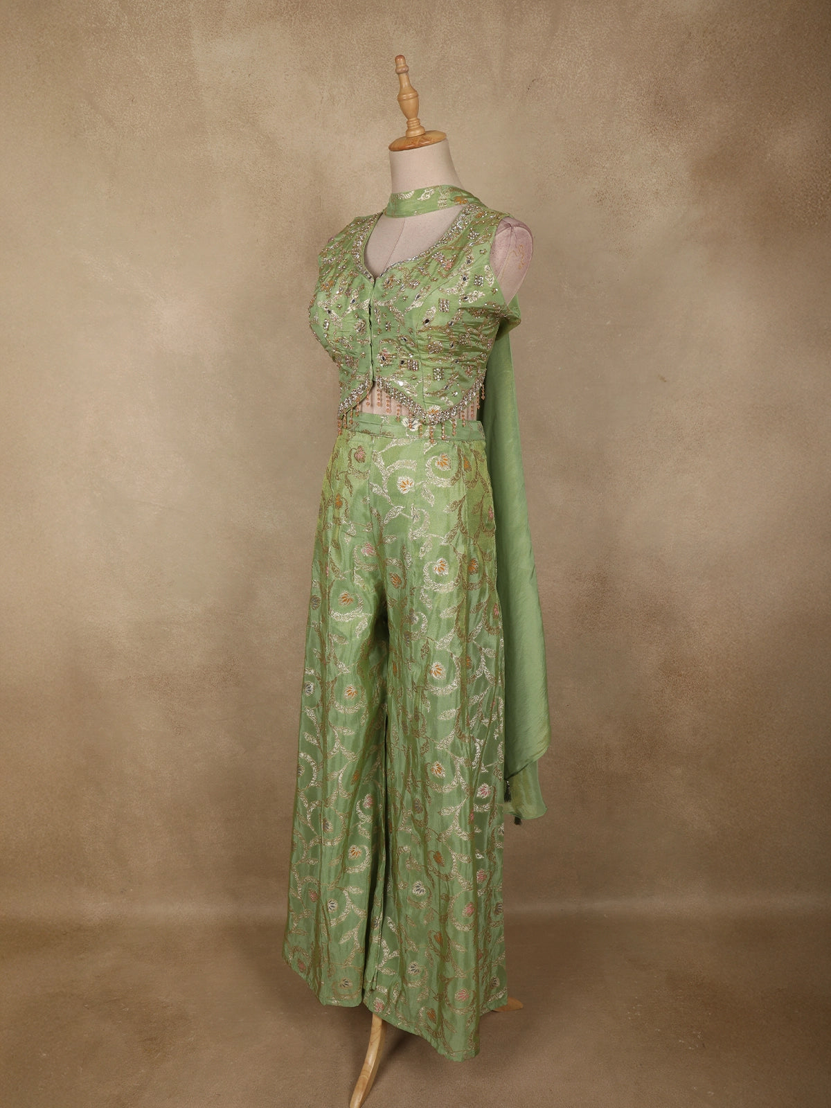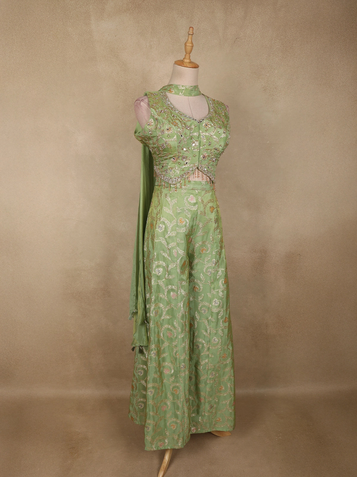 Pistachio Green Floral Sequins Embroidered Design Banarasi Silk Palazzo Suit with Dupatta