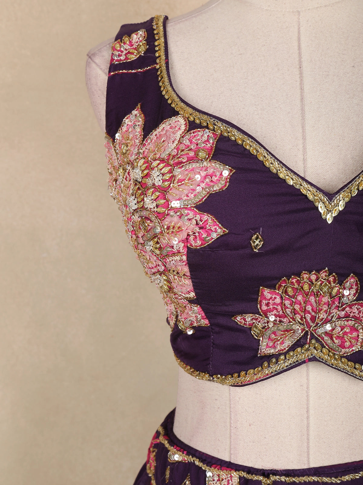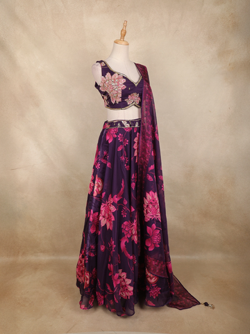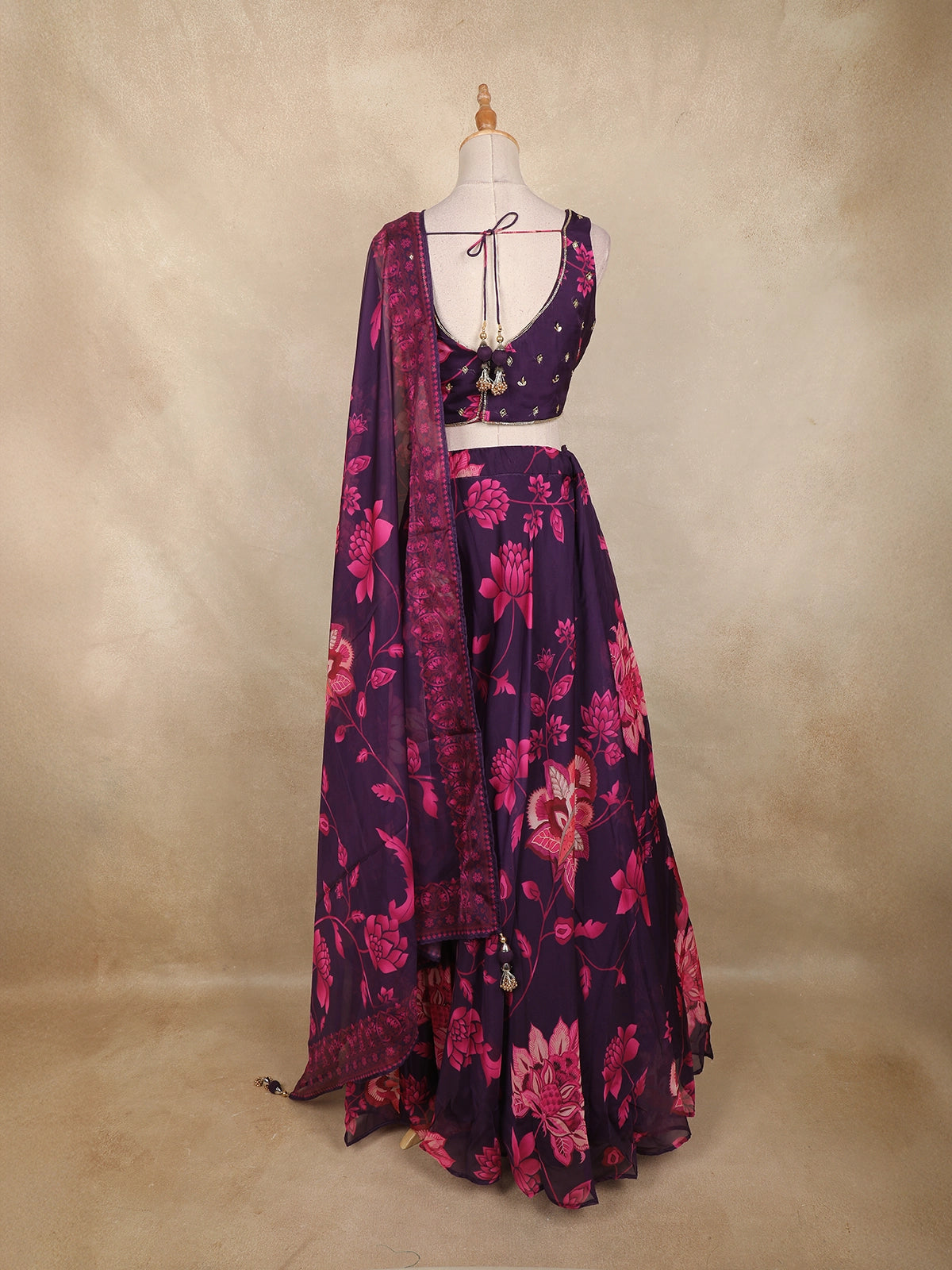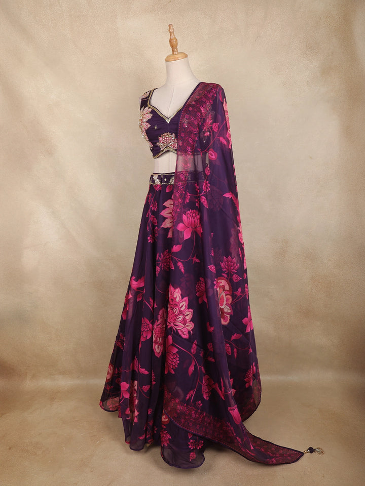Plum Purple Floral Printed Organza Lehenga with Sequins Embroidered Blouse and Dupatta