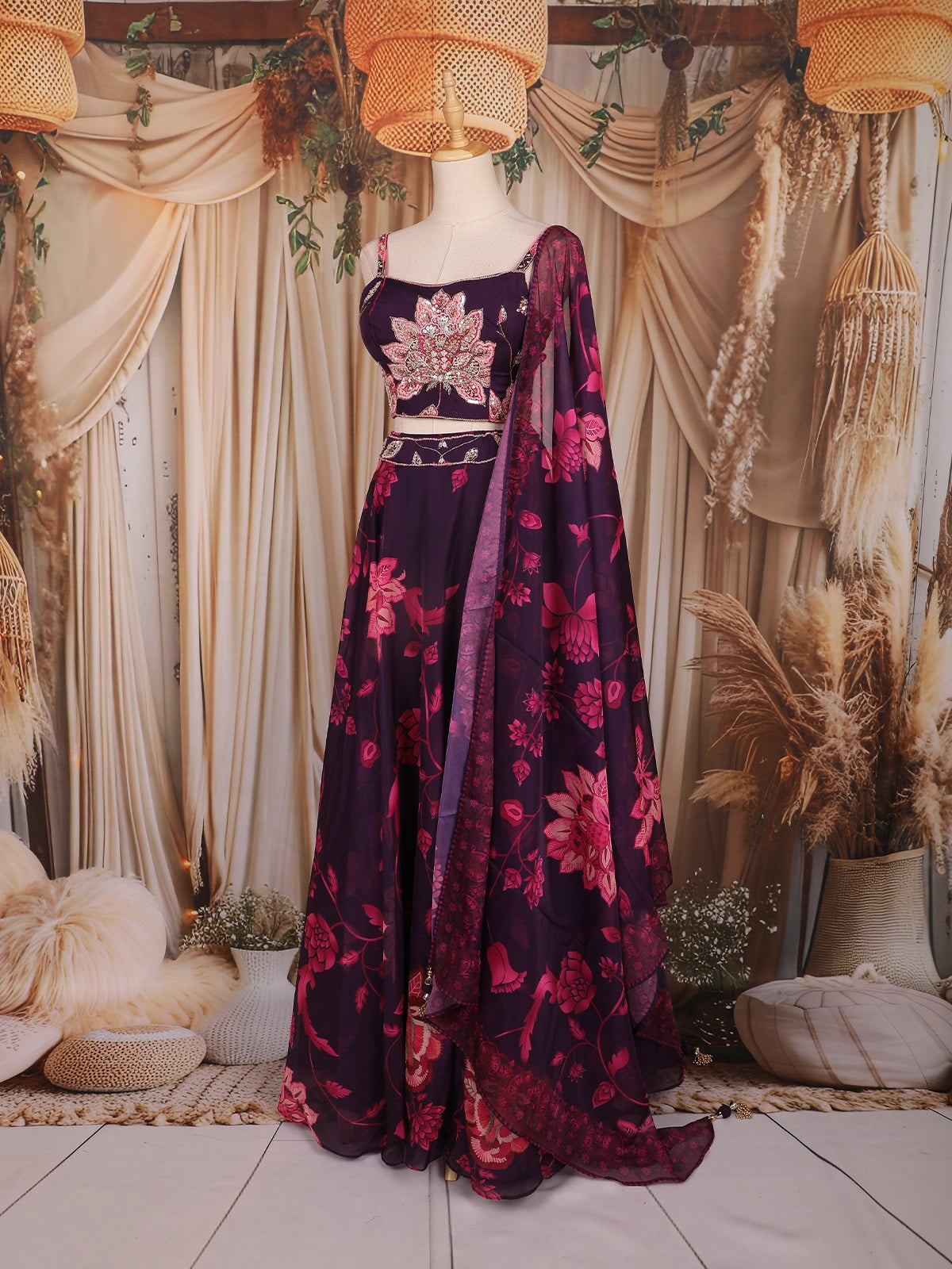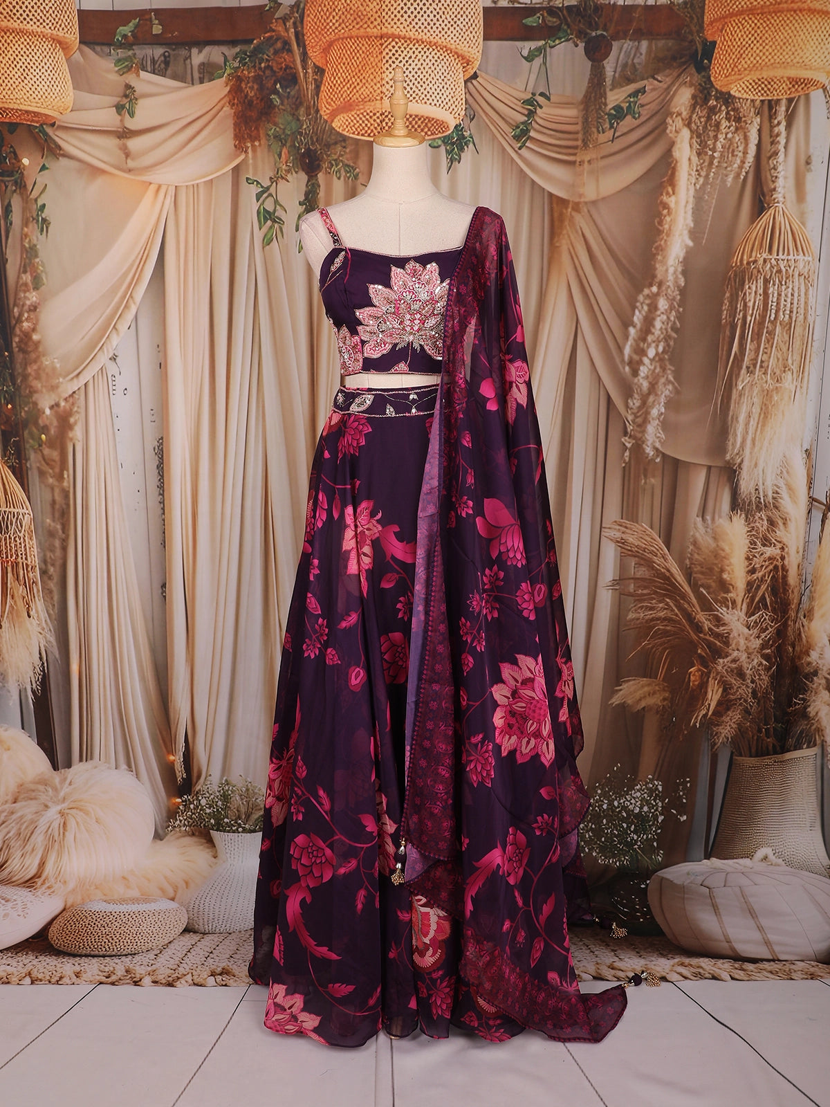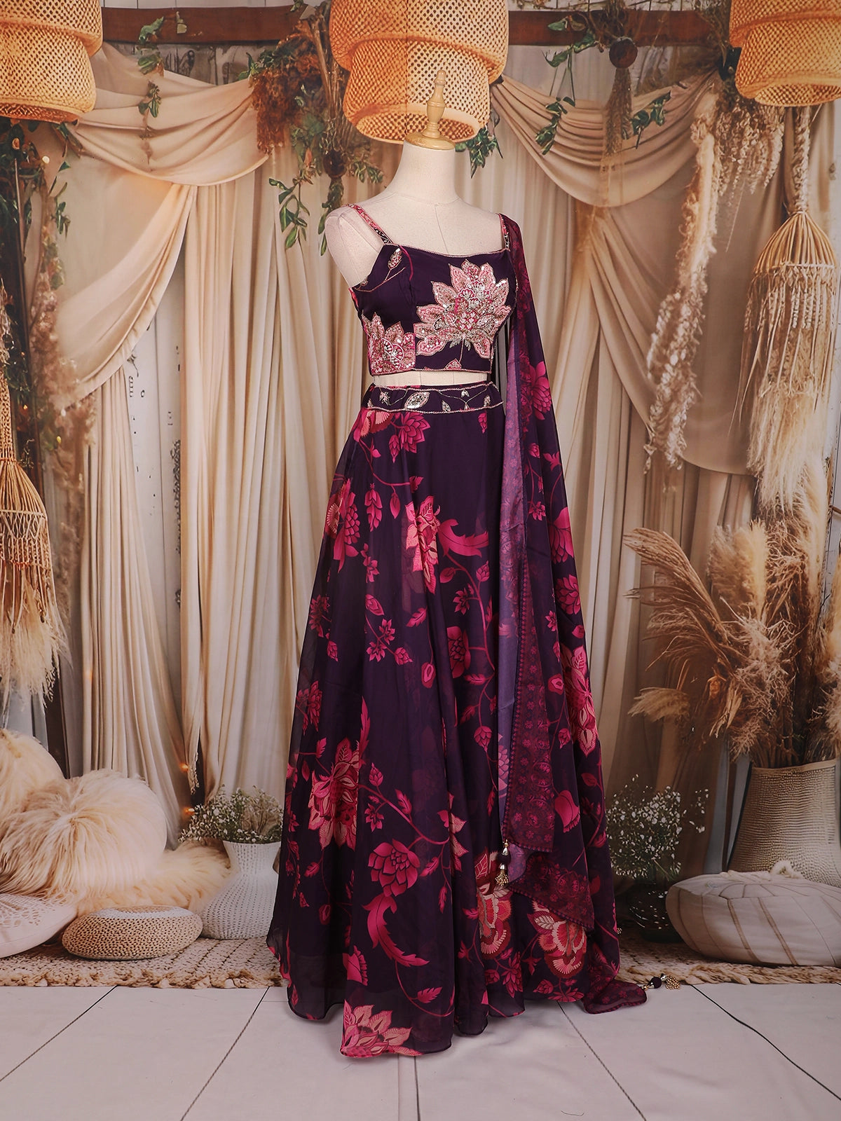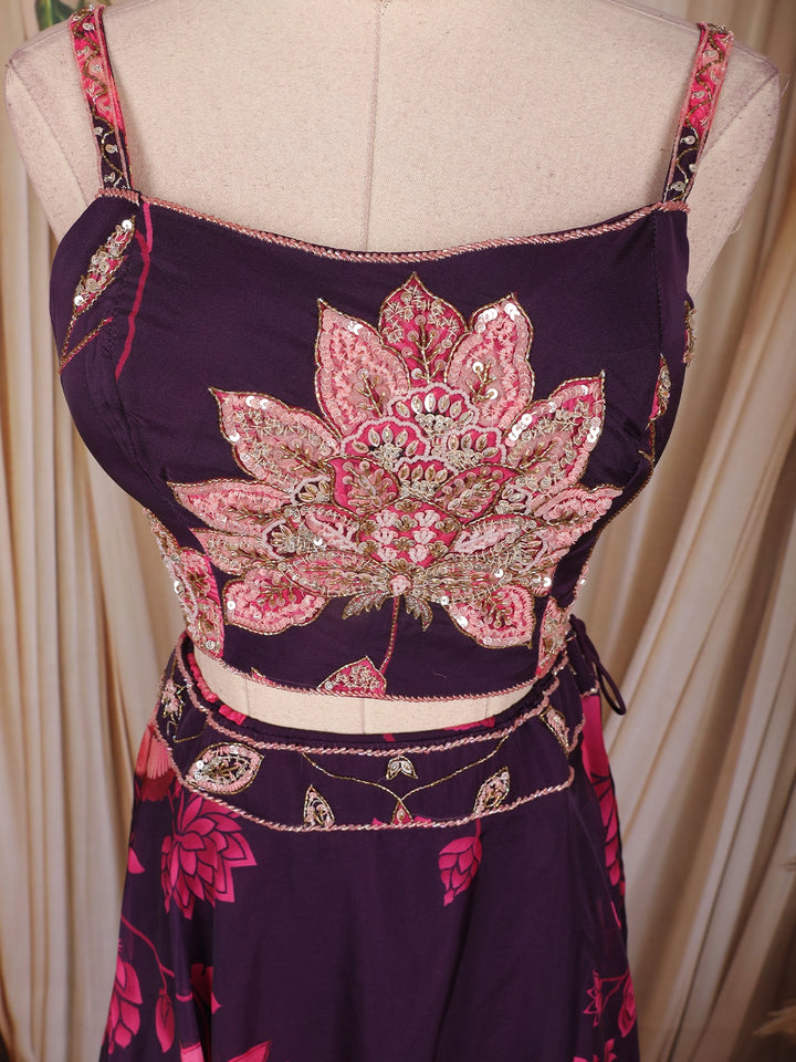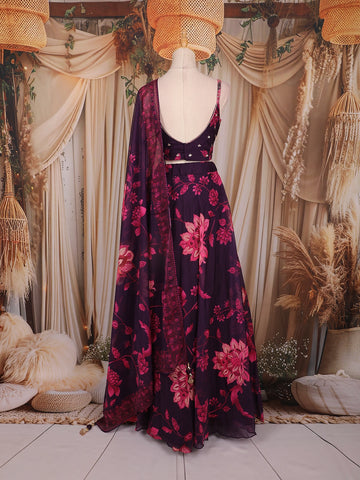 Plum Purple Floral Printed Organza Lehenga with Sequins Embroidered Blouse and Dupatta
