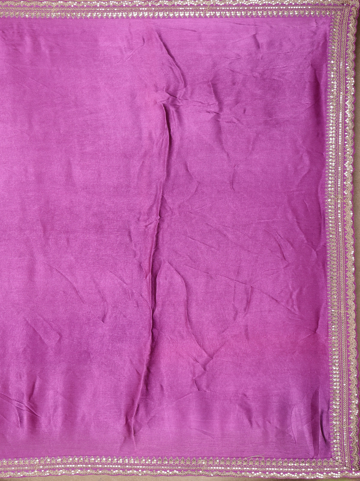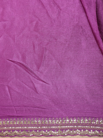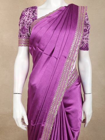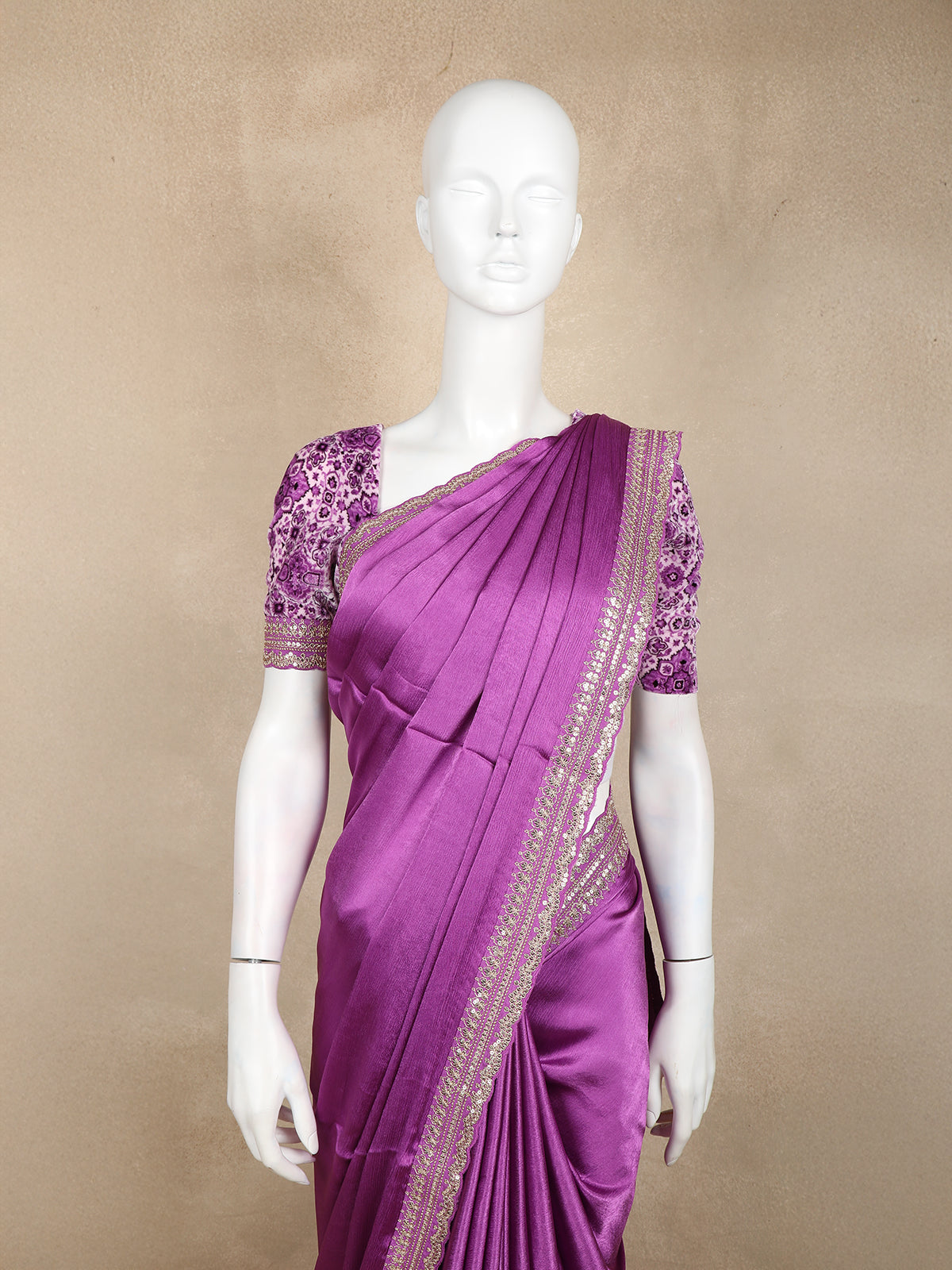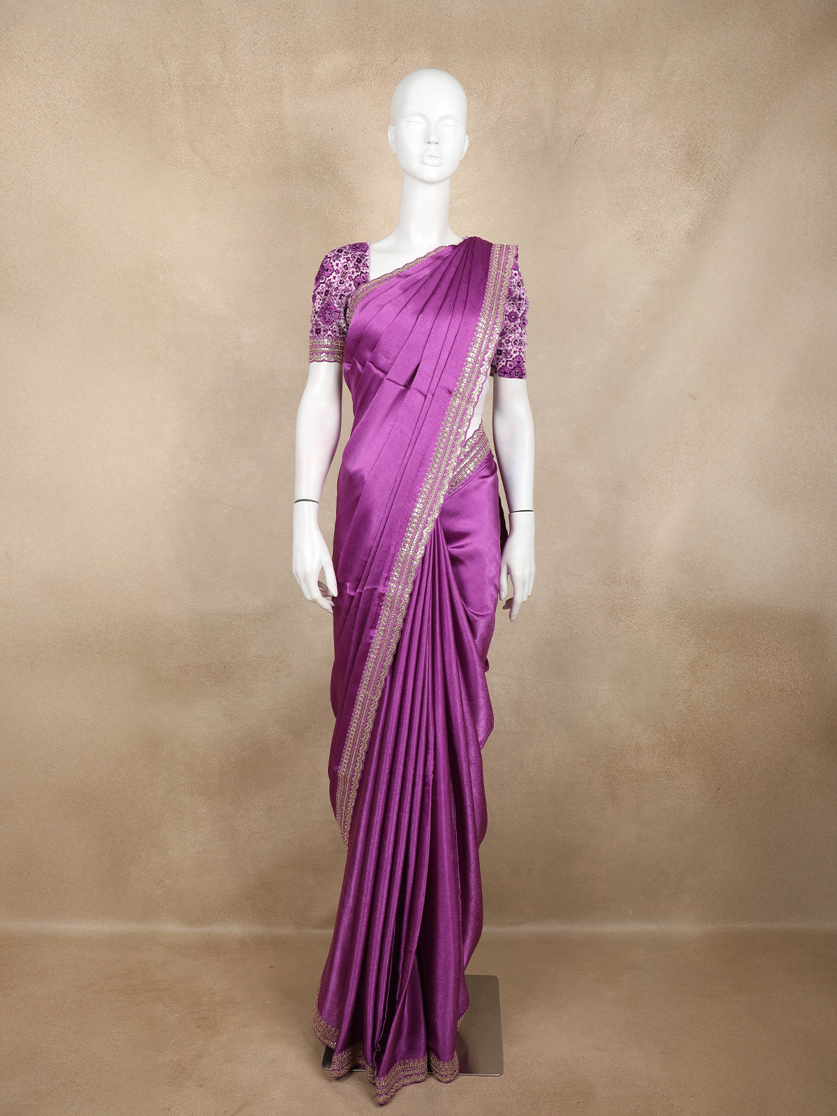 Make a glamorous statement at every celebration with this Plum Satin Saree, designed to drape beautifully with its smooth, glossy finish. The rich plum shade adds an opulent charm, while the designer border embellished with intricate detailing offers a striking festive appeal.