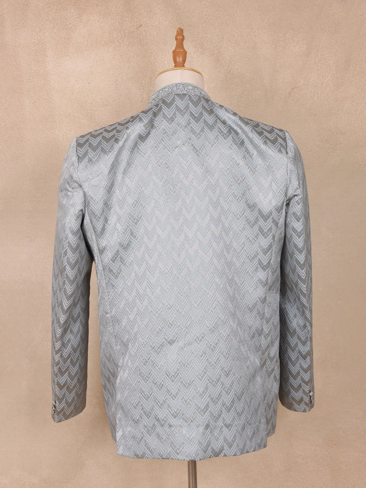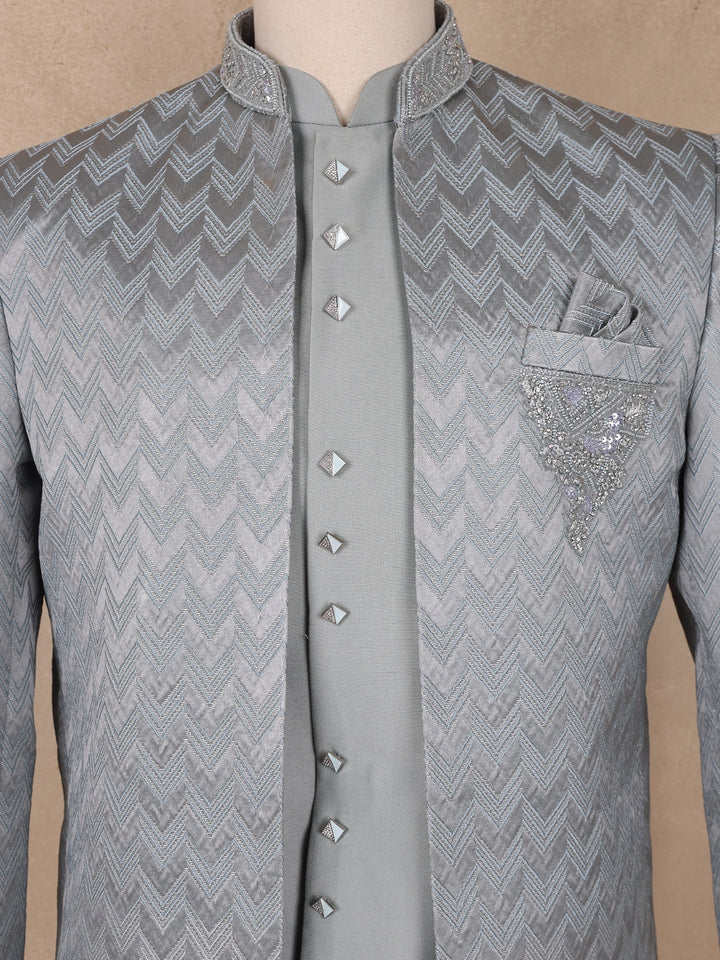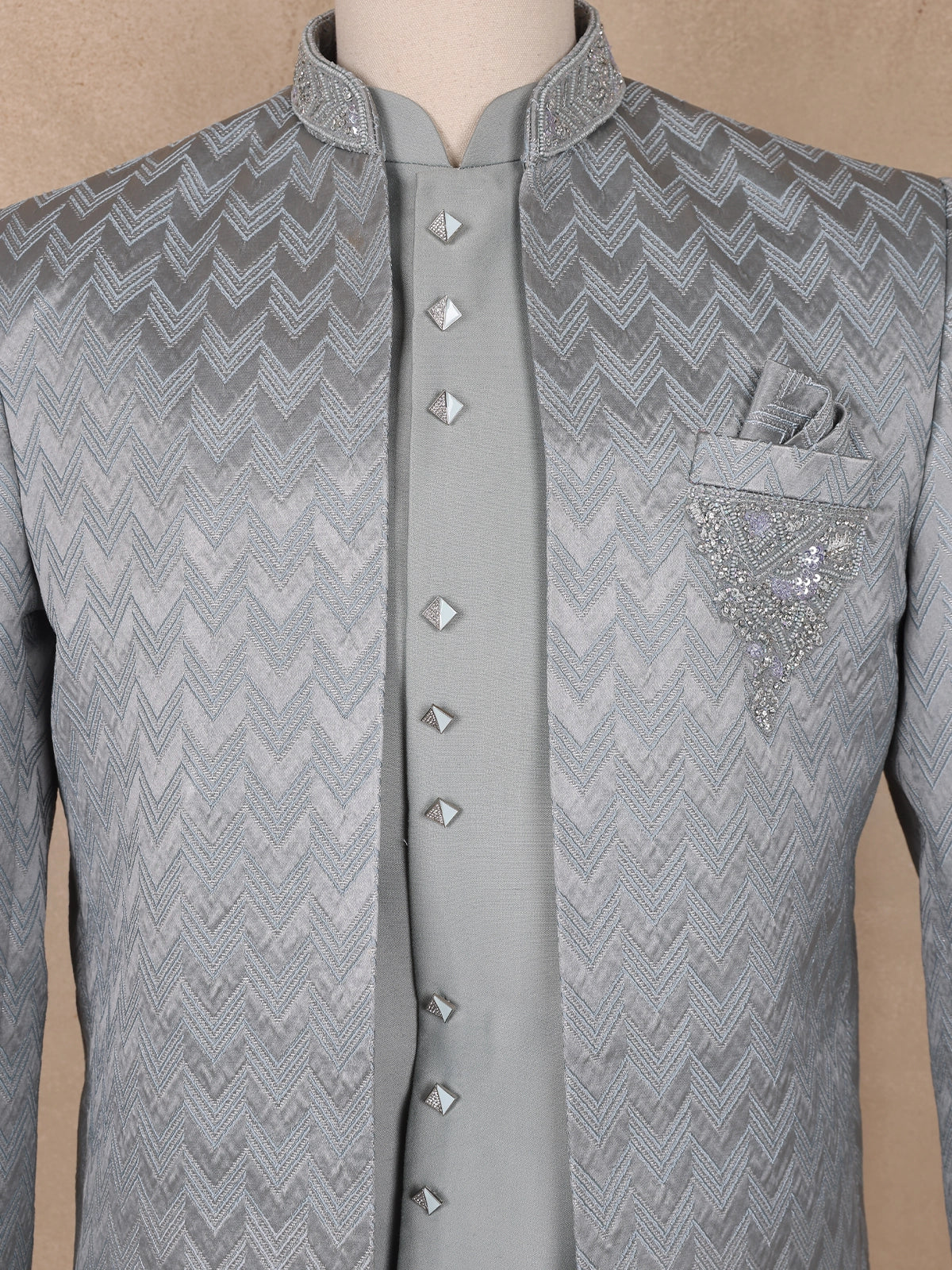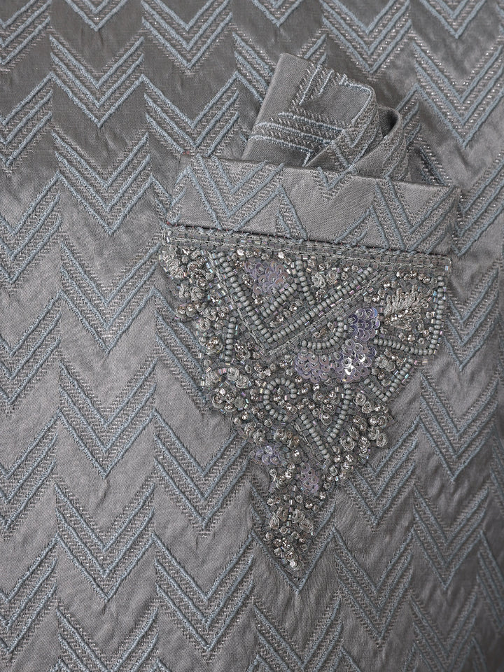 Step into refined elegance with this Powder Blue Arrow Design Jacquard Men's Suit, tailored to perfection for grand occasions. The subtle arrow pattern weaves a modern texture across the suit, while the mandarin collar and pocket are accentuated with delicate embroidery and bead highlights for a regal touch. The powder blue tone lends a soft sophistication, ideal for day or evening functions.
