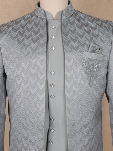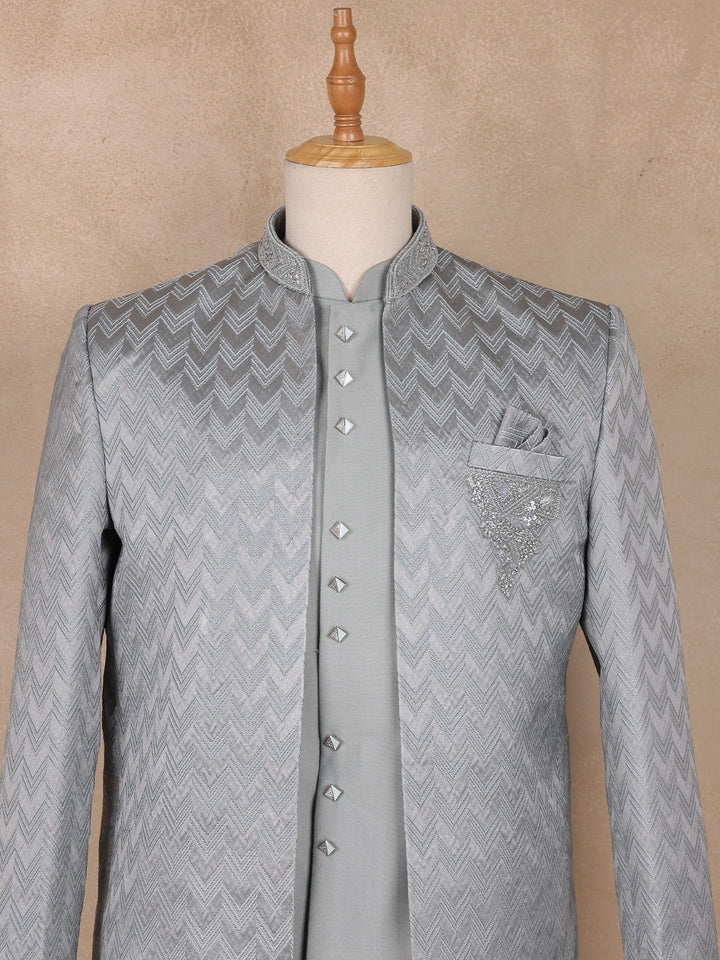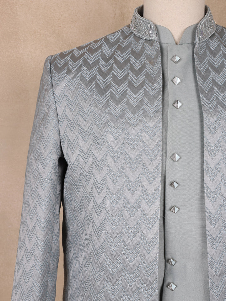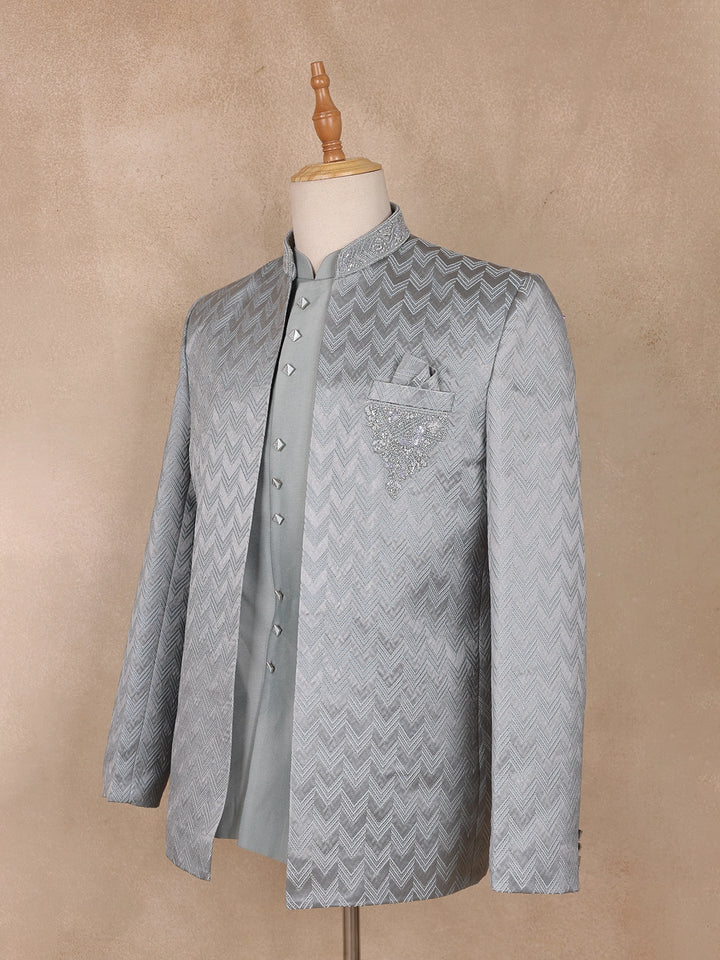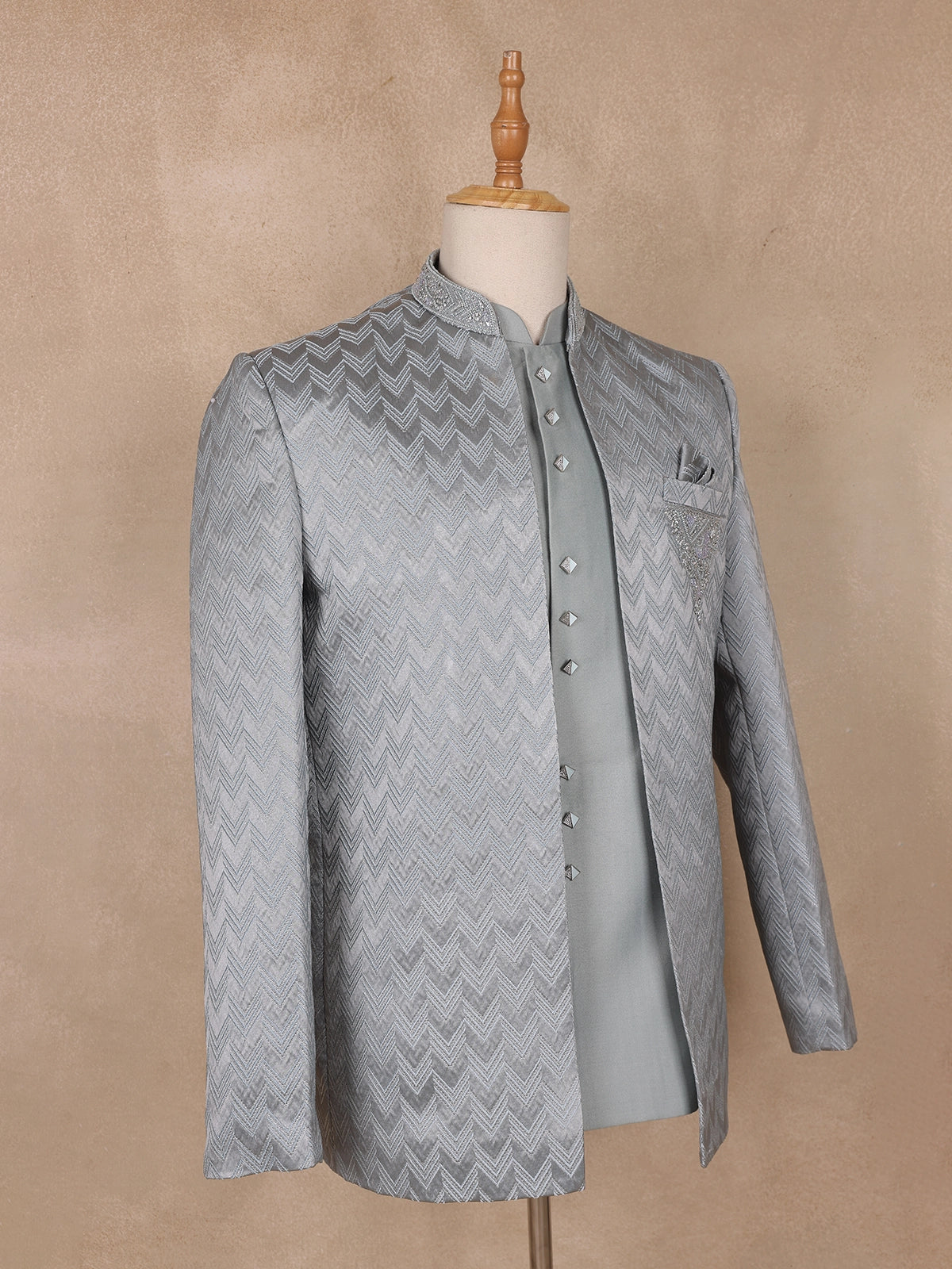 Step into refined elegance with this Powder Blue Arrow Design Jacquard Men's Suit, tailored to perfection for grand occasions. The subtle arrow pattern weaves a modern texture across the suit, while the mandarin collar and pocket are accentuated with delicate embroidery and bead highlights for a regal touch. The powder blue tone lends a soft sophistication, ideal for day or evening functions.