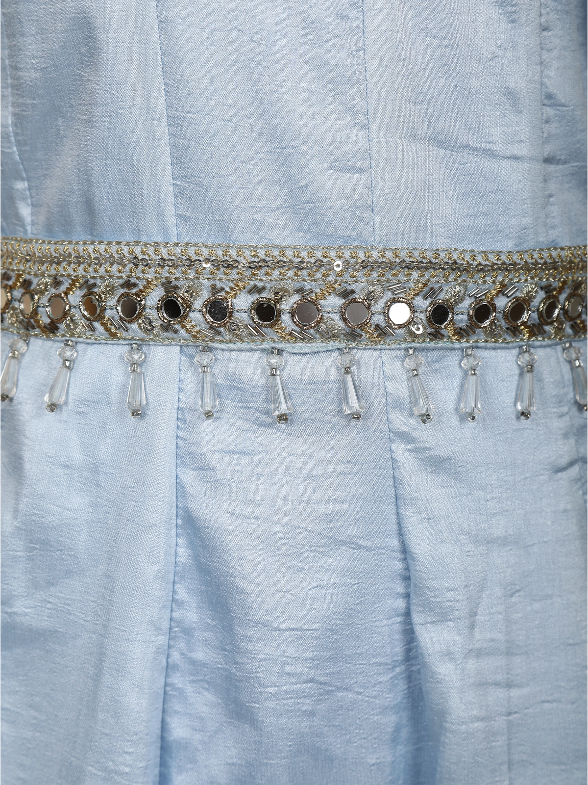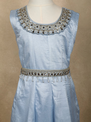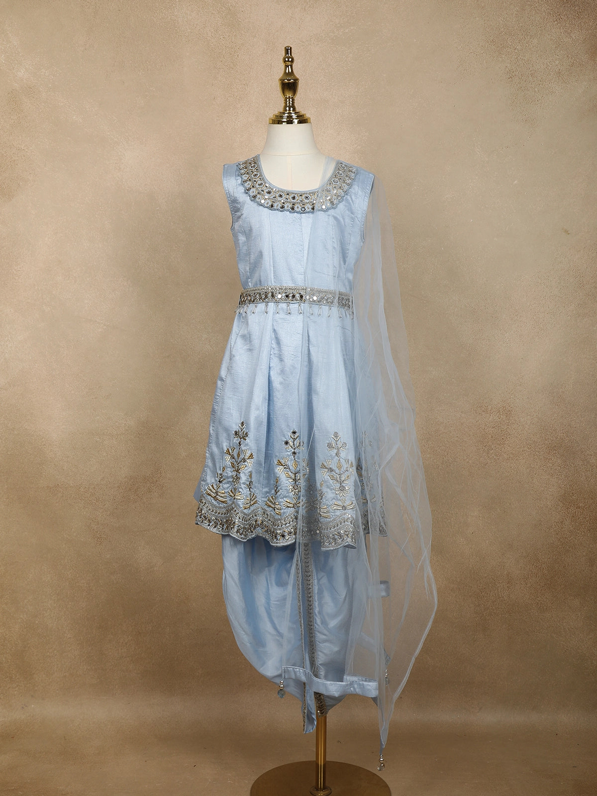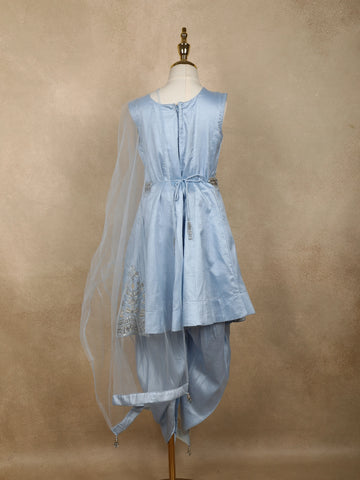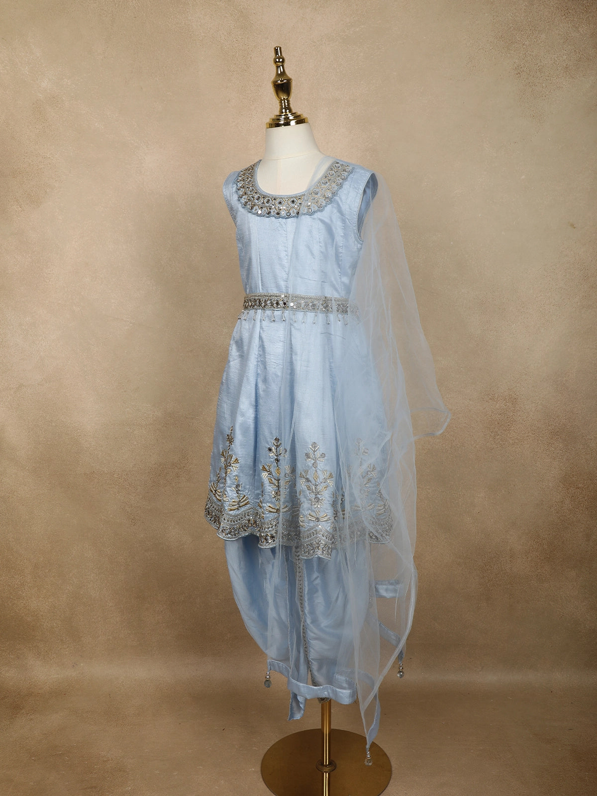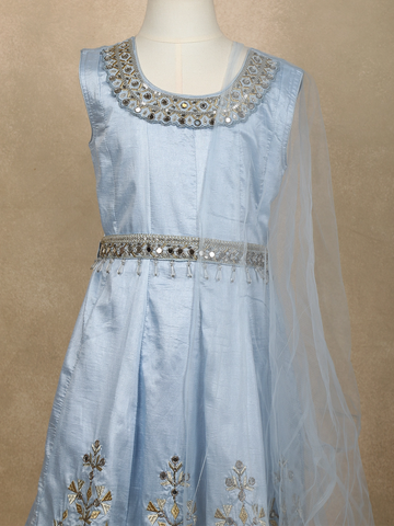 Completing the ensemble is a lightweight net dupatta in a matching powder blue shade, designed with a subtle border and gentle tassel accents for an elegant drape. Perfect for festive celebrations, weddings, receptions, birthdays, and traditional functions, this salwar suit offers a timeless ethnic look with a modern, kid-friendly comfort that makes it a delightful addition to any festive wardrobe.