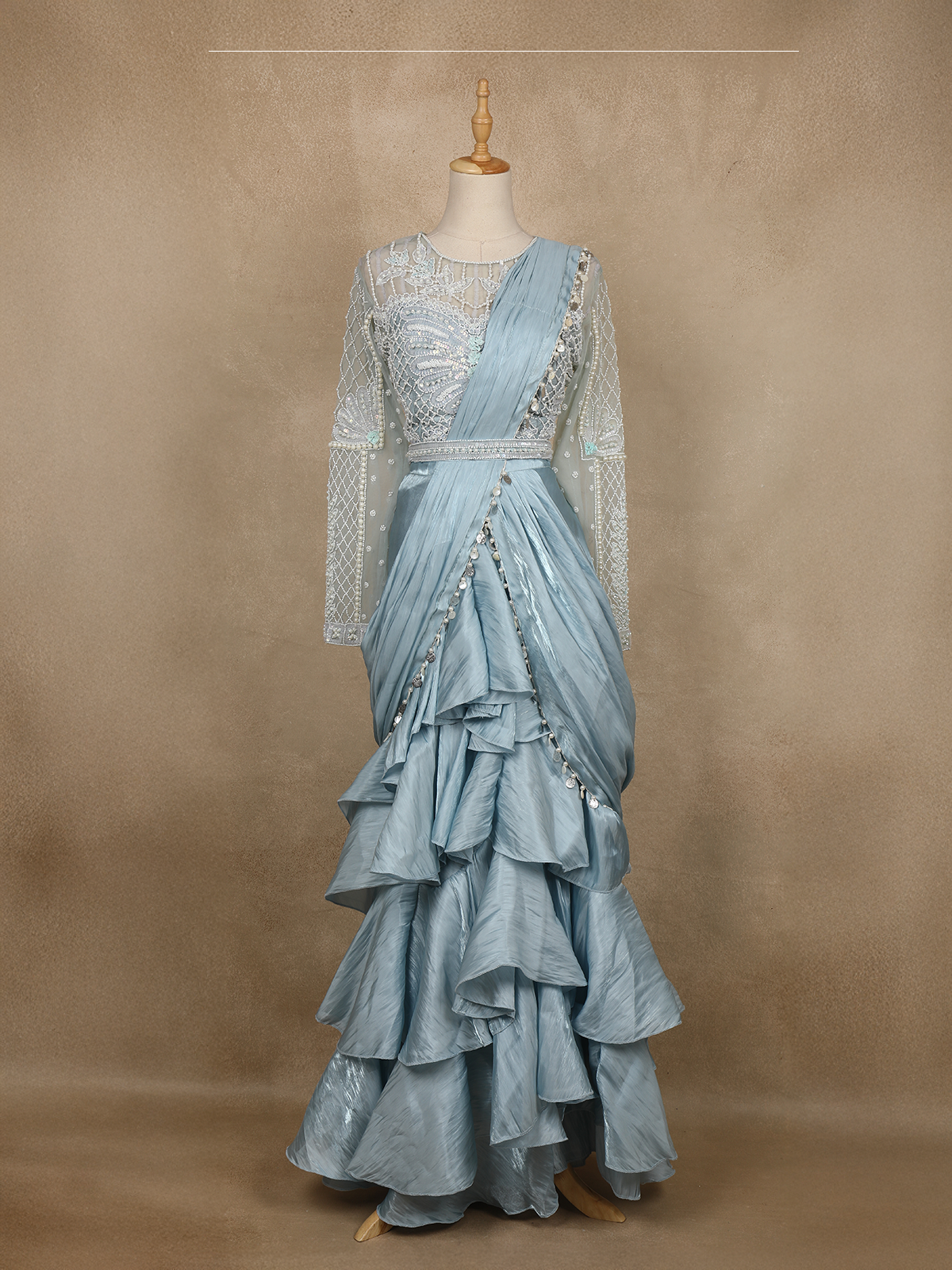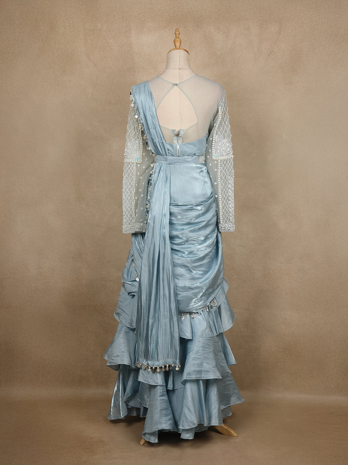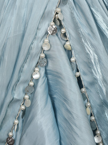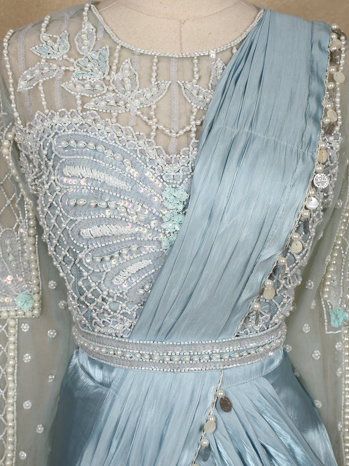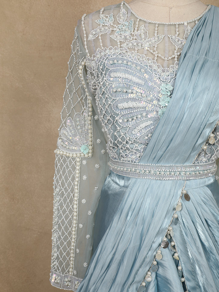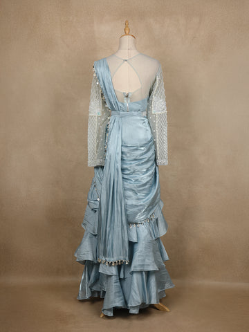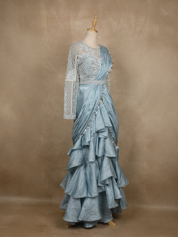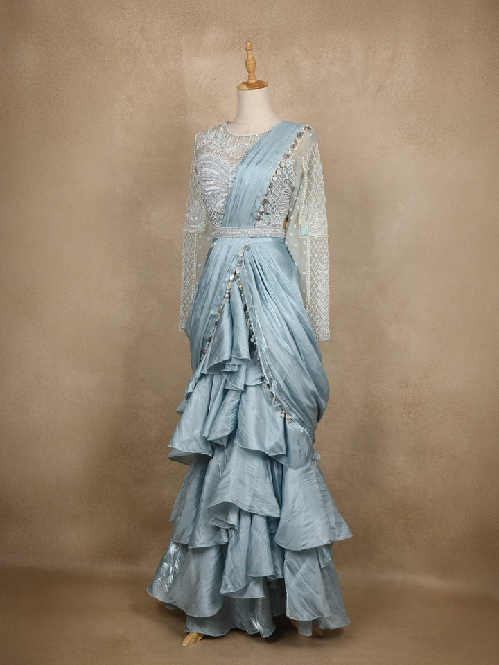 Step into ethereal elegance with this powder blue ruffle saree , a fusion of traditional grace and contemporary sophistication. The bodice features a sheer illusion neckline beautifully adorned with pearl and sequin embroidery, forming delicate floral and geometric patterns.