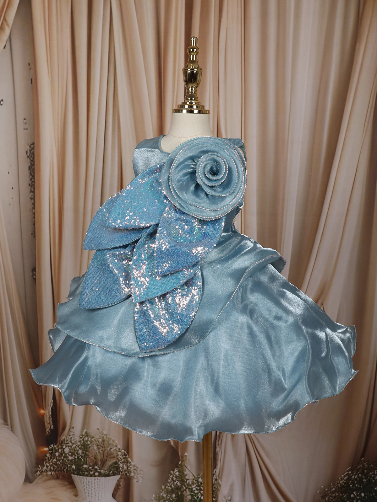 This enchanting kids’ party frock in powder blue organza is the perfect blend of whimsy and elegance, designed to make little ones shine on special occasions.