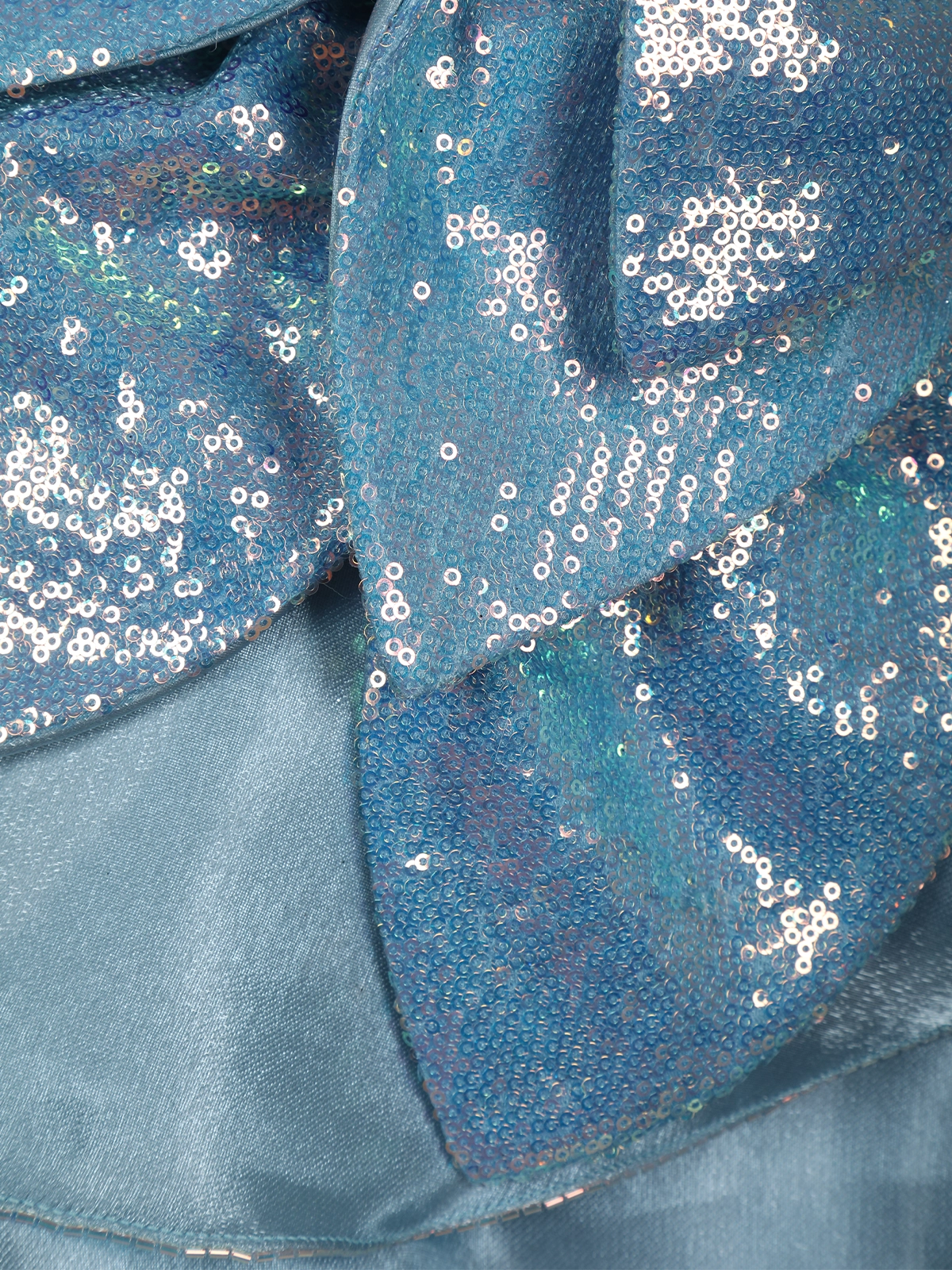 The bodice and layered panels are beautifully adorned with shimmering sequins embroidery, catching the light with every movement and giving the outfit a subtle sparkle. The asymmetrical layered detailing across the front adds dimension and a modern, fashion-forward appeal.