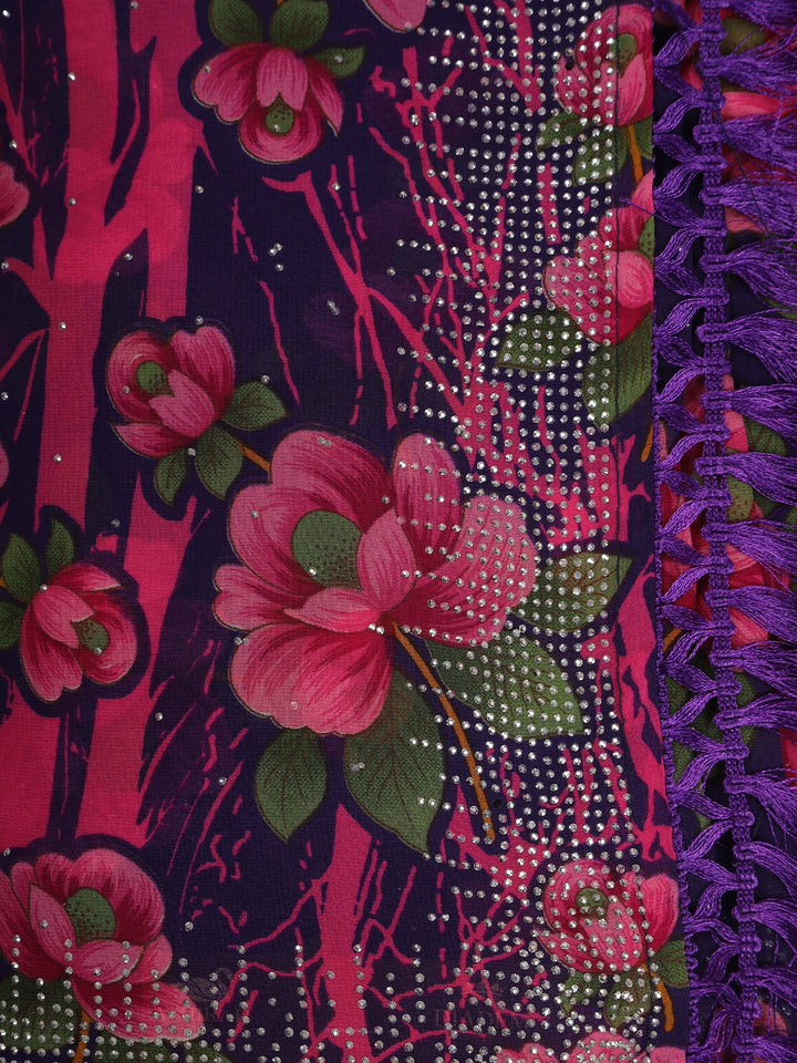 Purple and Pink Floral Printed Design Chiffon Saree with Stone Embellished Border