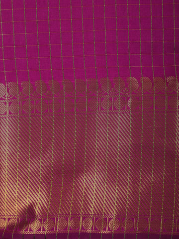 The highlight of the saree is its rich antique gold zari border, beautifully woven with traditional motifs that add a touch of heritage charm. The subtle sheen of the zari contrasts perfectly with the checked body, creating a balanced blend of tradition and sophistication. The pallu continues the zari detailing, completing the look with understated grandeur.