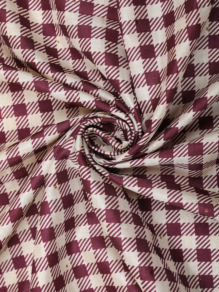 Elevate your ethnic wardrobe with this Wine Purple Checks Semi-Tussar Saree, a seamless fusion of sophistication and timeless charm. Designed in an evergreen checked pattern, the saree brings a touch of refined minimalism while the designer border adds a graceful burst of traditional elegance, making it a standout piece for any celebration.