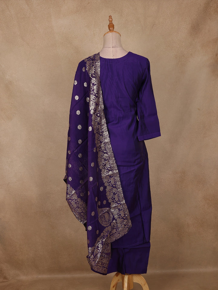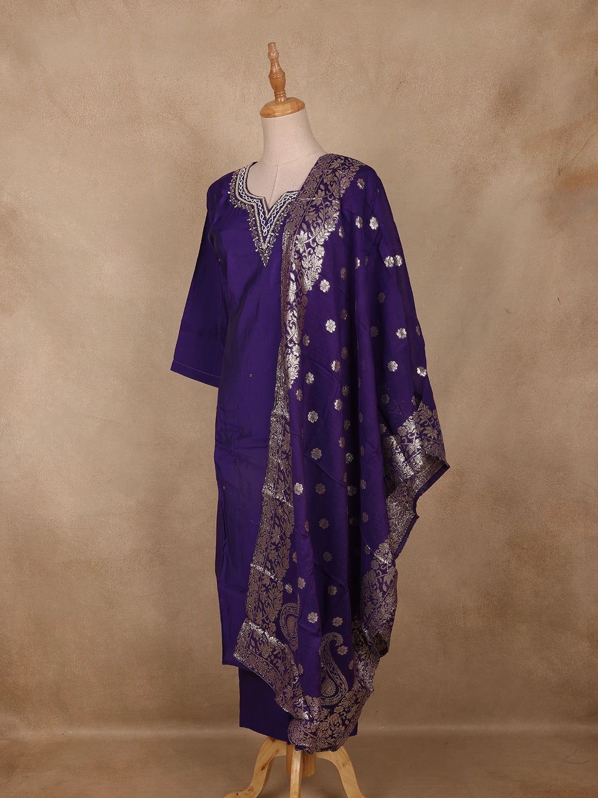 Purple Embroidered Cotton Salwar Suit with Banarasi Dupatta