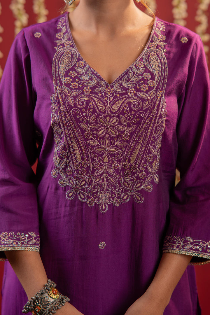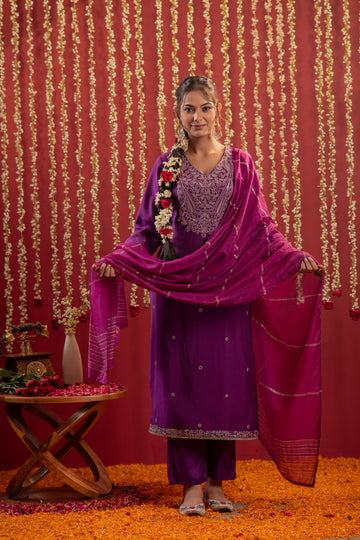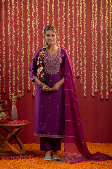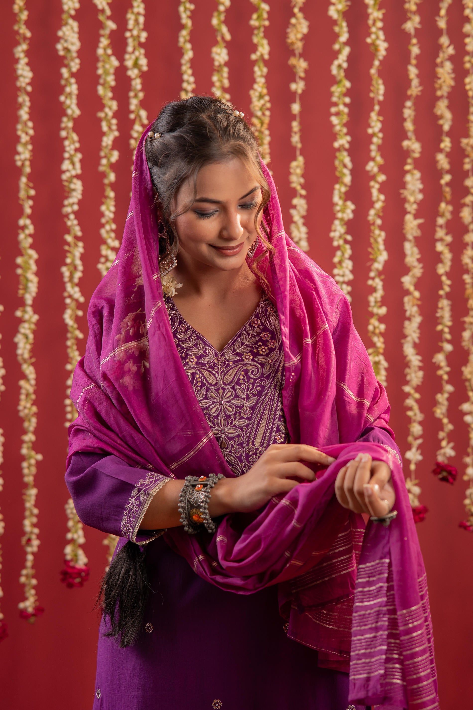 Elevate your festive look with this elegant purple cotton salwar suit, highlighted with beautifully curated floral and paisley embroidery on the neckline and sleeves. The soft cotton fabric ensures all-day comfort, while the carefully detailed thread and sequin embellishments add a refined traditional touch. Paired with a matching dupatta featuring subtle zari stripes, this set strikes the perfect balance between simplicity and celebration-ready charm.