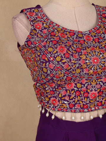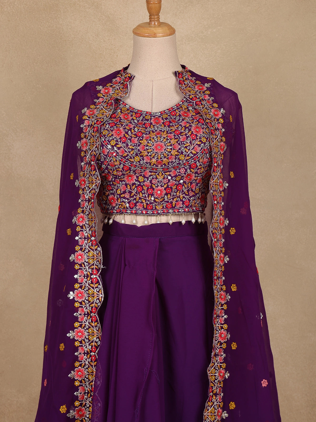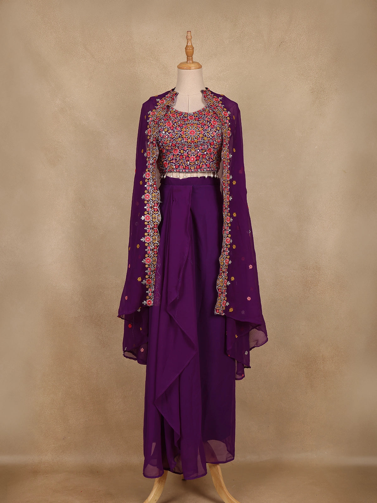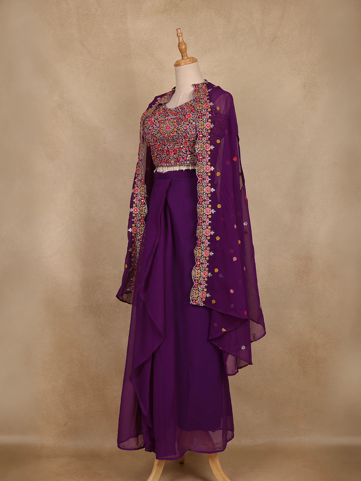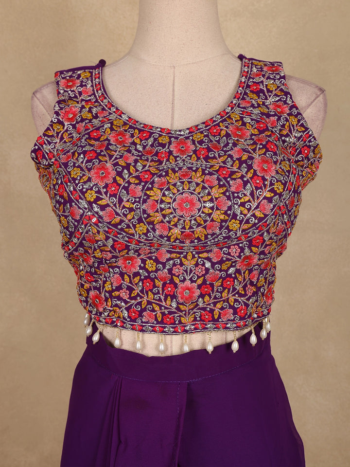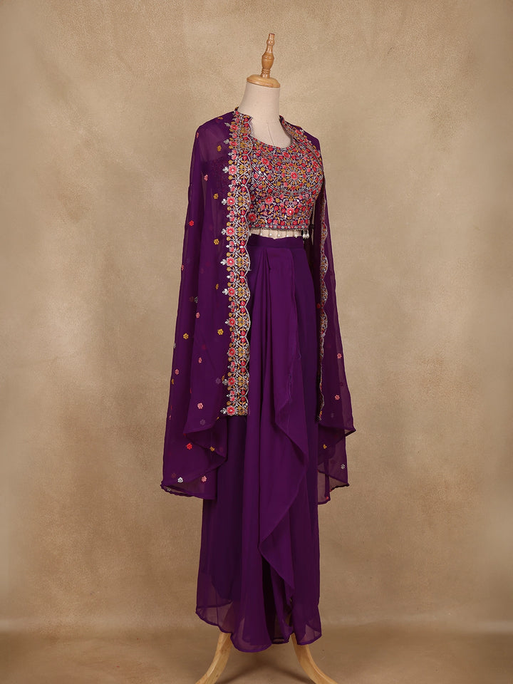 Elevate your festive look with this Purple Floral Design Georgette Skirt Top with Cape, blending modern charm with ethnic finesse.