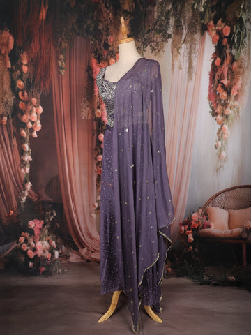 Perfect for festive occasions, receptions, evening parties, and celebratory gatherings, this purple palazzo suit beautifully blends refined craftsmanship with modern aesthetics—an ideal choice for those who love understated glamour with a statement appeal.
