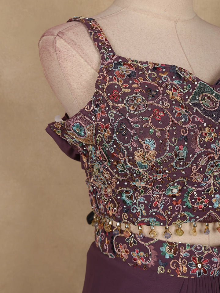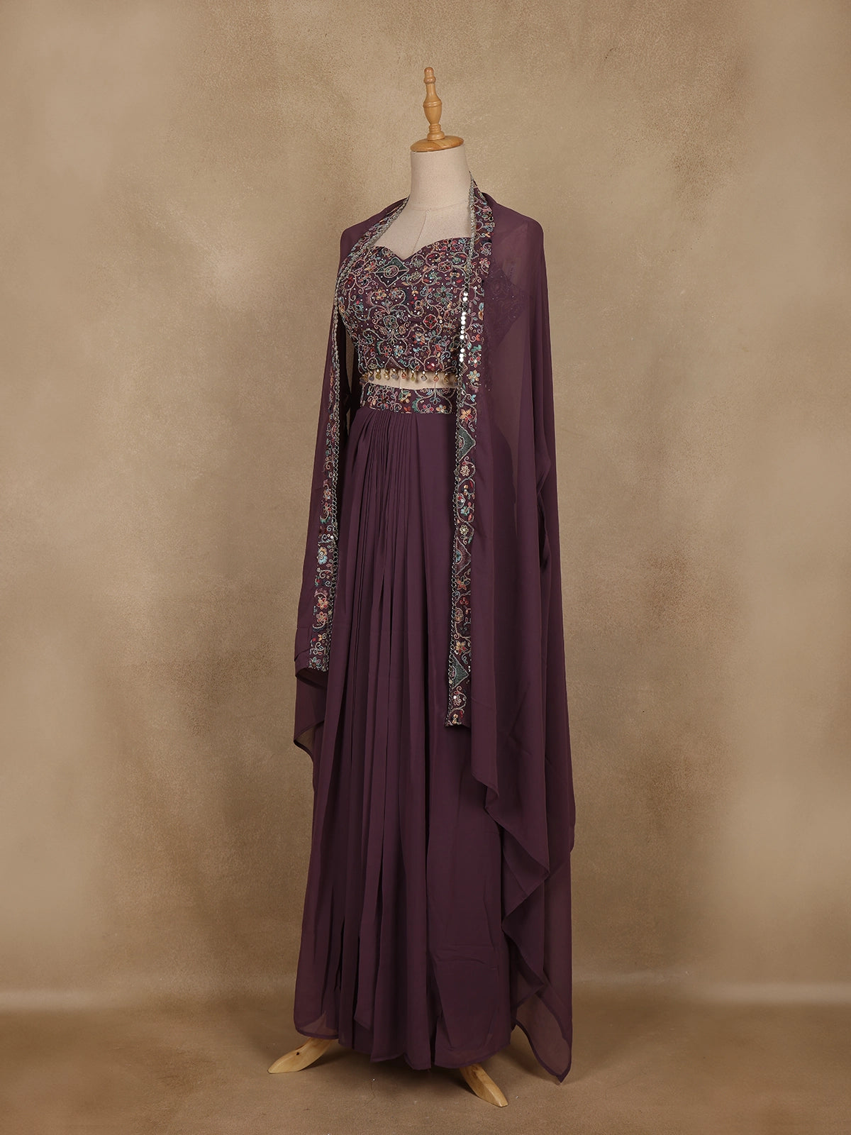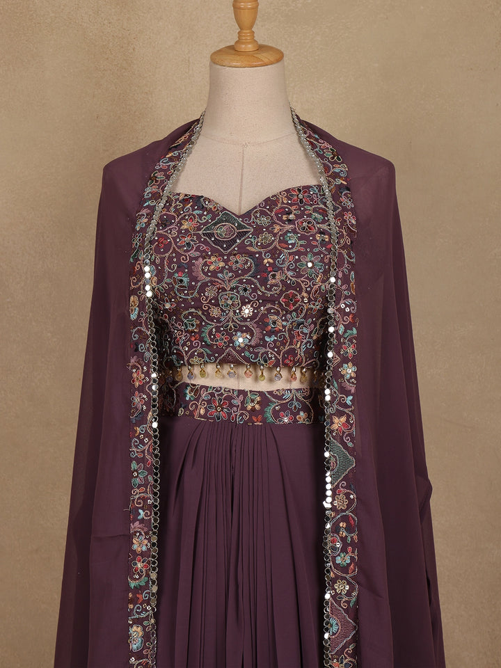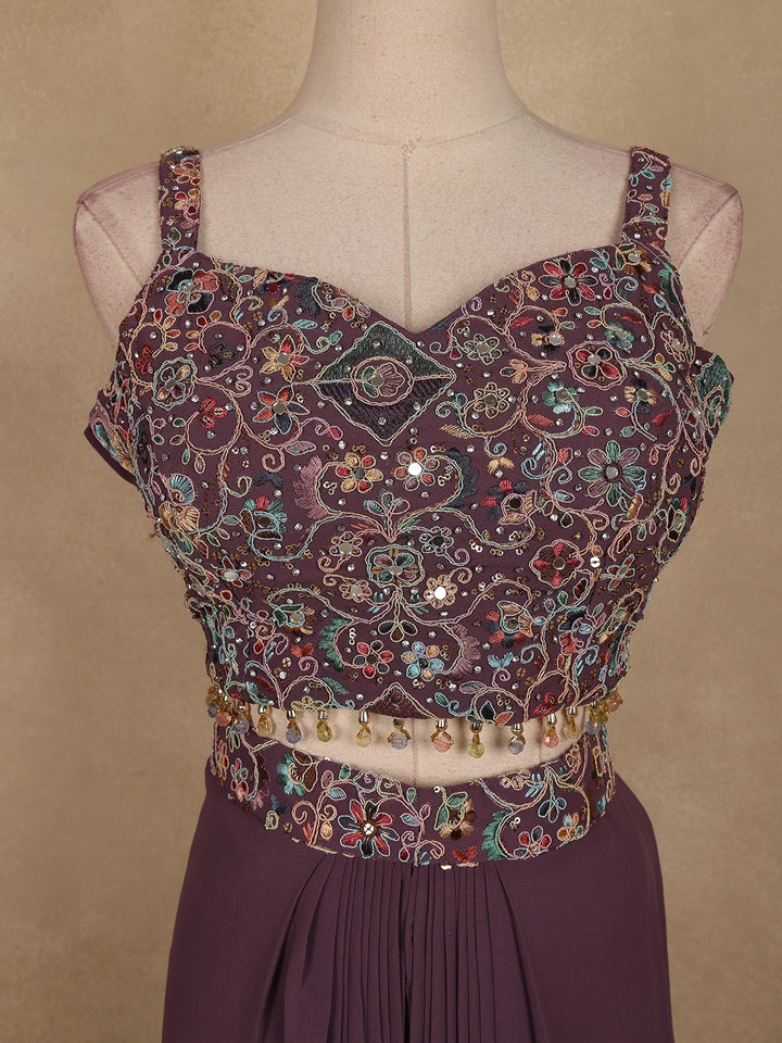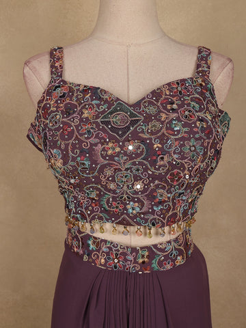 Radiate charm in this Purple Floral Embroidered Georgette Skirt Top Set, crafted to perfection for modern festive flair. The sleeveless top features a graceful sweetheart neckline, beautifully accentuated with intricate floral embroidery that adds a touch of elegance. Paired with a flowing georgette skirt, the ensemble drapes effortlessly, offering both comfort and style.
