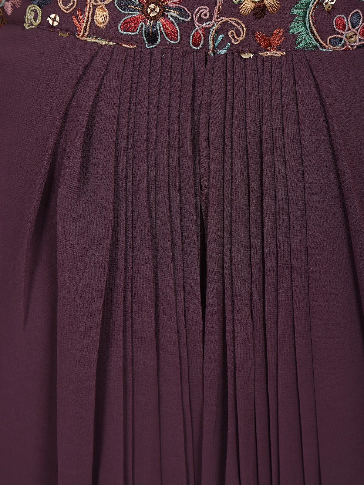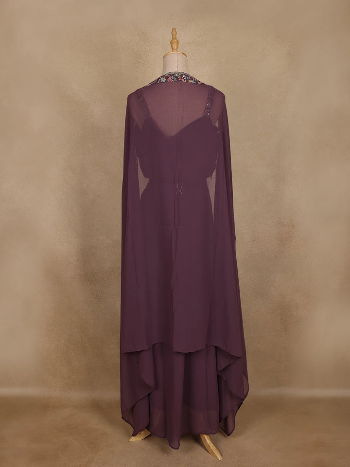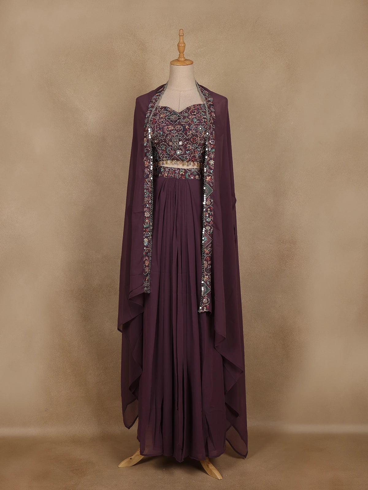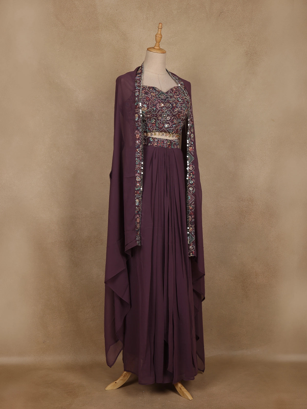 Radiate charm in this Purple Floral Embroidered Georgette Skirt Top Set, crafted to perfection for modern festive flair. The sleeveless top features a graceful sweetheart neckline, beautifully accentuated with intricate floral embroidery that adds a touch of elegance. Paired with a flowing georgette skirt, the ensemble drapes effortlessly, offering both comfort and style.