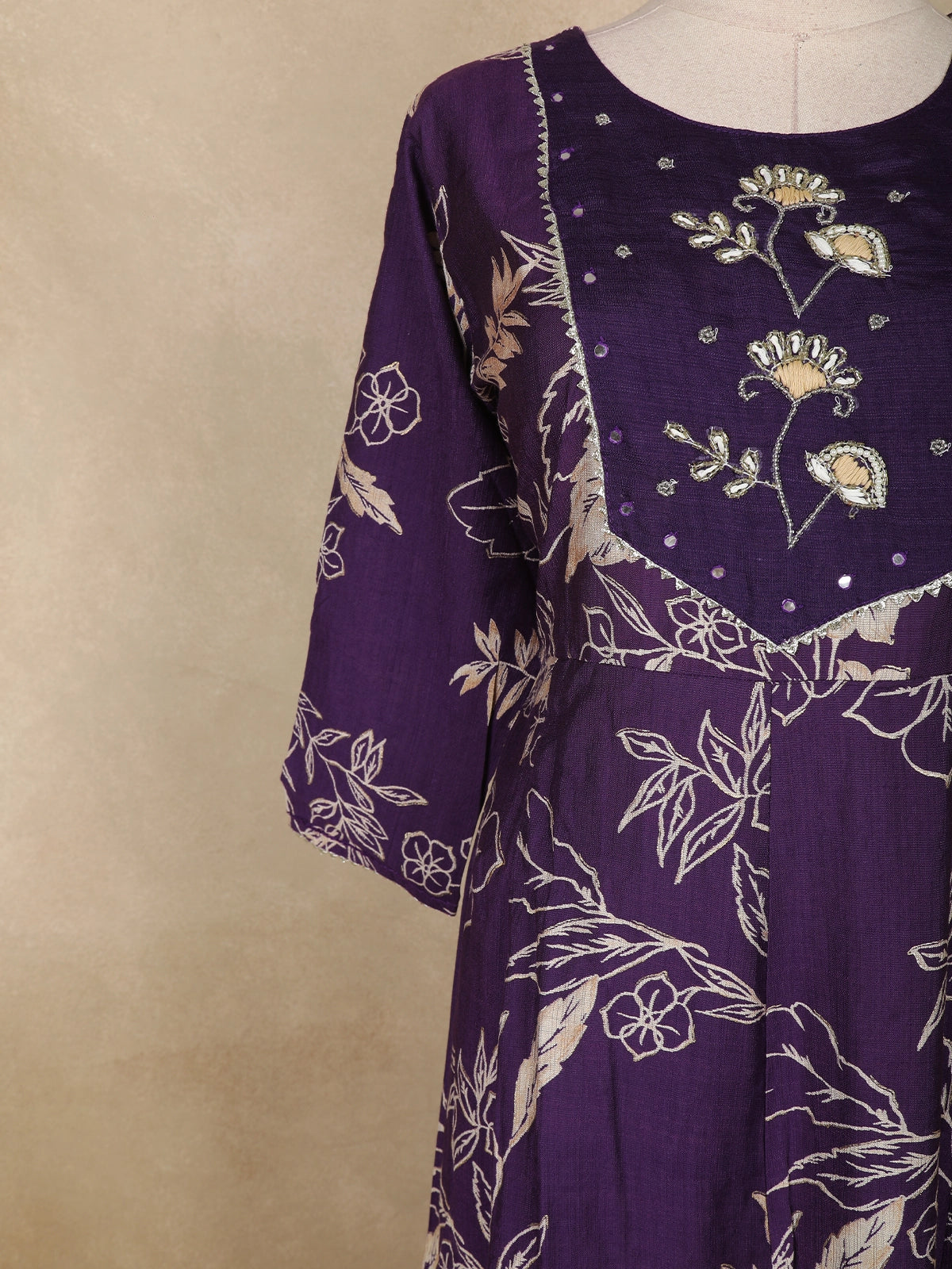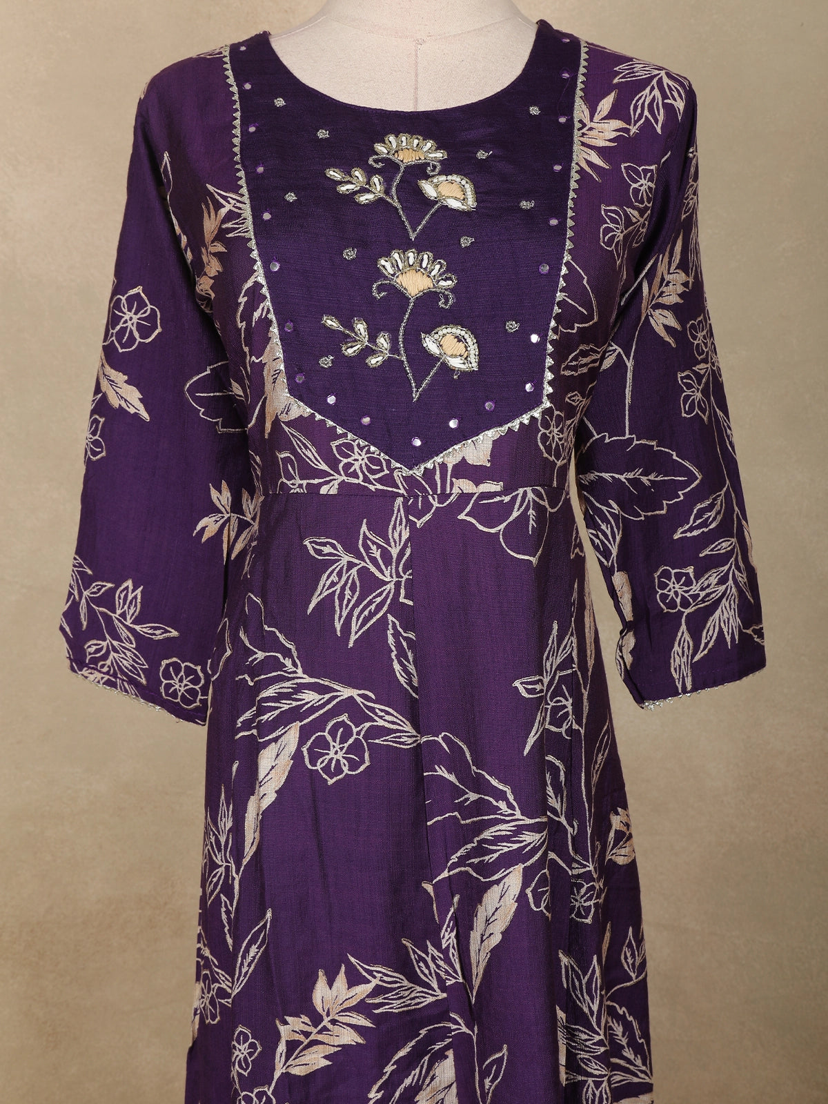 The highlight of the ensemble is its embroidered yoke panel, adorned with delicate threadwork and tiny mirror accents that add a charming touch of sparkle without overpowering the outfit. The soft 3/4 sleeves maintain comfort, making it ideal for all-day wear.