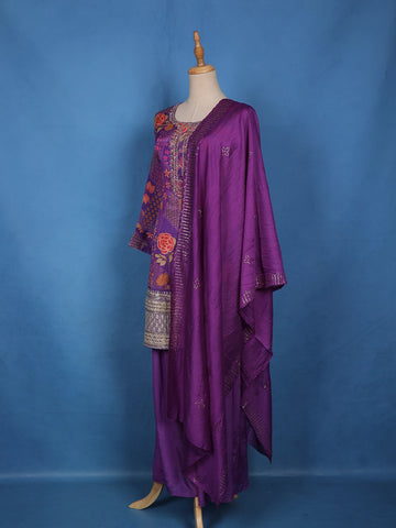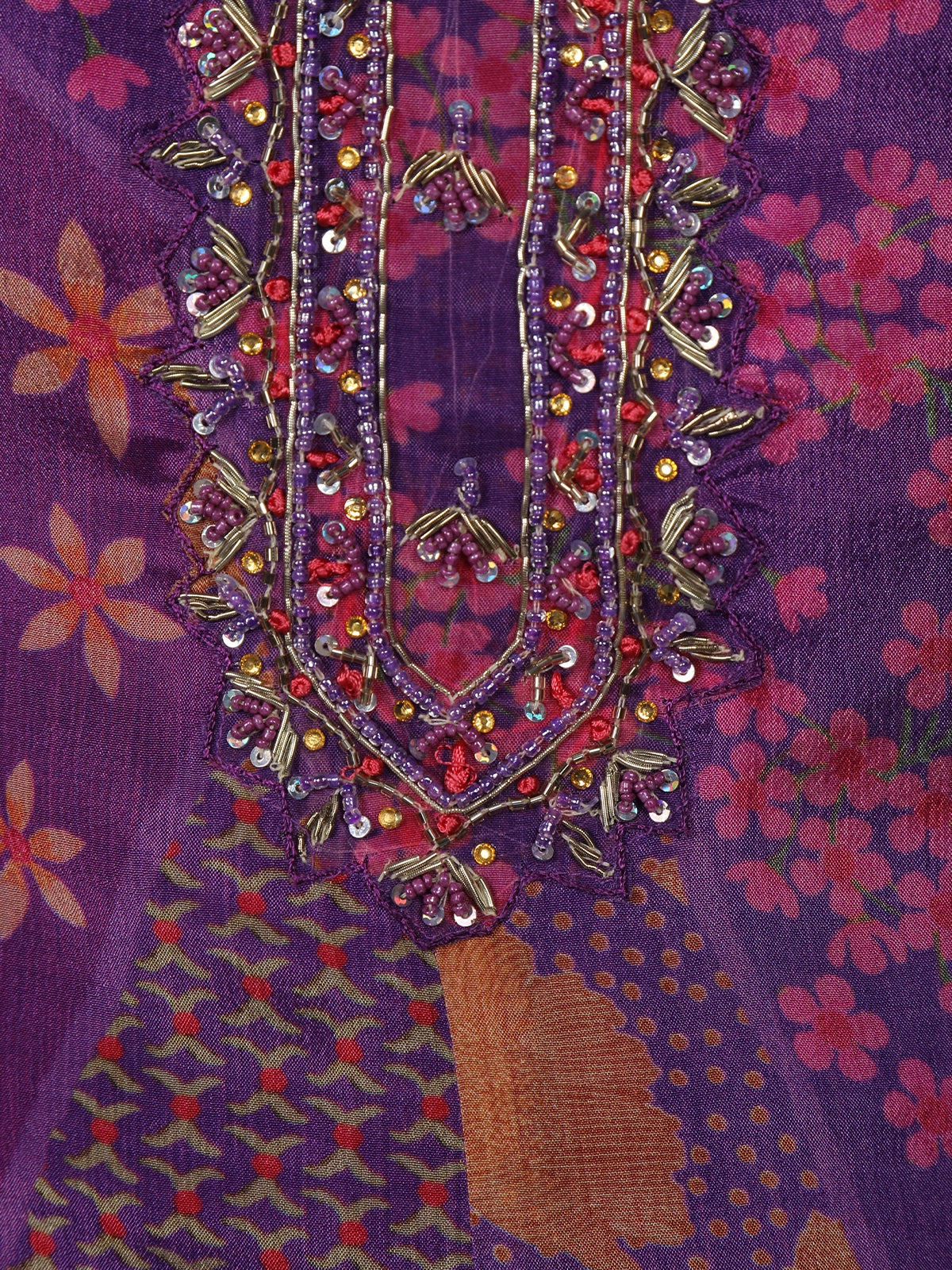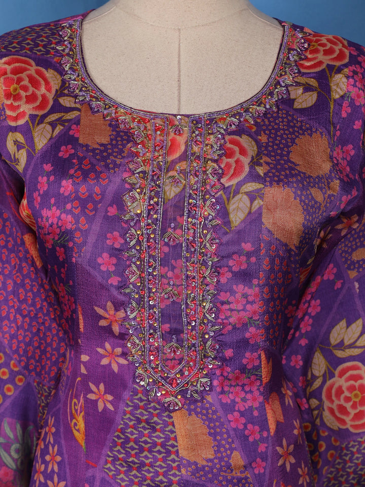 Drape yourself in the vibrance of tradition and style with this Purple Floral Printed Crepe Silk Palazzo Suit. The kurta features a delightful mix of floral and geometric motifs in shades of red, orange, and mustard on a royal purple base, creating a striking tapestry of colors. The round neckline is beautifully embellished with intricate bead, sequin, and thread embroidery, adding a shimmering charm to the ensemble.