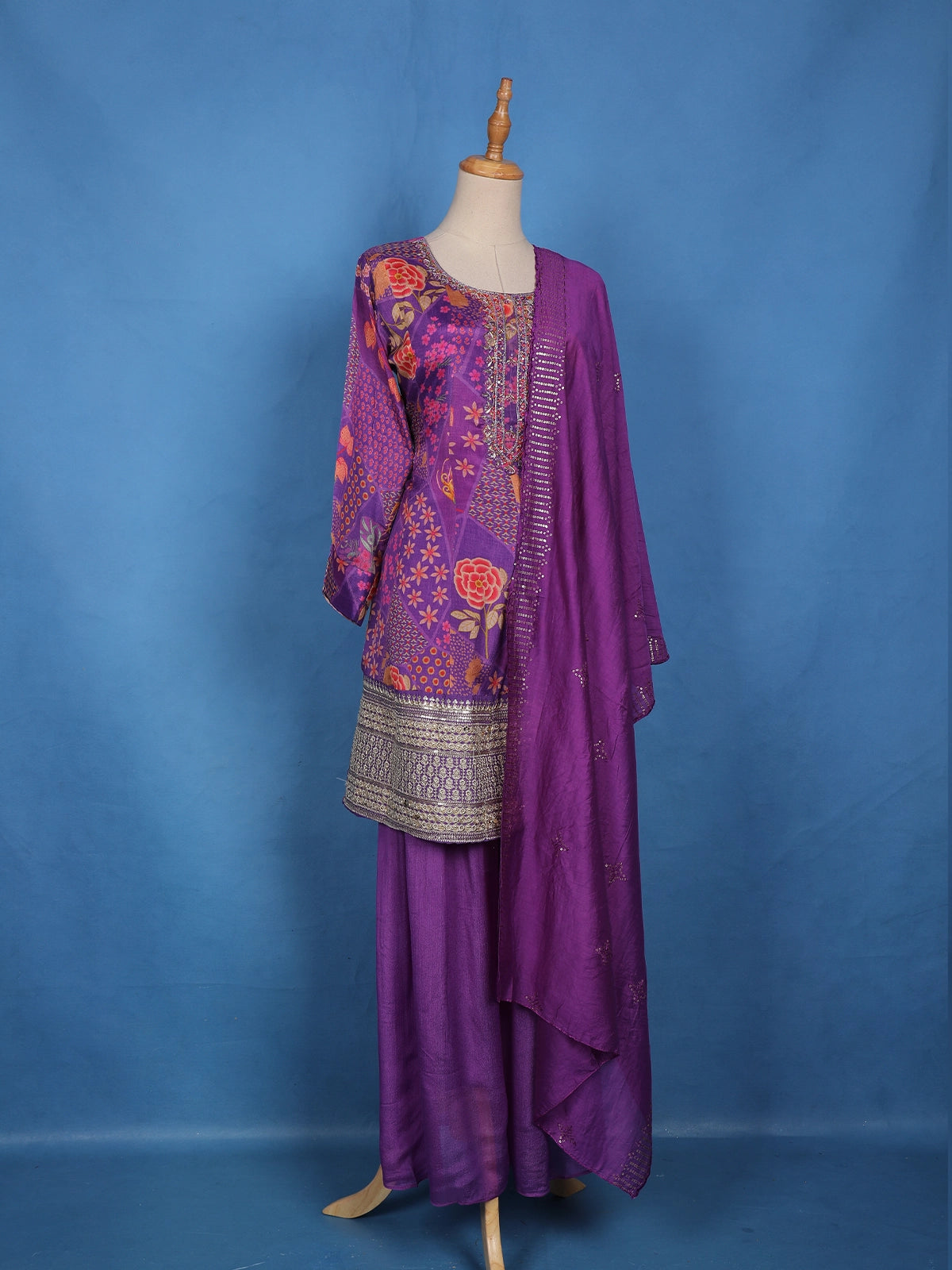 The flowing silk palazzo complements the kurta’s elegance, while the solid purple dupatta is accentuated with subtle mirror and thread work, enhancing its festive appeal. Perfect for festive gatherings, celebrations, or evening events, this ensemble blends heritage aesthetics with contemporary comfort.