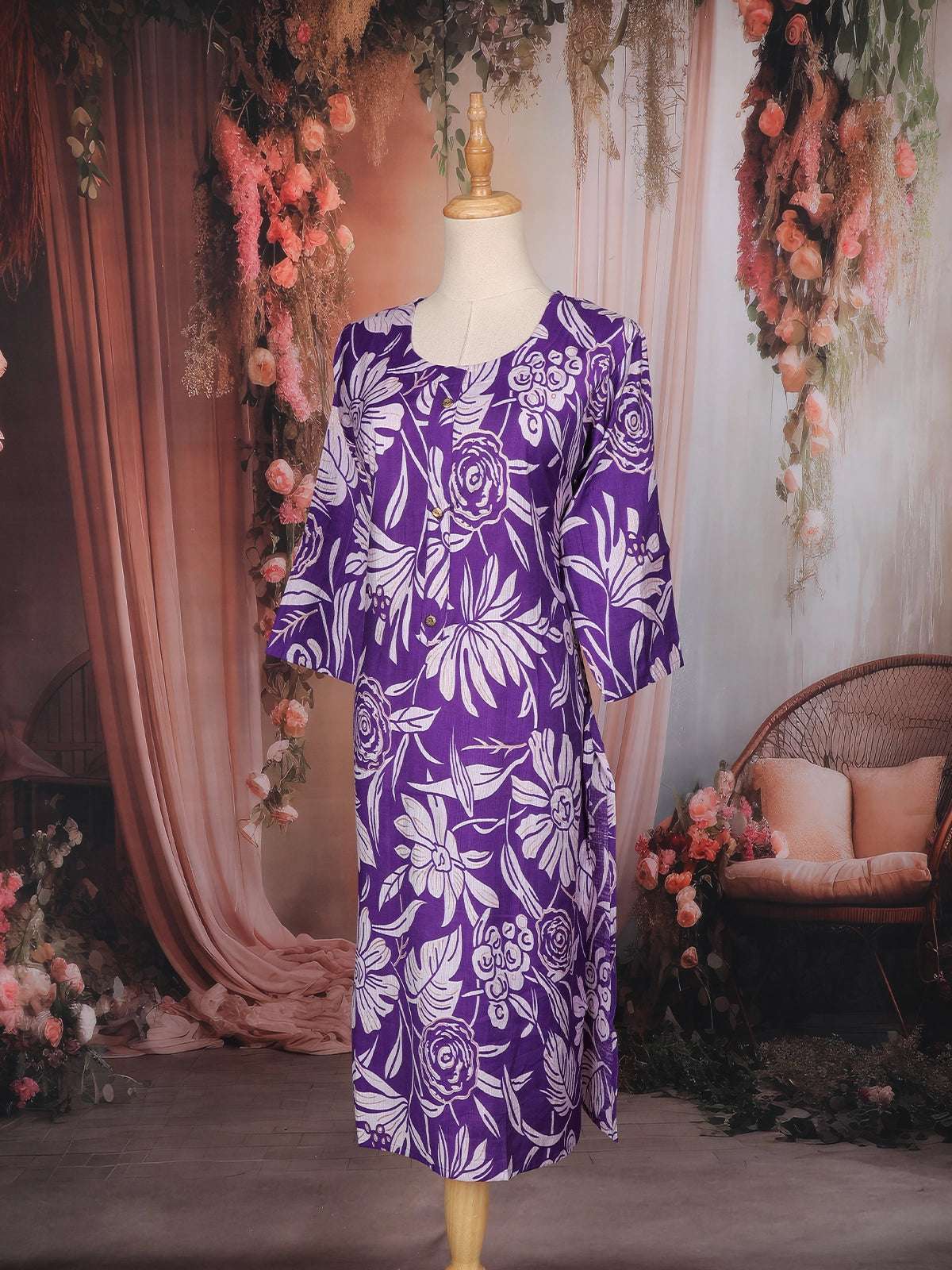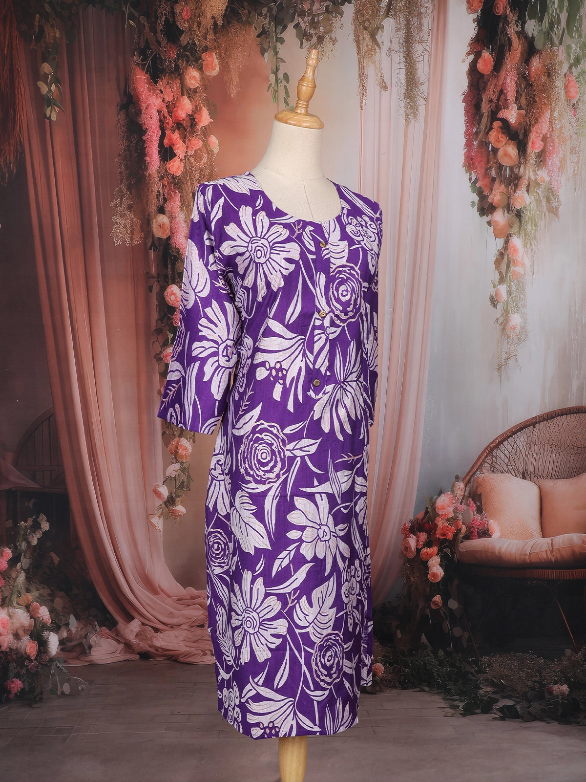 Elevate your everyday ethnic charm with this Purple Floral Printed Cotton Kurti, crafted for effortless style and breathable comfort. The kurti features a bold white floral print that beautifully contrasts against the rich purple backdrop, adding a refreshing and confident appeal to your casual wardrobe.