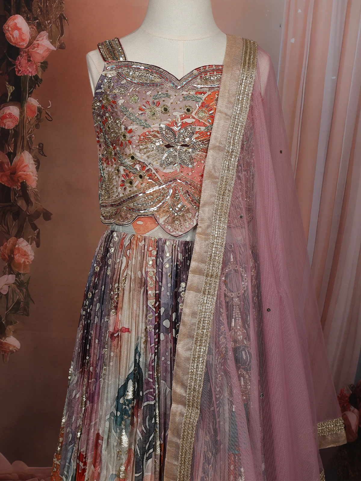 Add a touch of sparkle to your little one’s festive wardrobe with this charming purple kids lehenga, highlighted by delicate floral patterns and shimmering sequin embellishments. Crafted from lightweight georgette fabric, the lehenga flows gracefully while ensuring all-day comfort during celebrations.