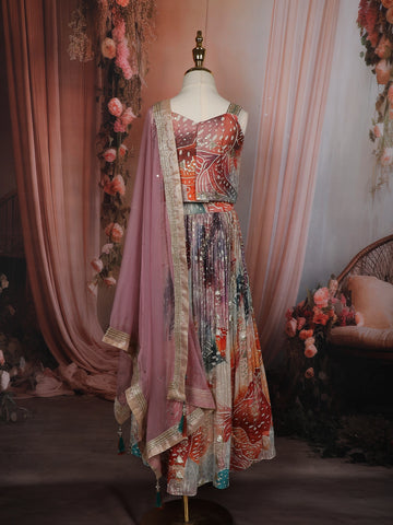 The sleeveless blouse features a stylish sweetheart neckline that enhances the outfit with a soft, elegant appeal. Paired with a matching georgette lehenga skirt, the ensemble creates a beautiful festive look, while the coordinated dupatta completes the outfit with a traditional finishing touch.