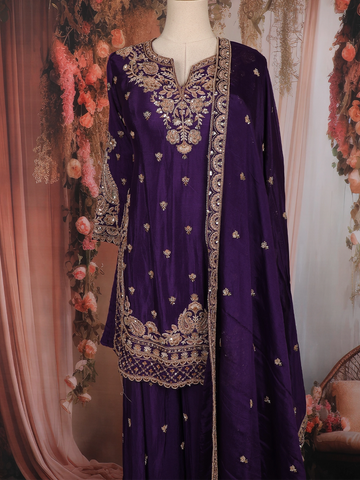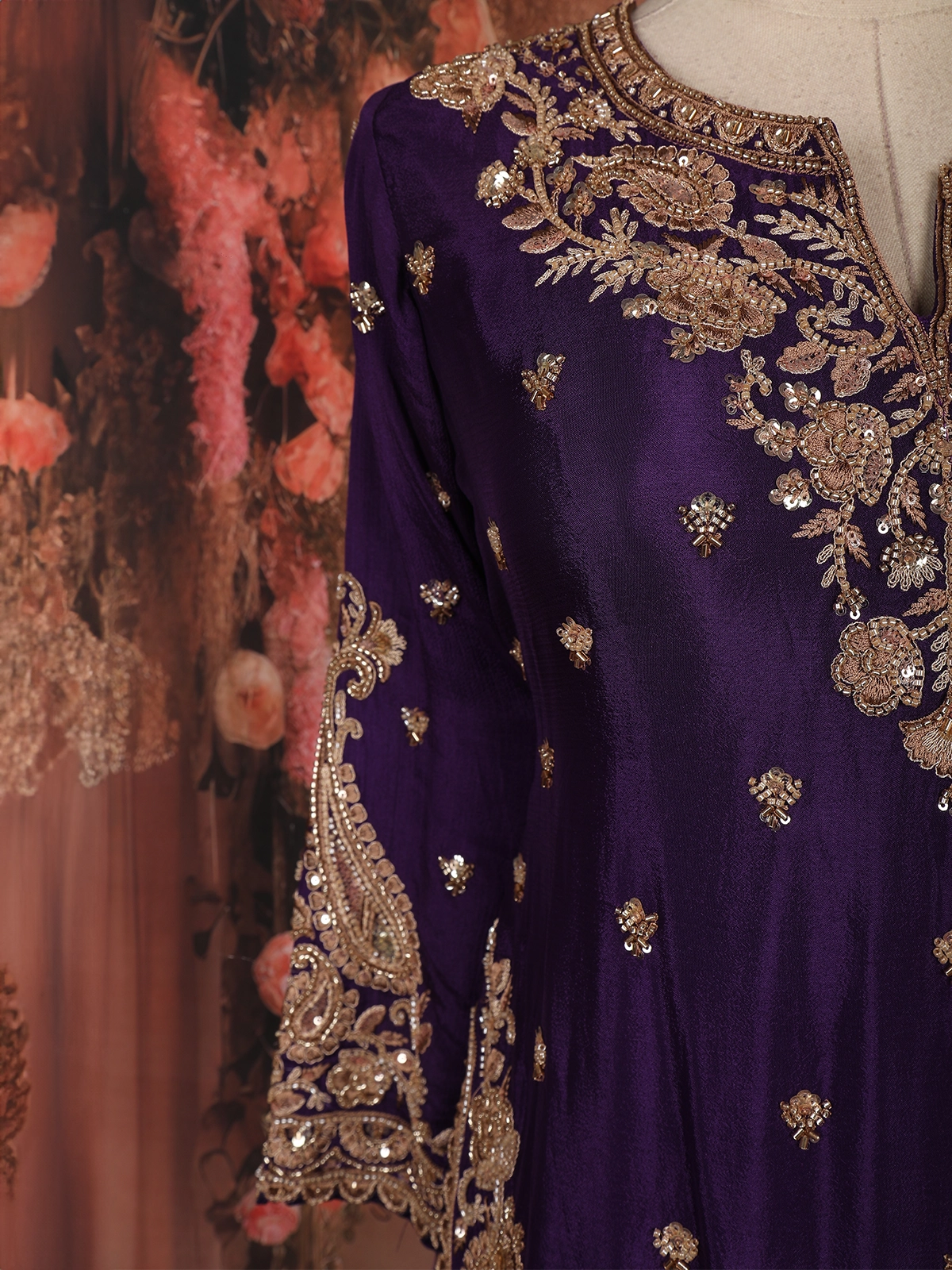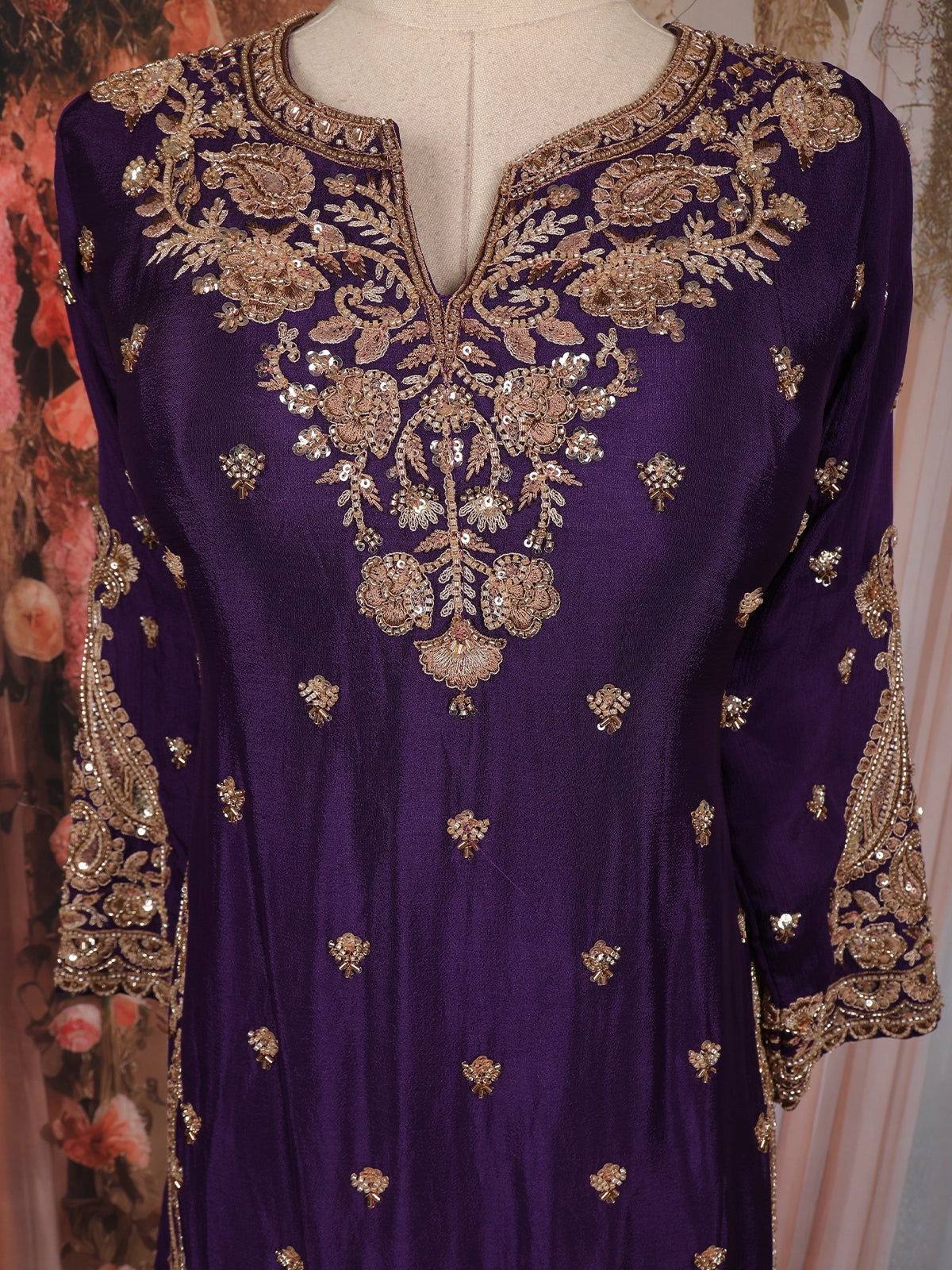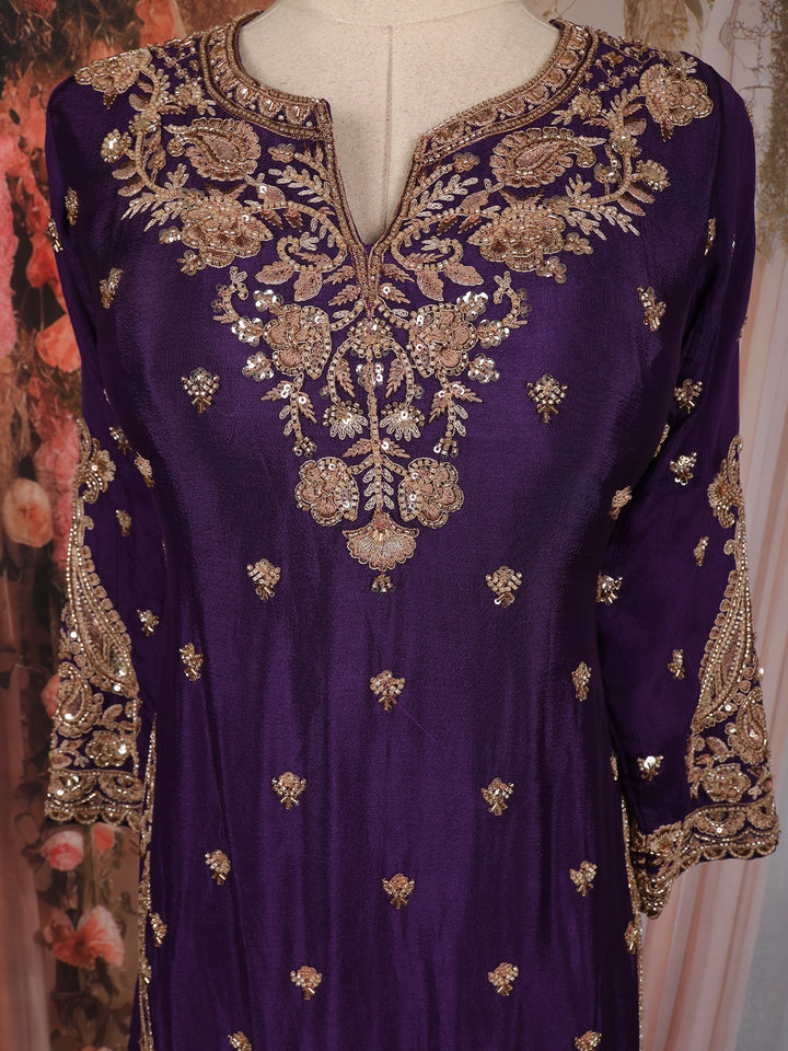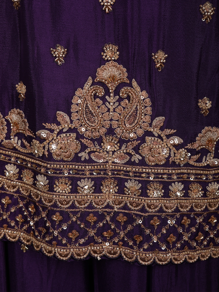 Purple Floral Sequins Embroidered Design Crepe Palazzo Suit