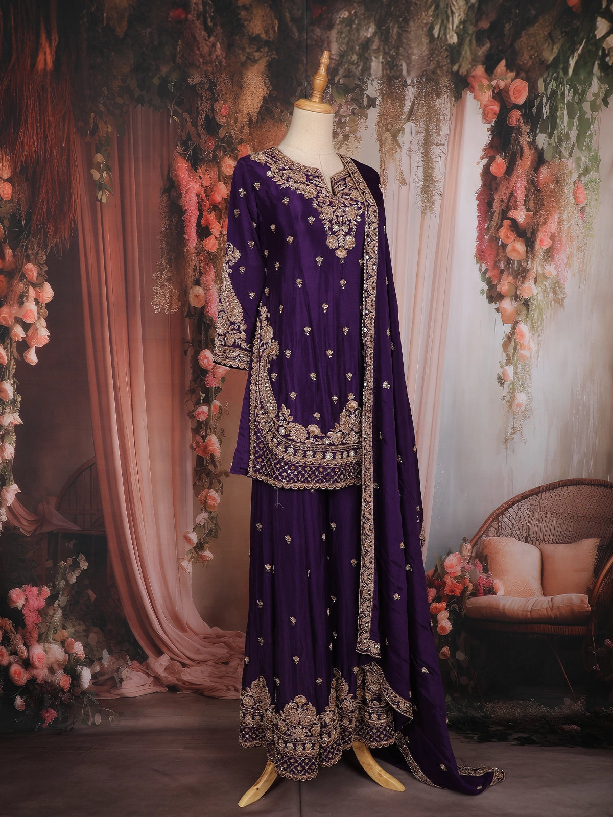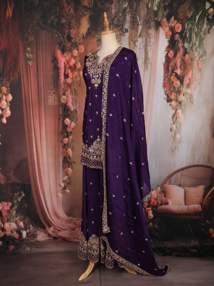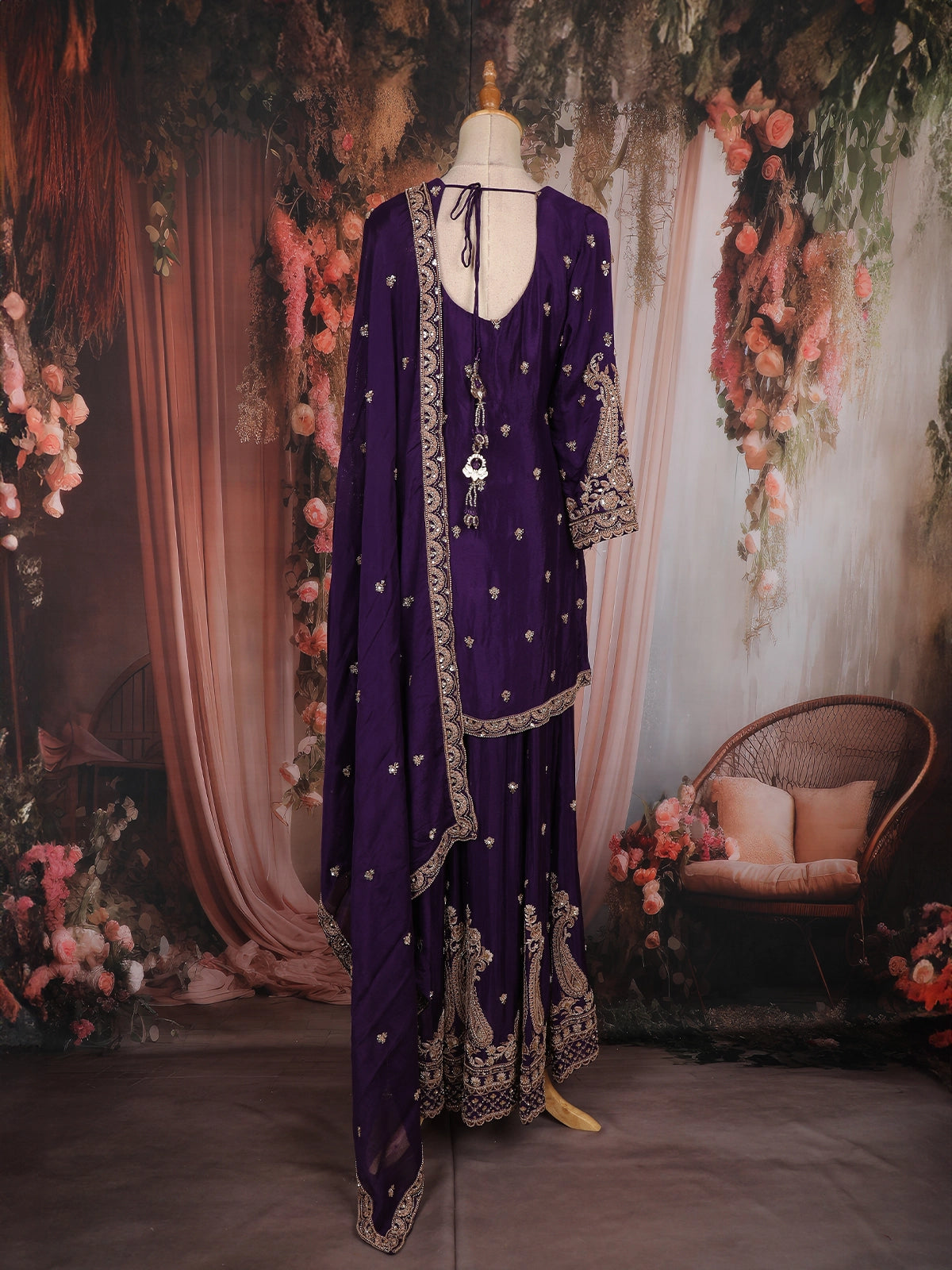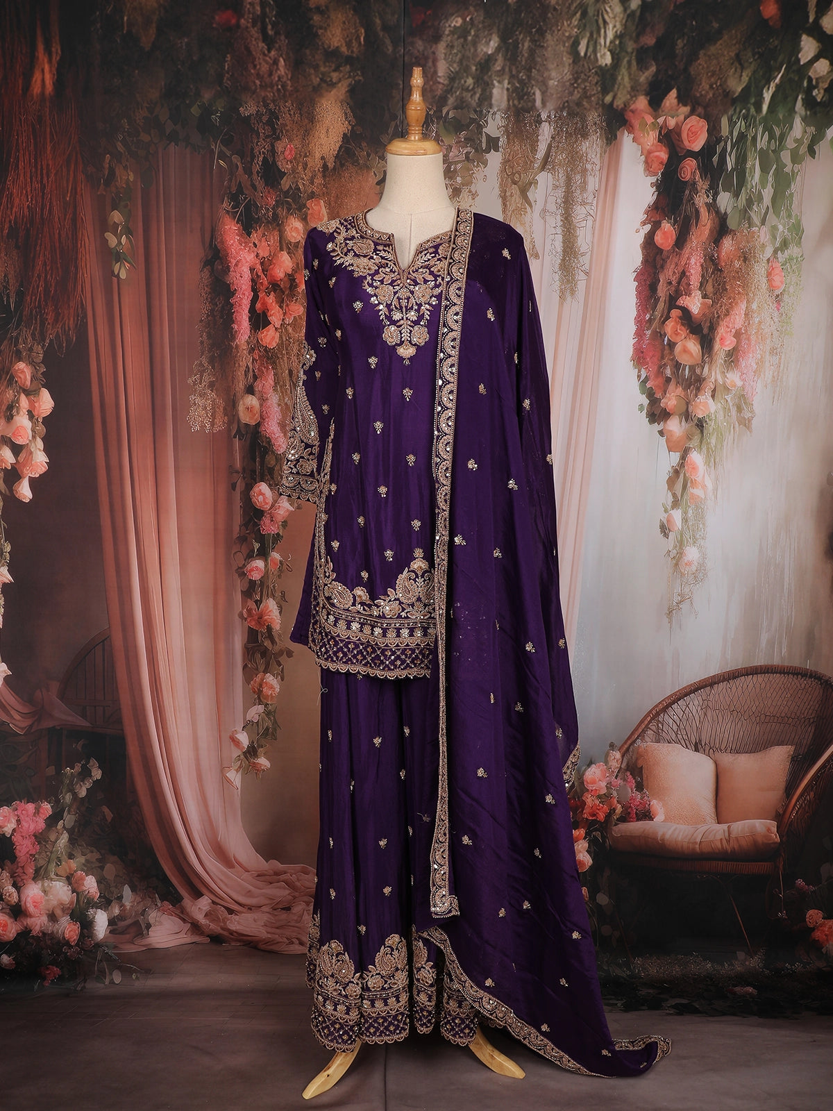 Purple Floral Sequins Embroidered Design Crepe Palazzo Suit