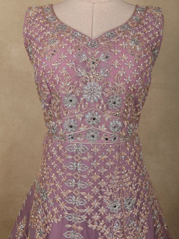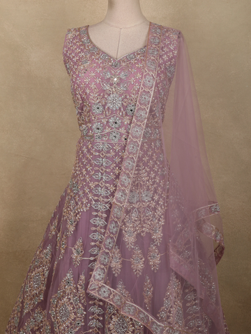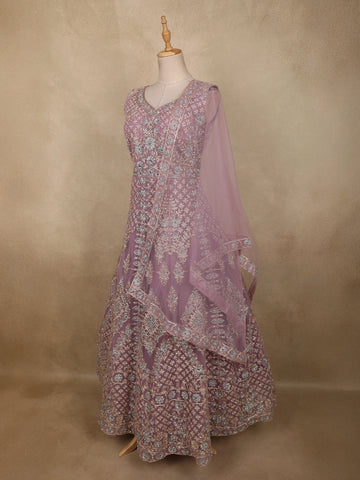 Purple Floral Thread and Mirror Embroidered Design Net Gown with Dupatta