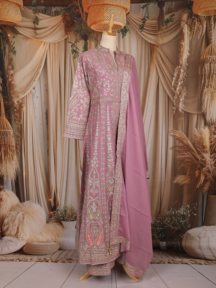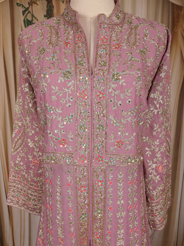 The front-slit Anarkali-style top is tailored in fluid georgette, offering a flattering drape and effortless movement. The mandarin collar neckline combined with detailed yoke and panel embroidery enhances the silhouette elegantly. The full sleeves are adorned with harmonized motifs, completing the look with refined artistry.